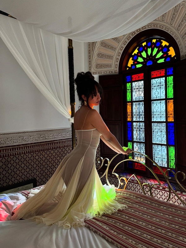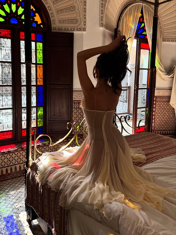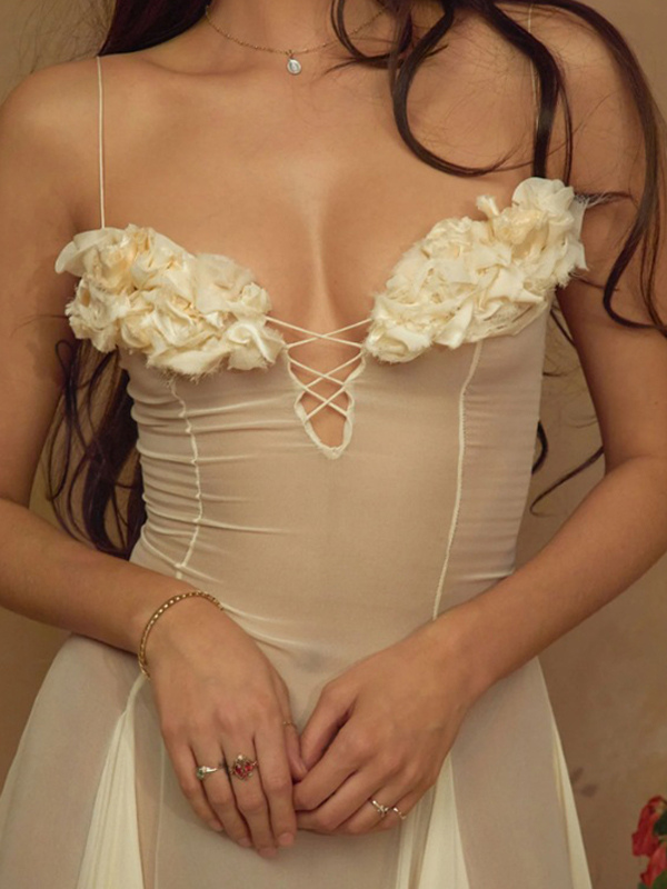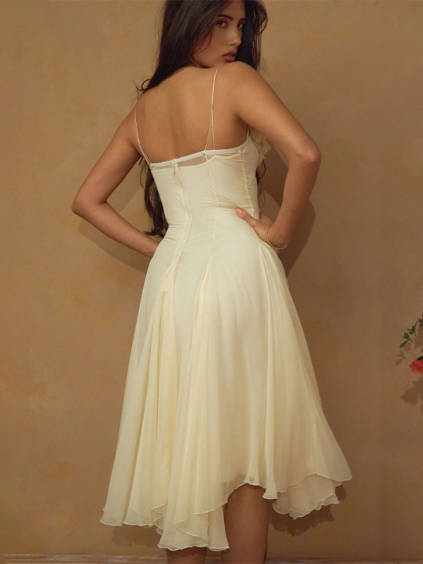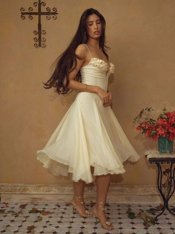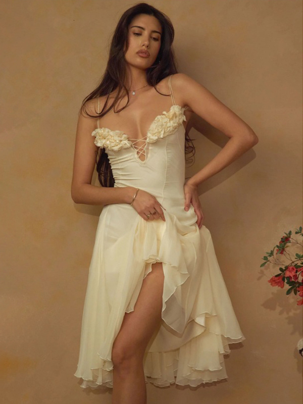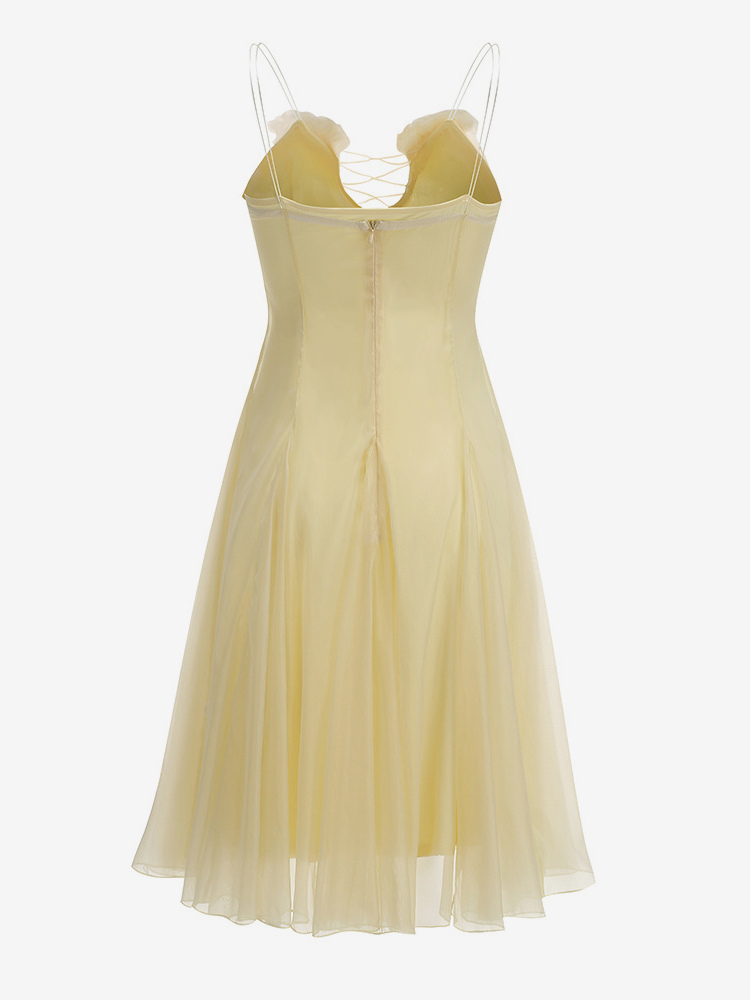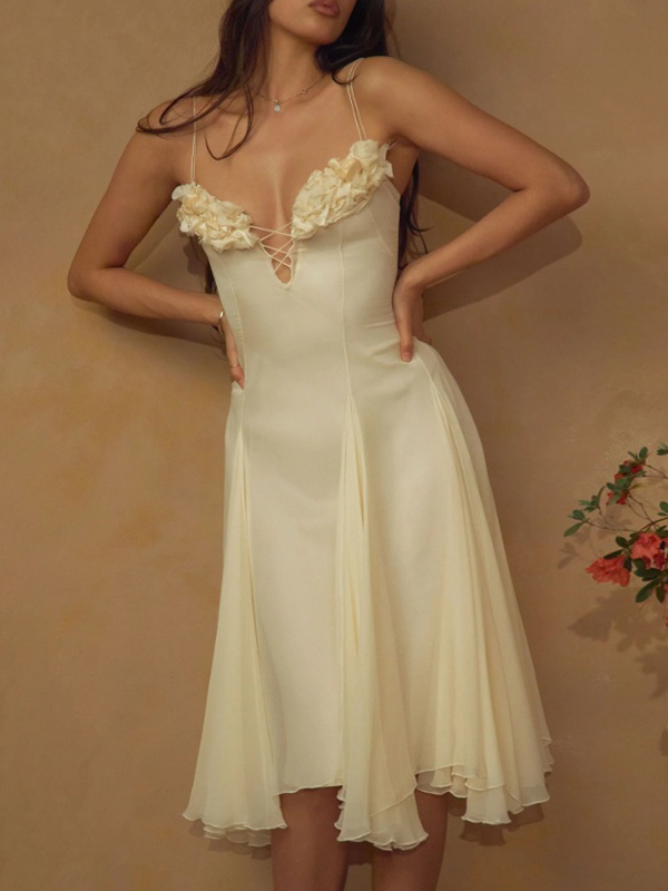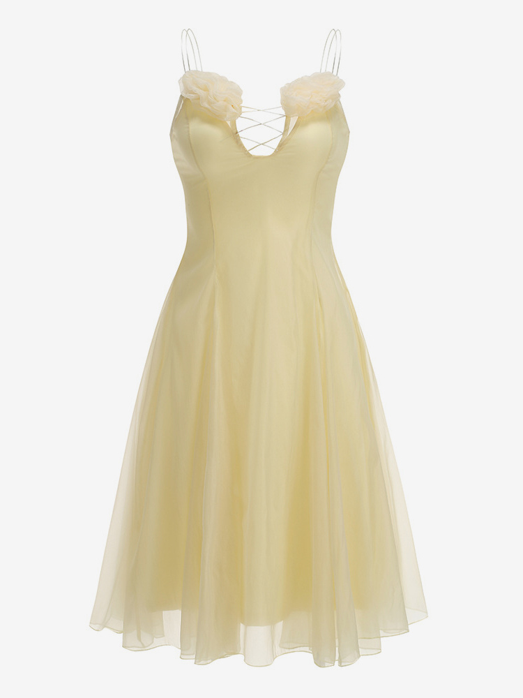 3D花柄Aラインシースルーミディドレス(女性用) - バターイエローフェアリーコアVネックスリップドレス - 夏のビーチデートナイト2026