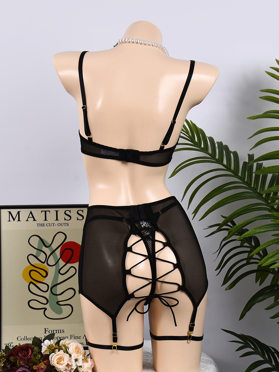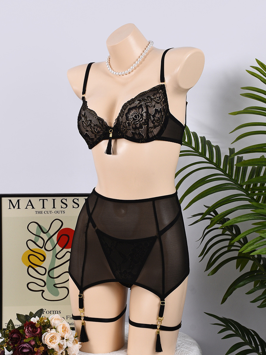 4点ランジェリーセット 刺繍 シースルーレース ブラック ブラ&ショーツセット