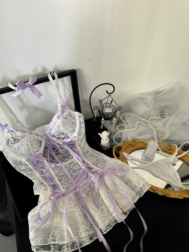 ベビードールランジェリー セクシー ホワイト レース ツートン 透け メッシュ シースルー クラバット パンティ ドレス 3点セット