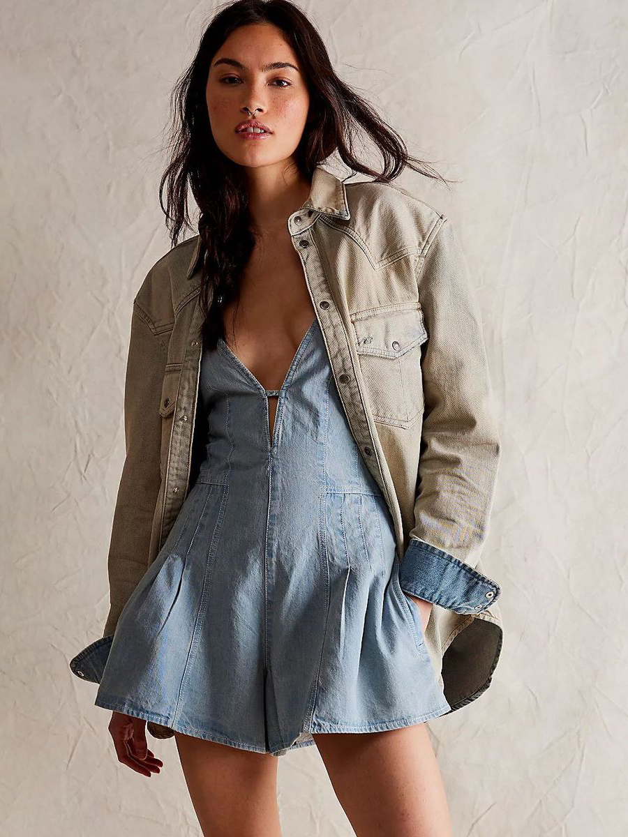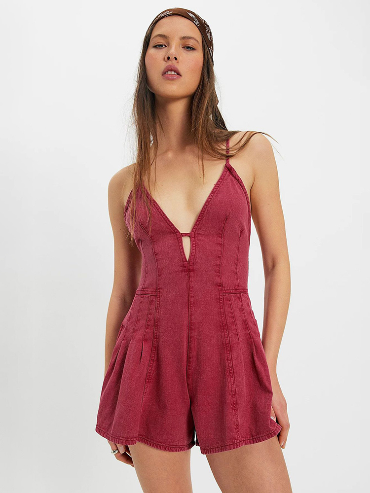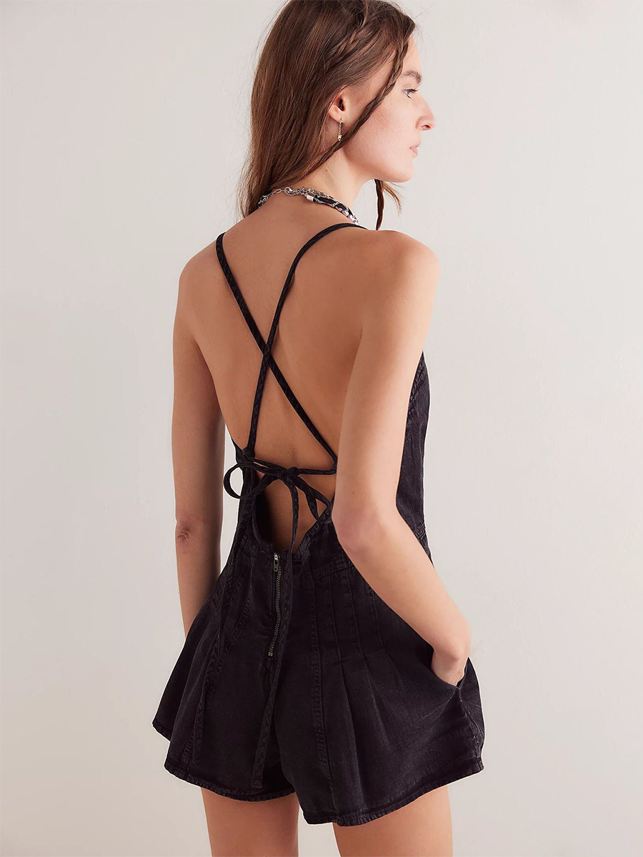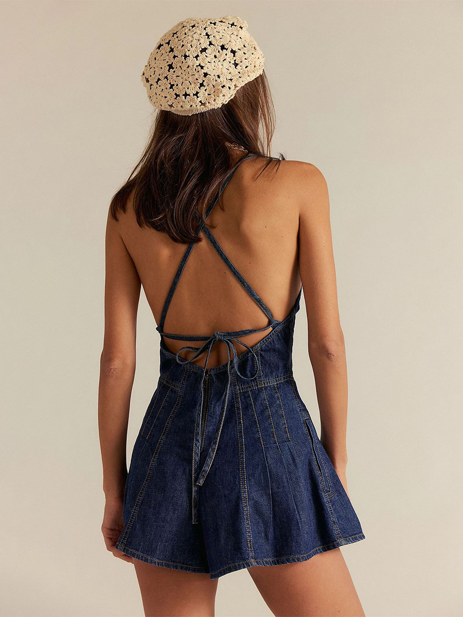背中開きウォッシュドデニムロンパース(レディース) - グランジ風Vネッククロスストラッププレイスーツ(ポケット付き) - サマーミュージックフェスティバル2026