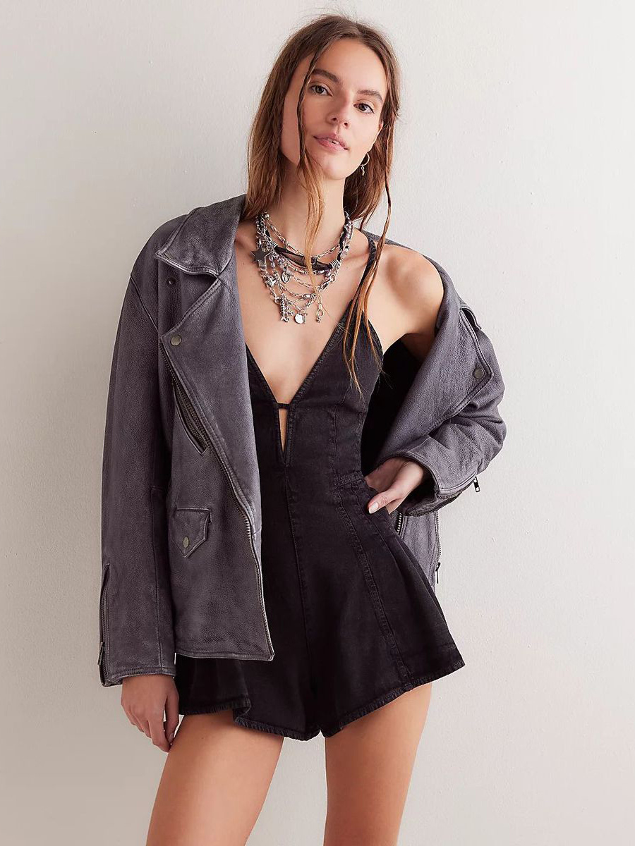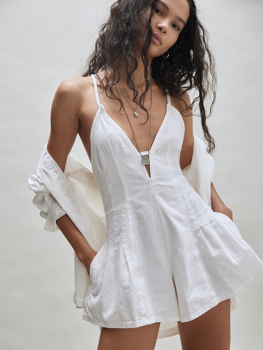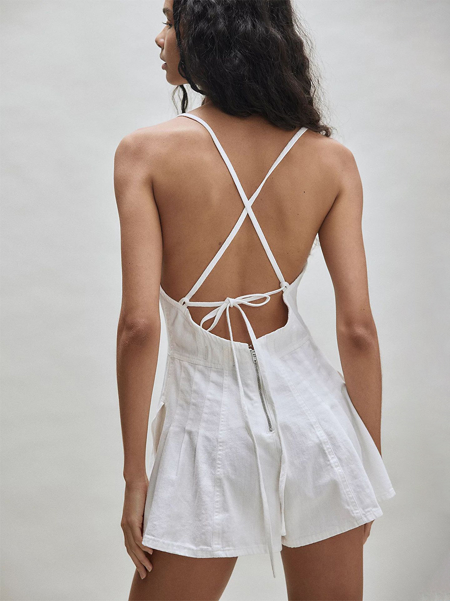 背中開きウォッシュドデニムロンパース(レディース) - グランジ風Vネッククロスストラッププレイスーツ(ポケット付き) - サマーミュージックフェスティバル2026