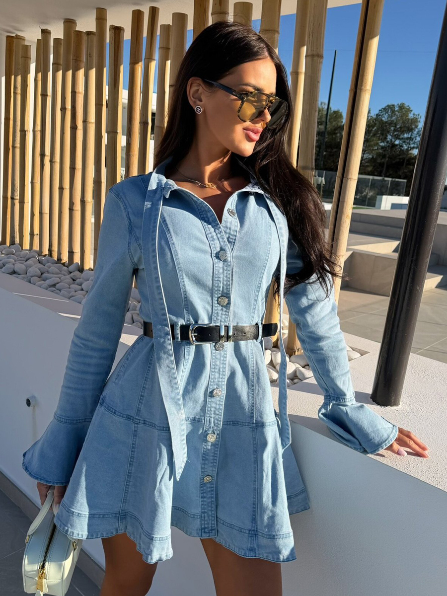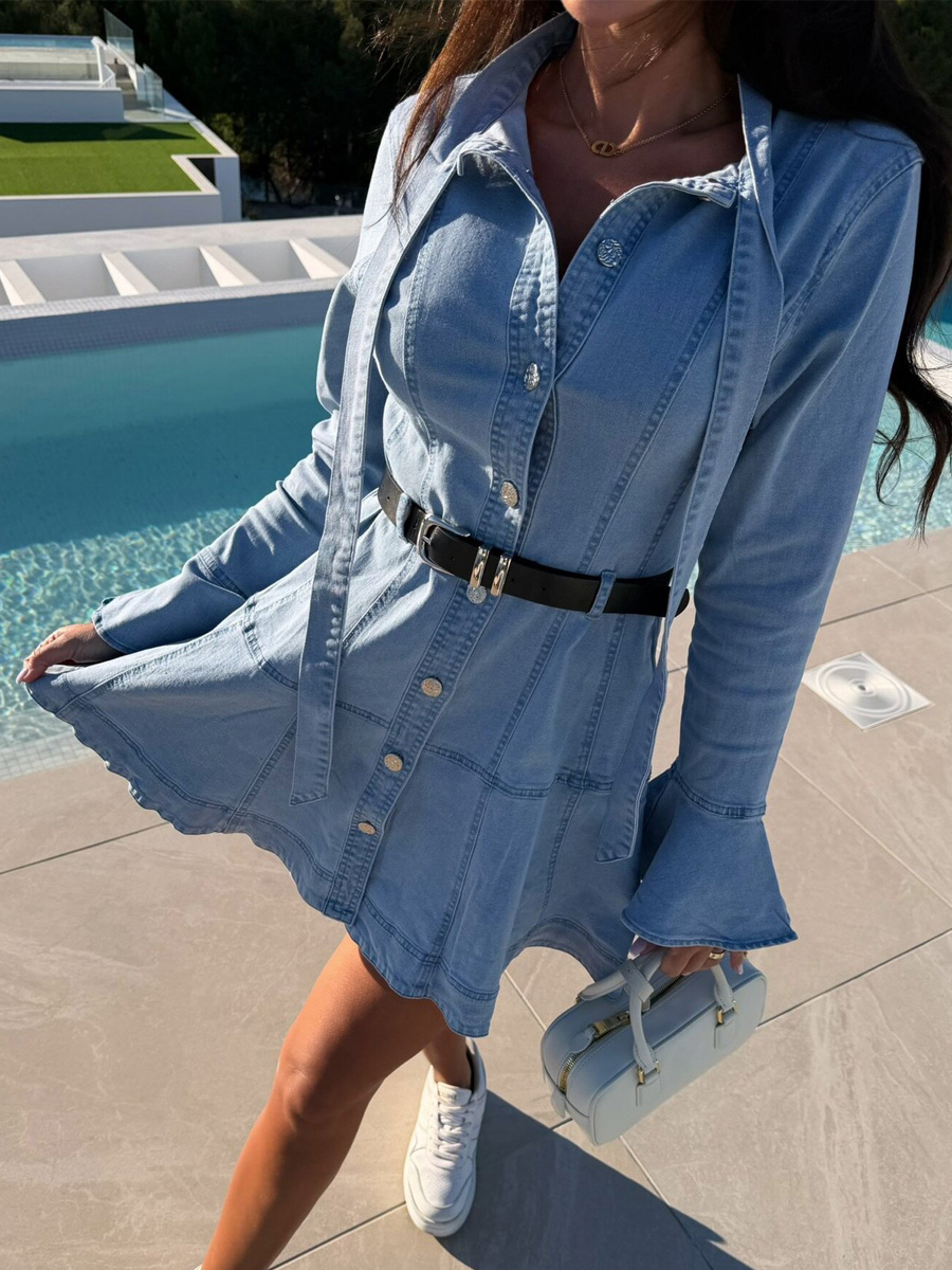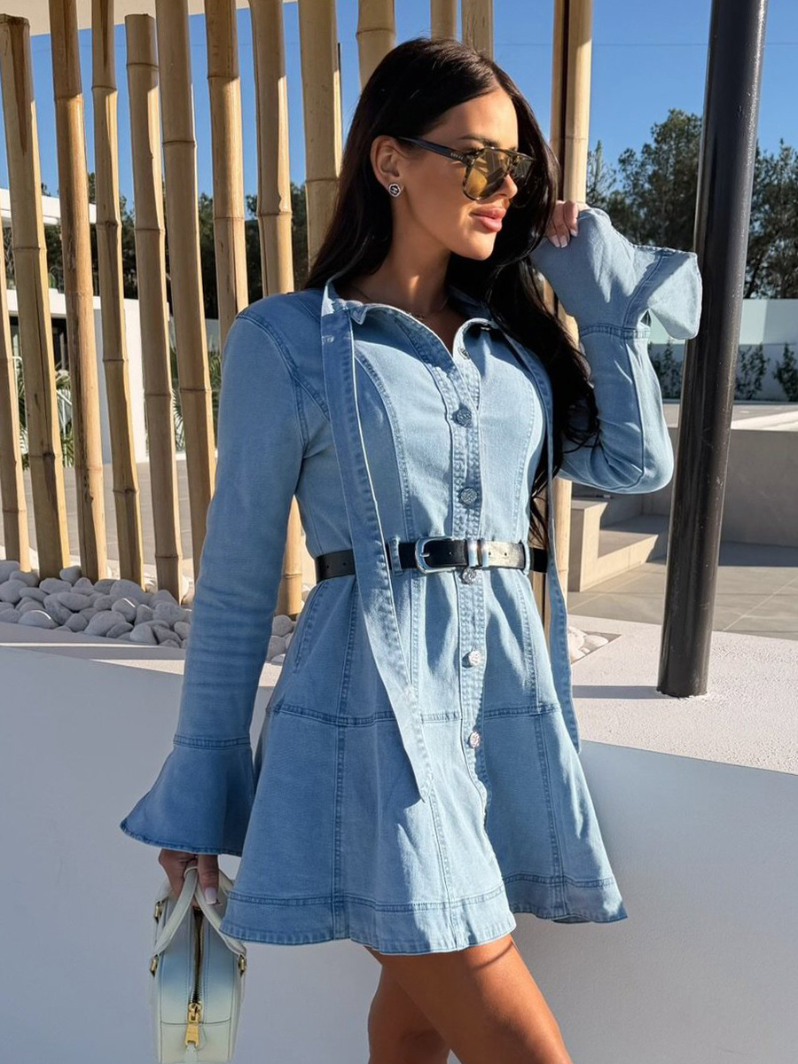 レディース用ベルスリーブミニデニムドレス - ライトブルーフレアカフボタンダウンベルト付きジーンズシャツドレス - 春のデイリーカジュアル2026
