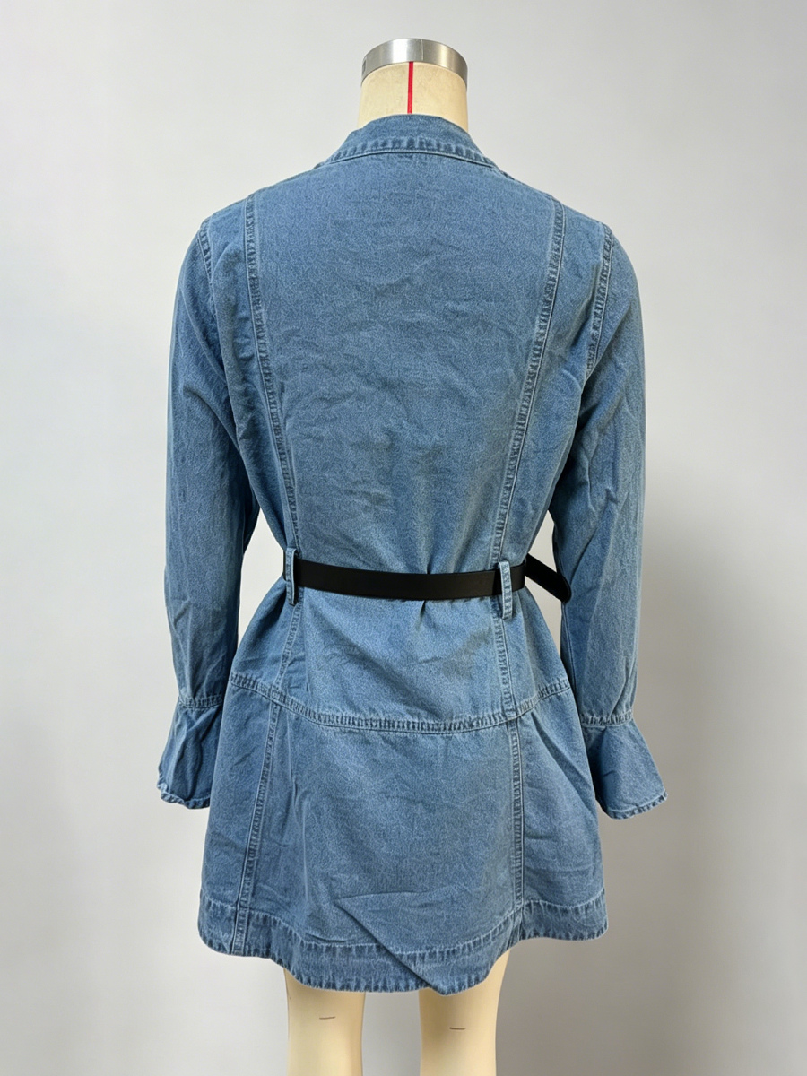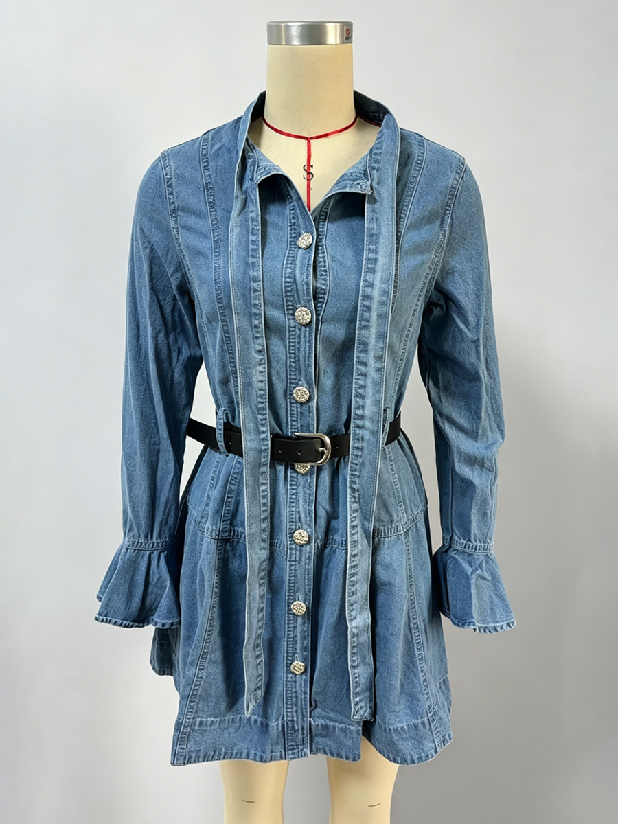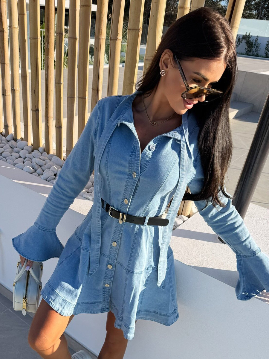 レディース用ベルスリーブミニデニムドレス - ライトブルーフレアカフボタンダウンベルト付きジーンズシャツドレス - 春のデイリーカジュアル2026
