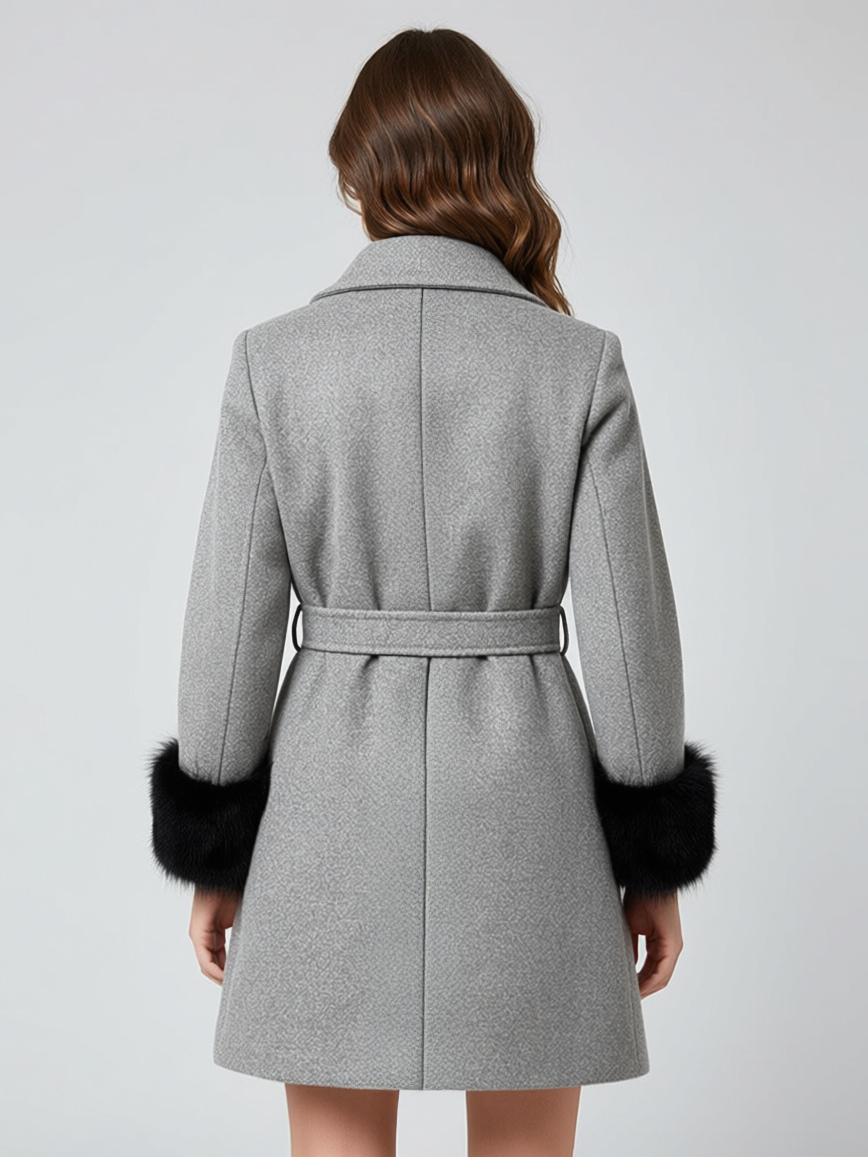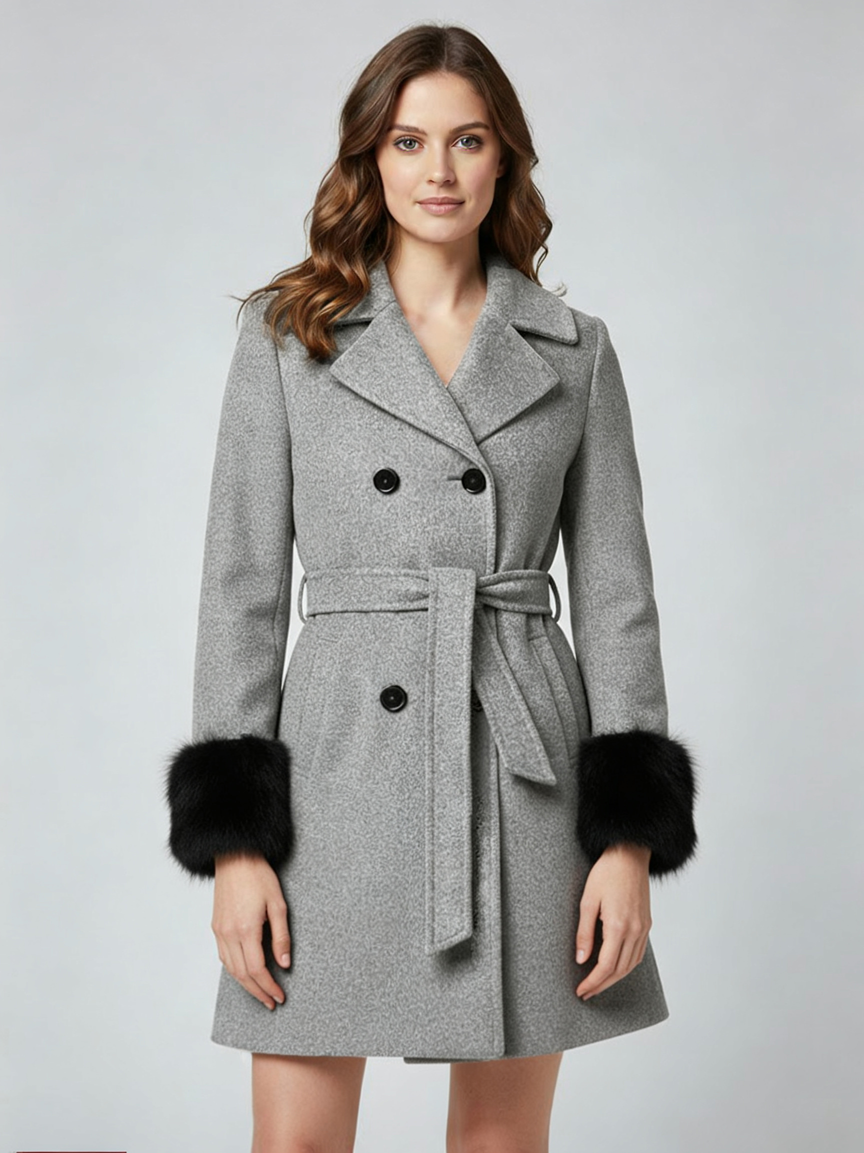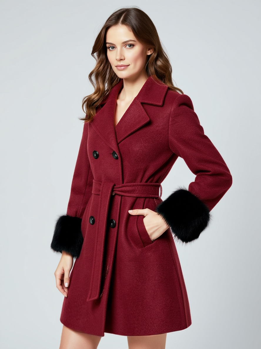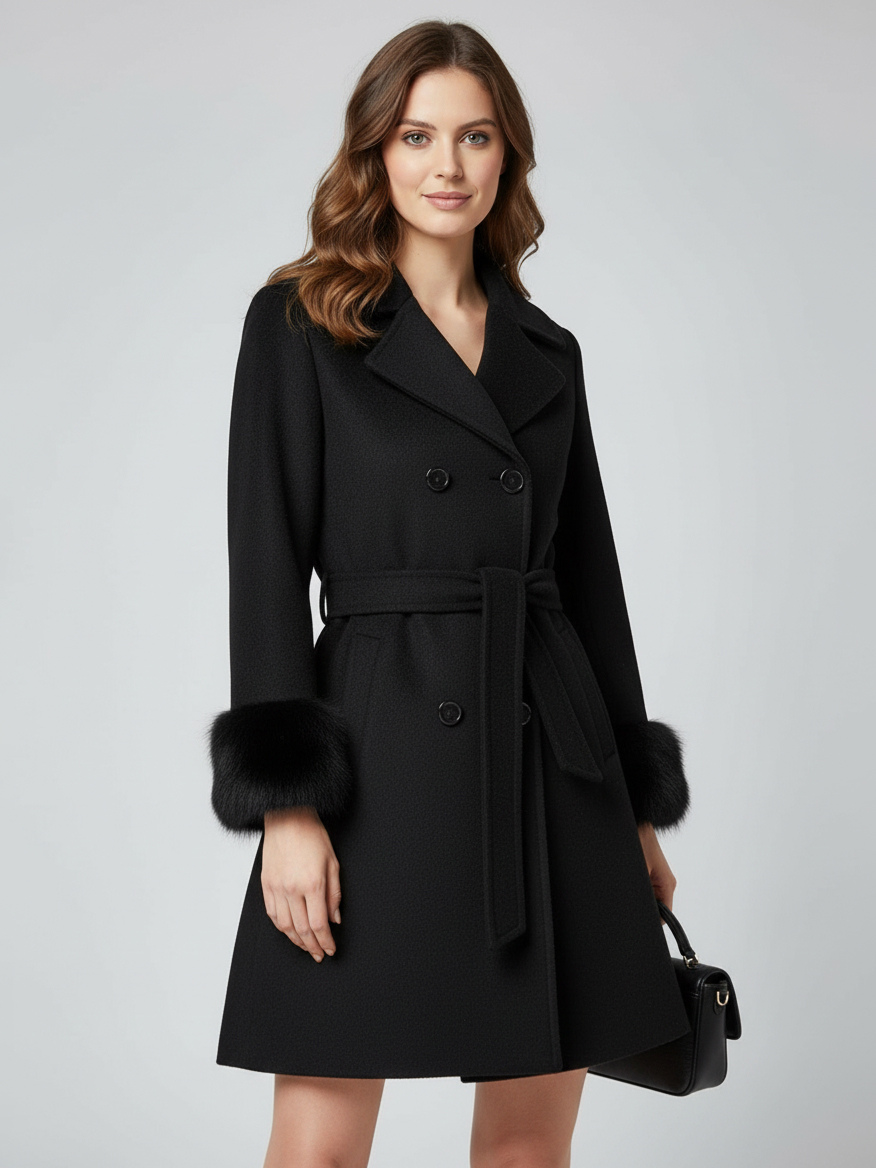 ベルト付きダブルブレストウールブレンドコート、ワイドラペル、ブラックフェイクファーカフス 2025