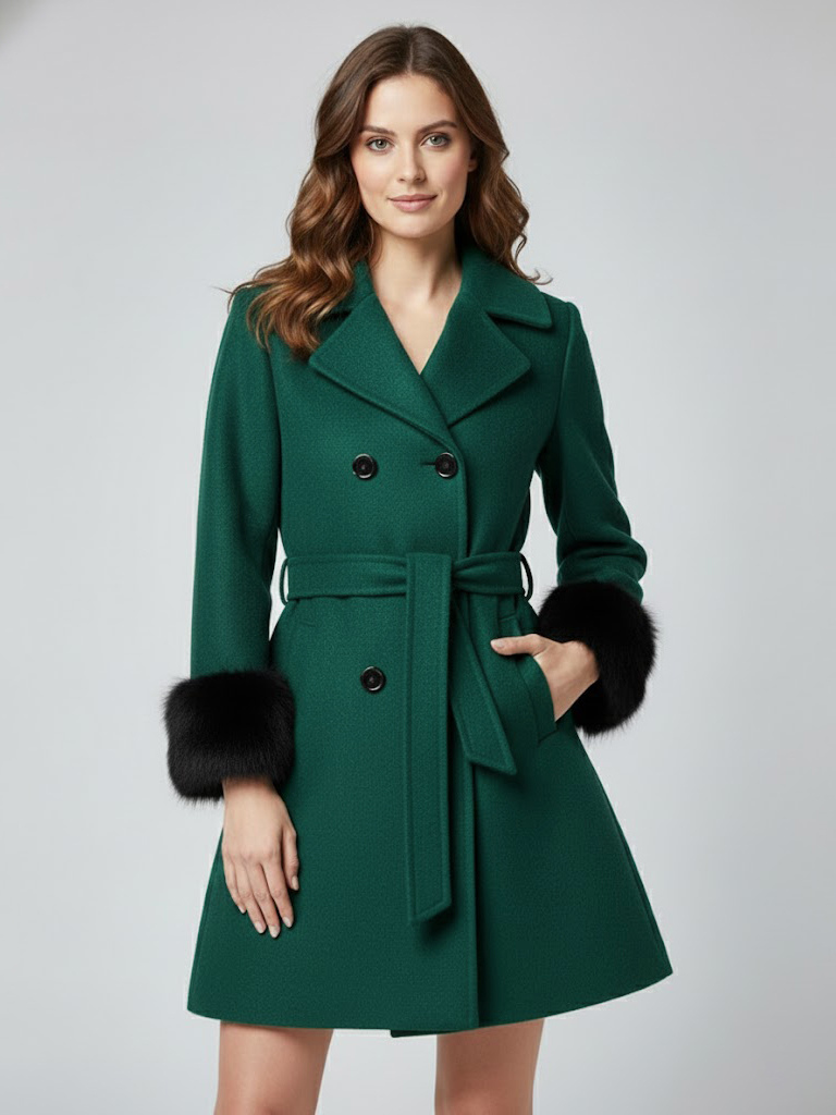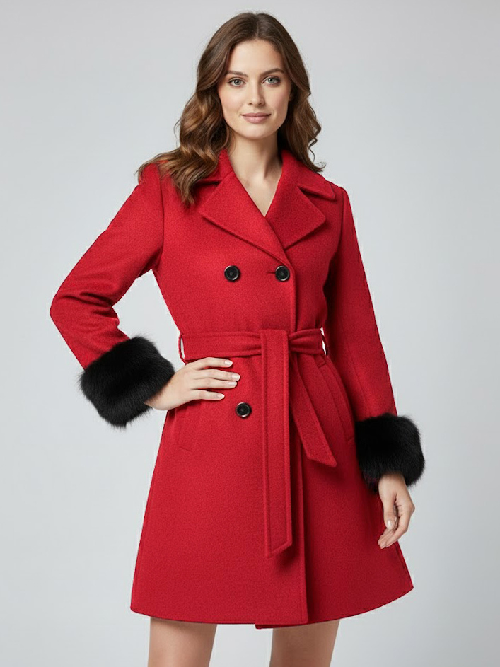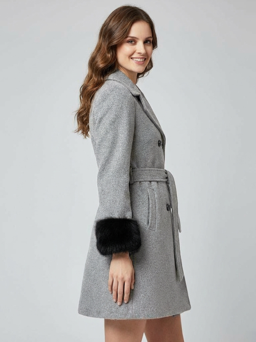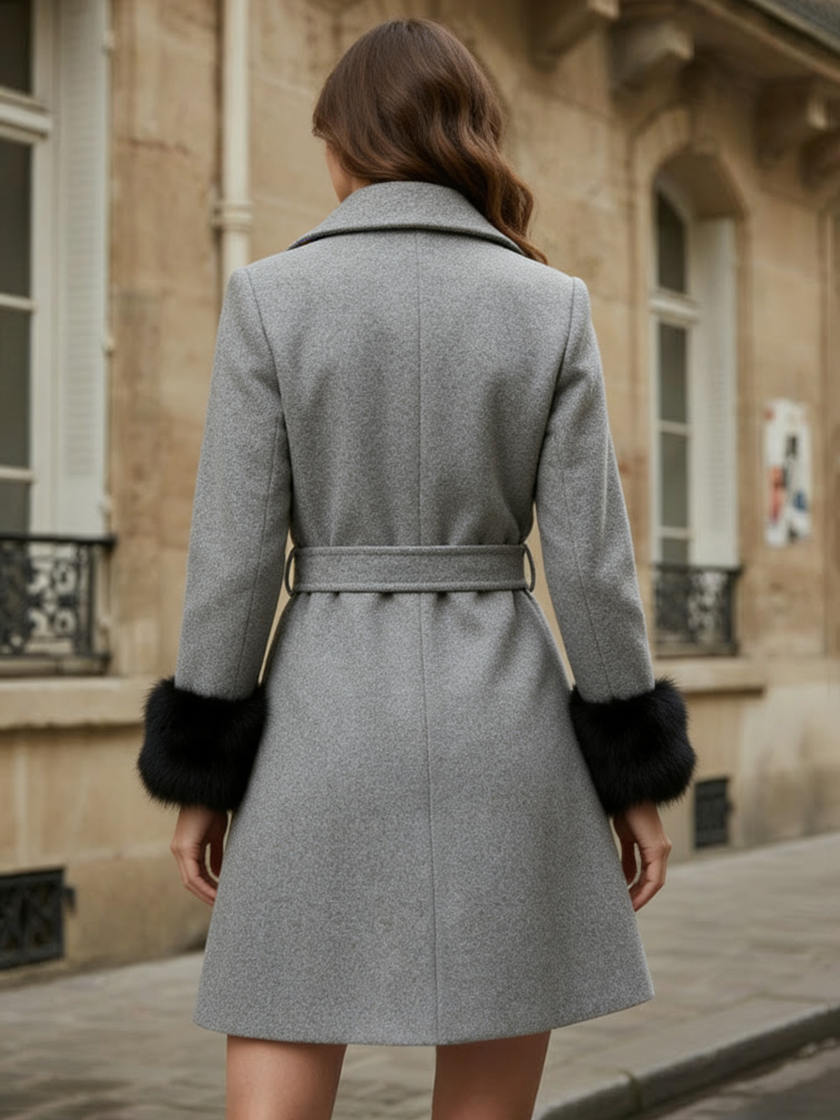 ベルト付きダブルブレストウールブレンドコート、ワイドラペル、ブラックフェイクファーカフス 2025
