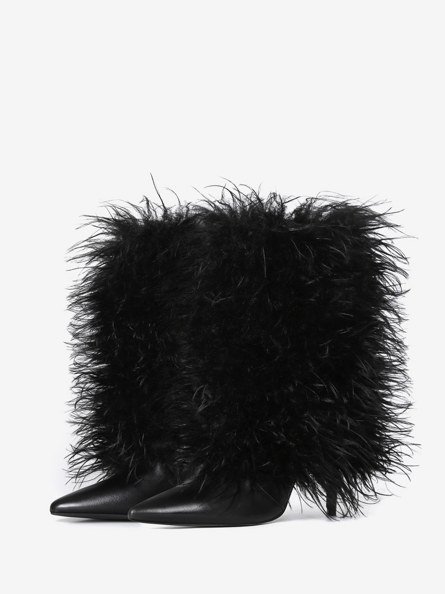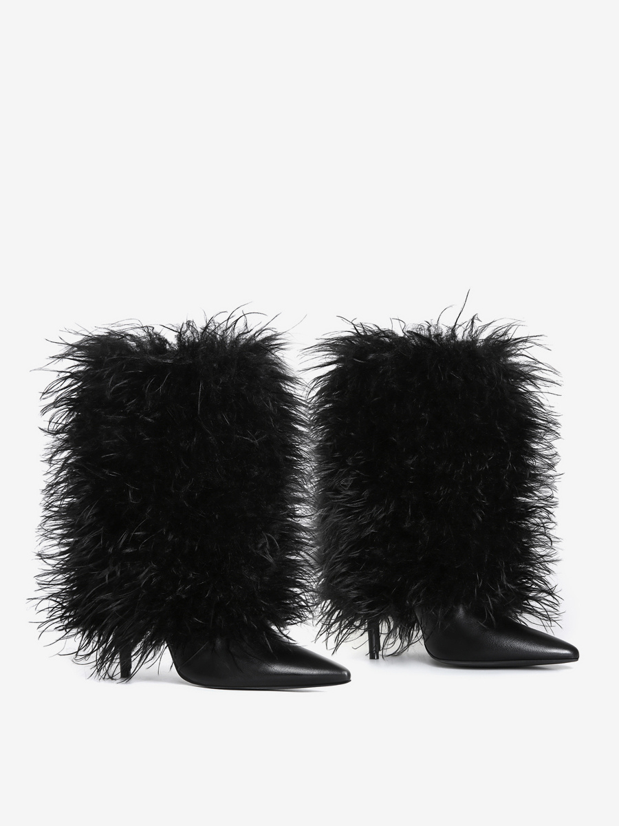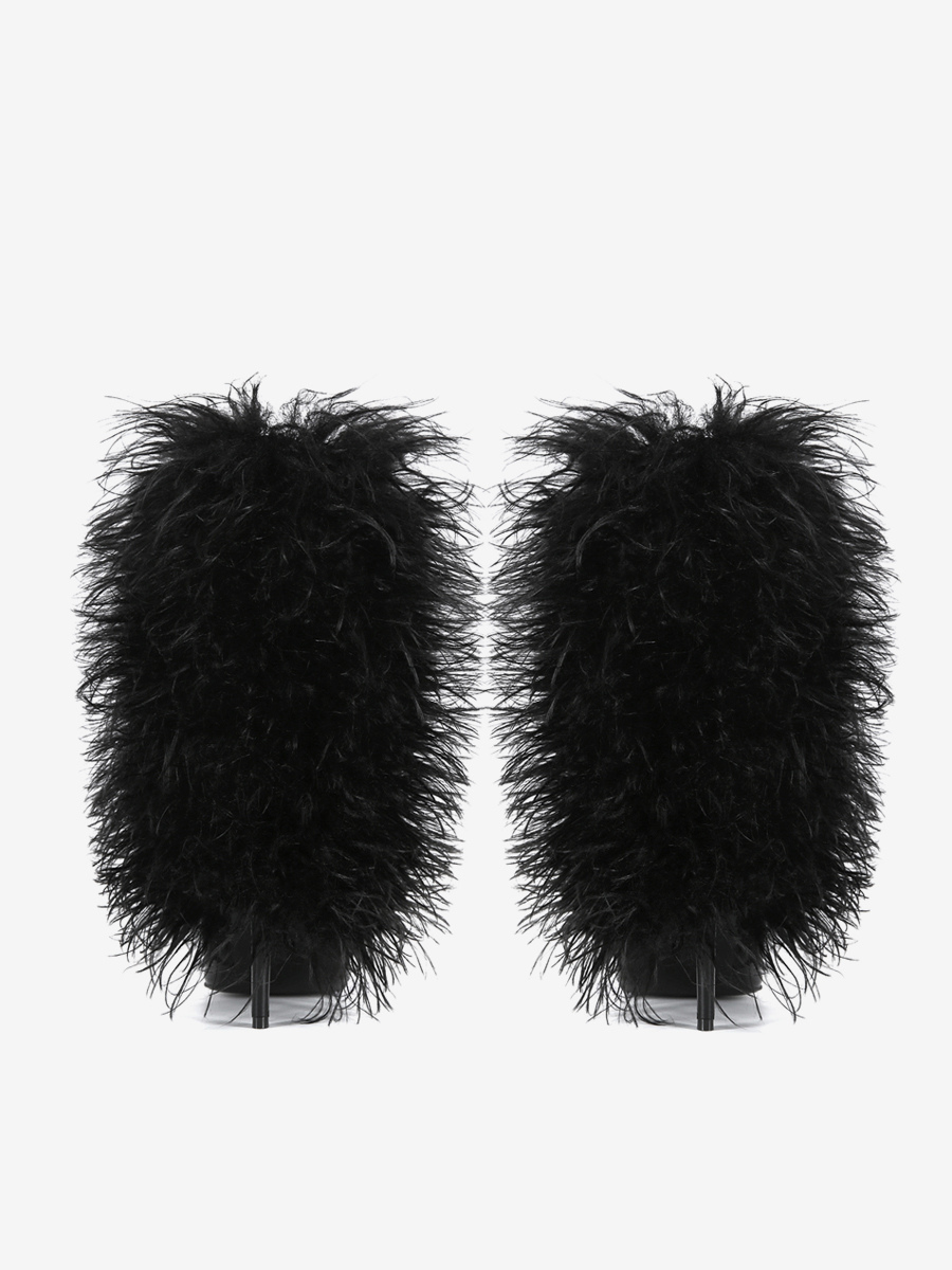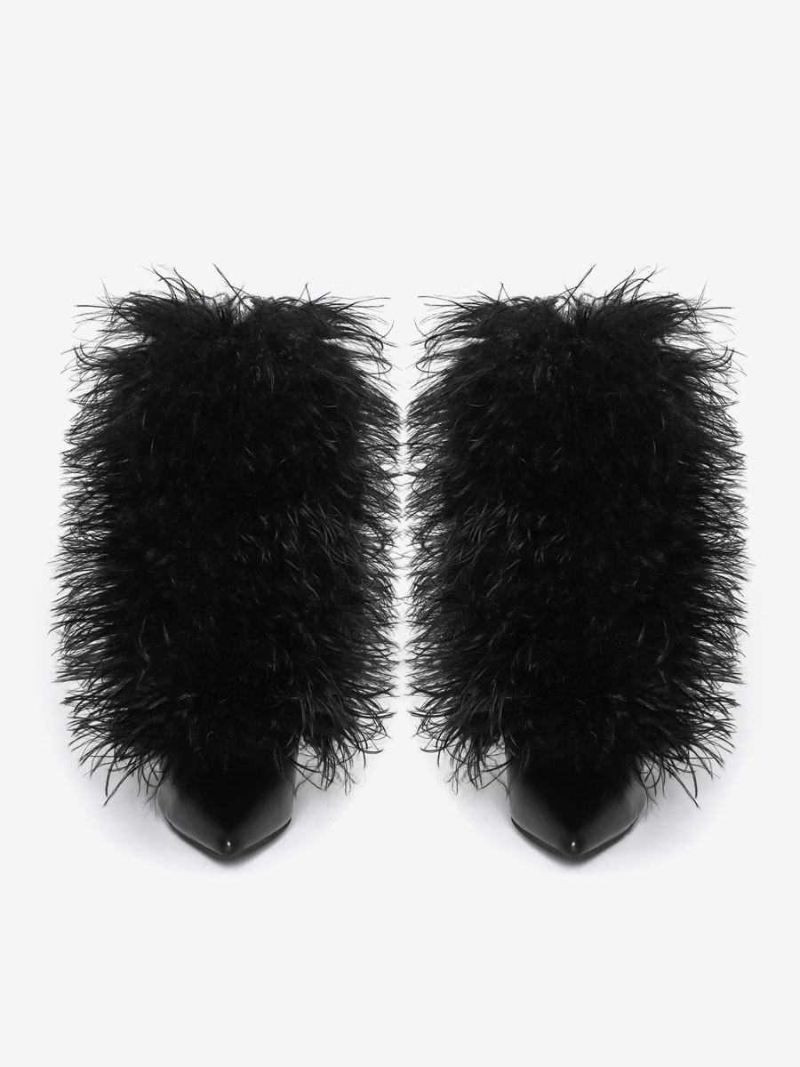 レディース ブラック アンクルブーツ フェイクフェザー ポインテッドトゥ ハイヒール ブーティ