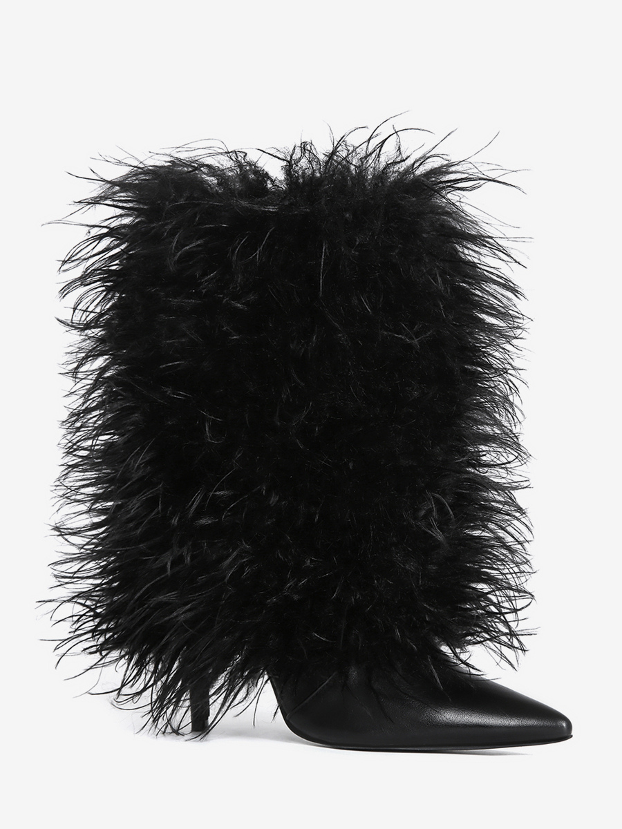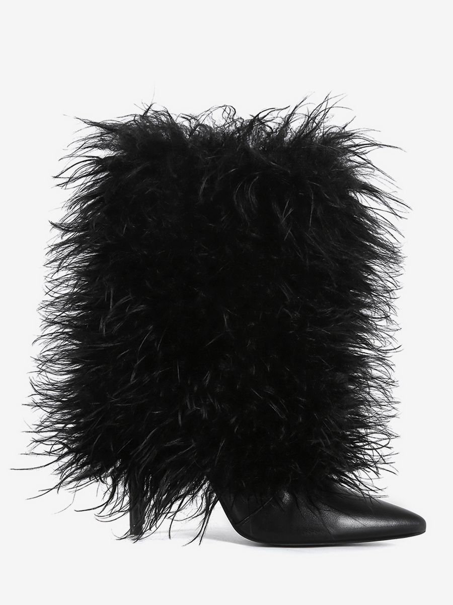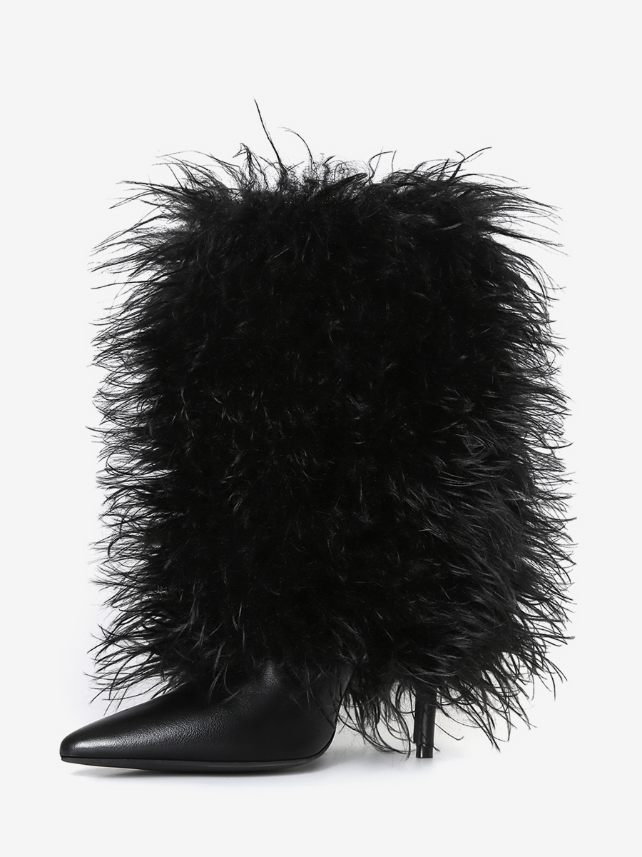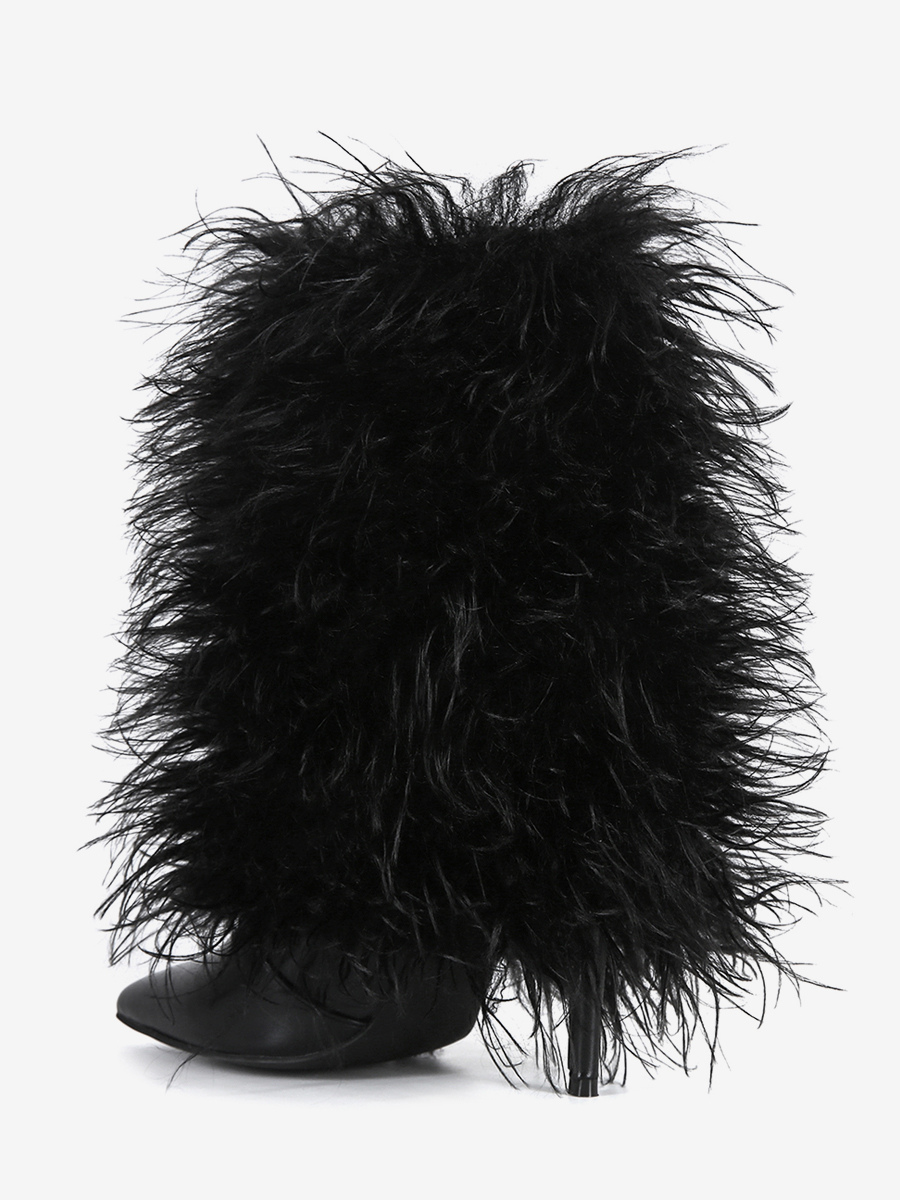 レディース ブラック アンクルブーツ フェイクフェザー ポインテッドトゥ ハイヒール ブーティ