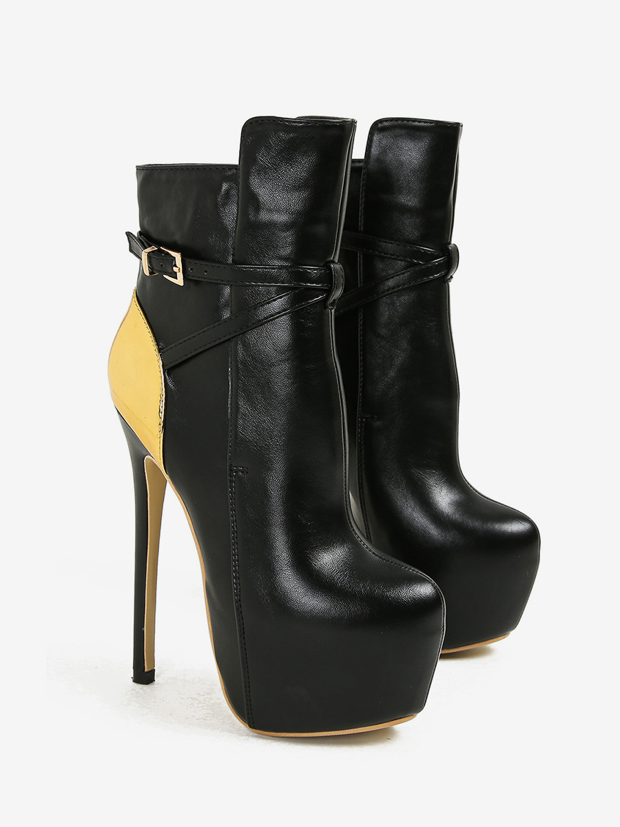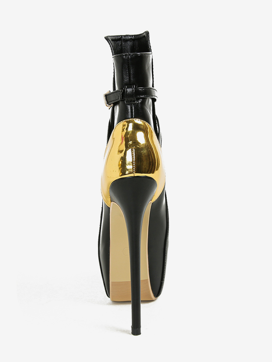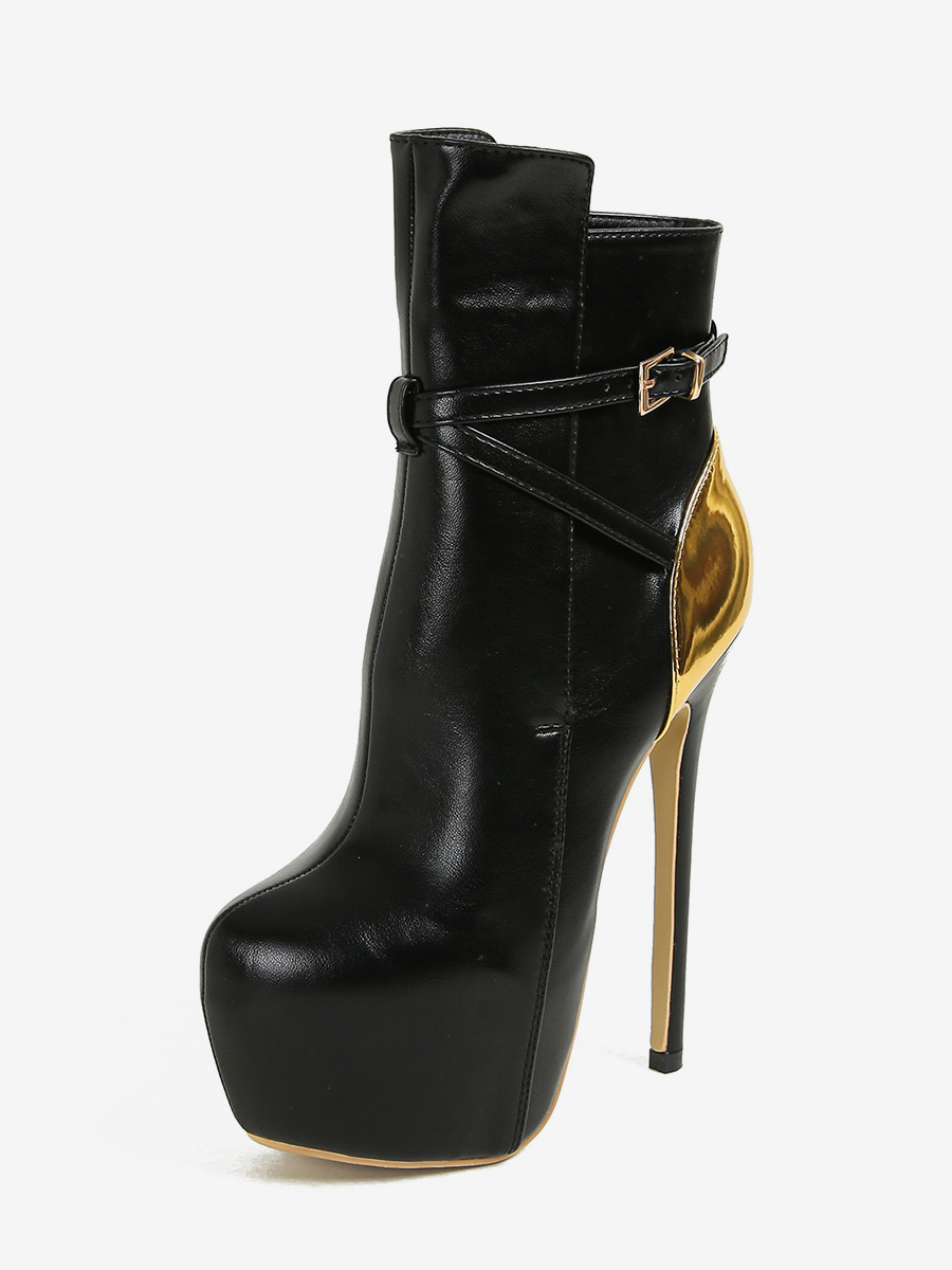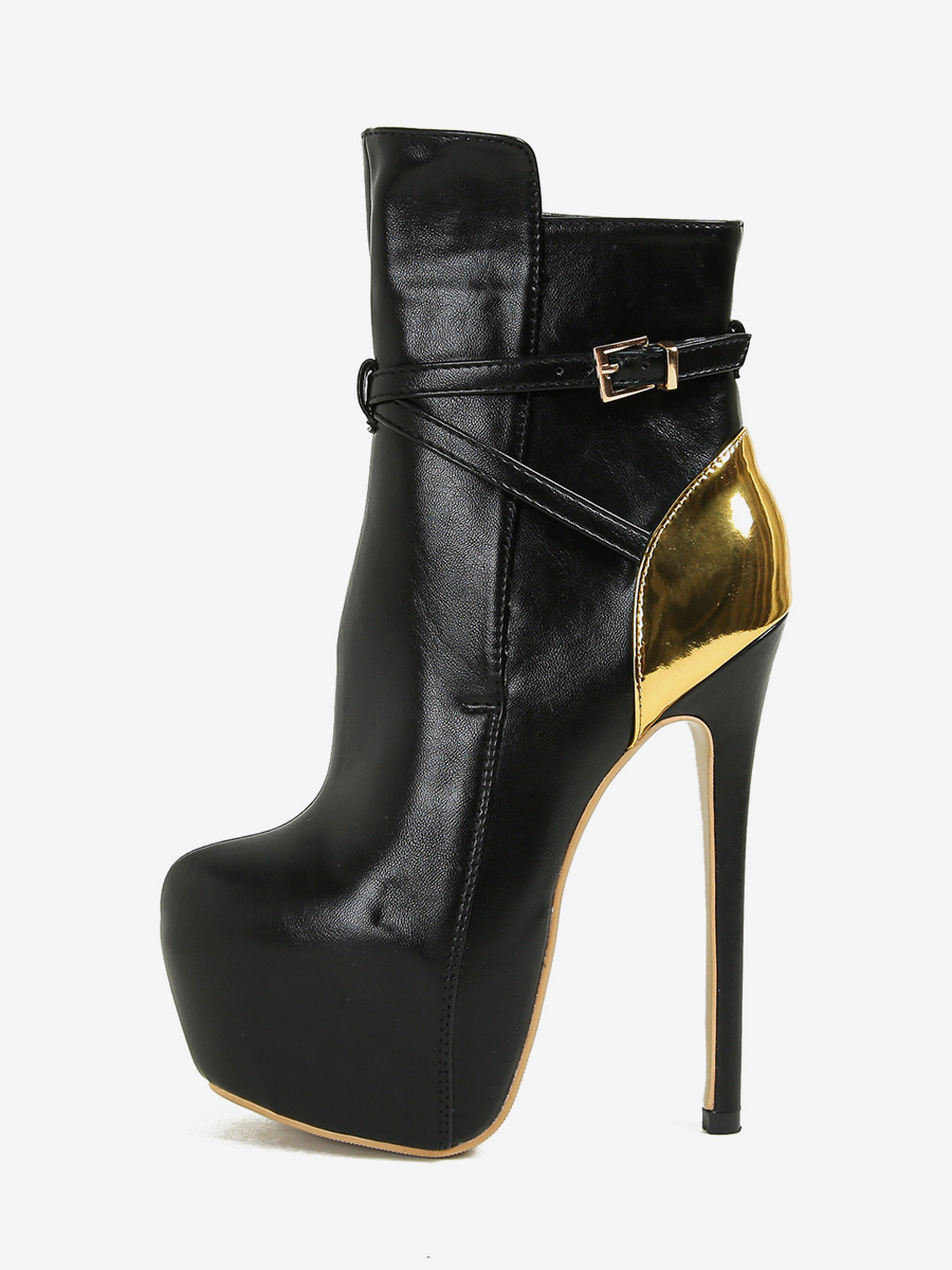 ブラックのアンクルブーツ。セクシーなプラットフォーム、ラウンドトゥ、バックルディテール、ハイヒールブーツ。