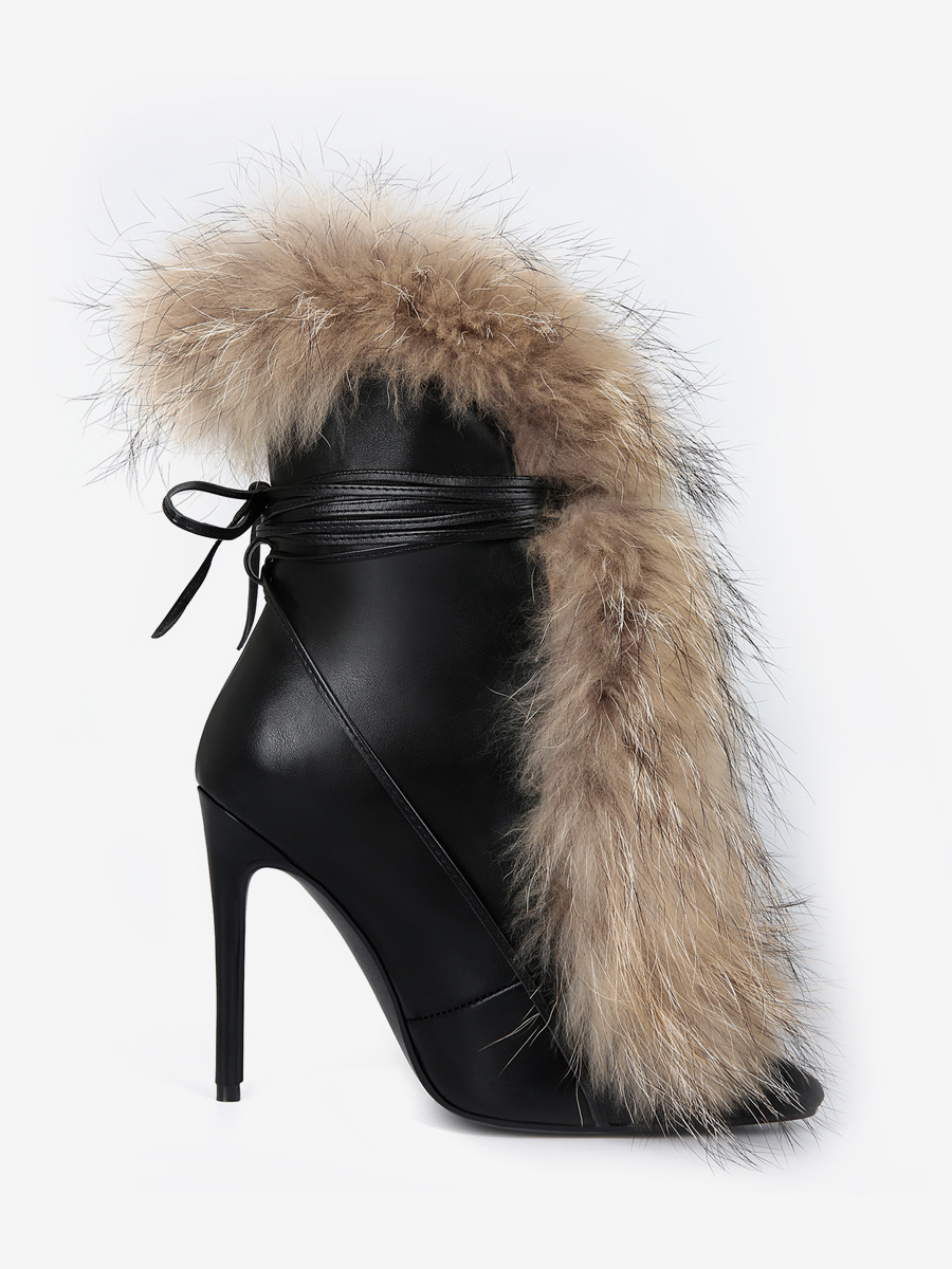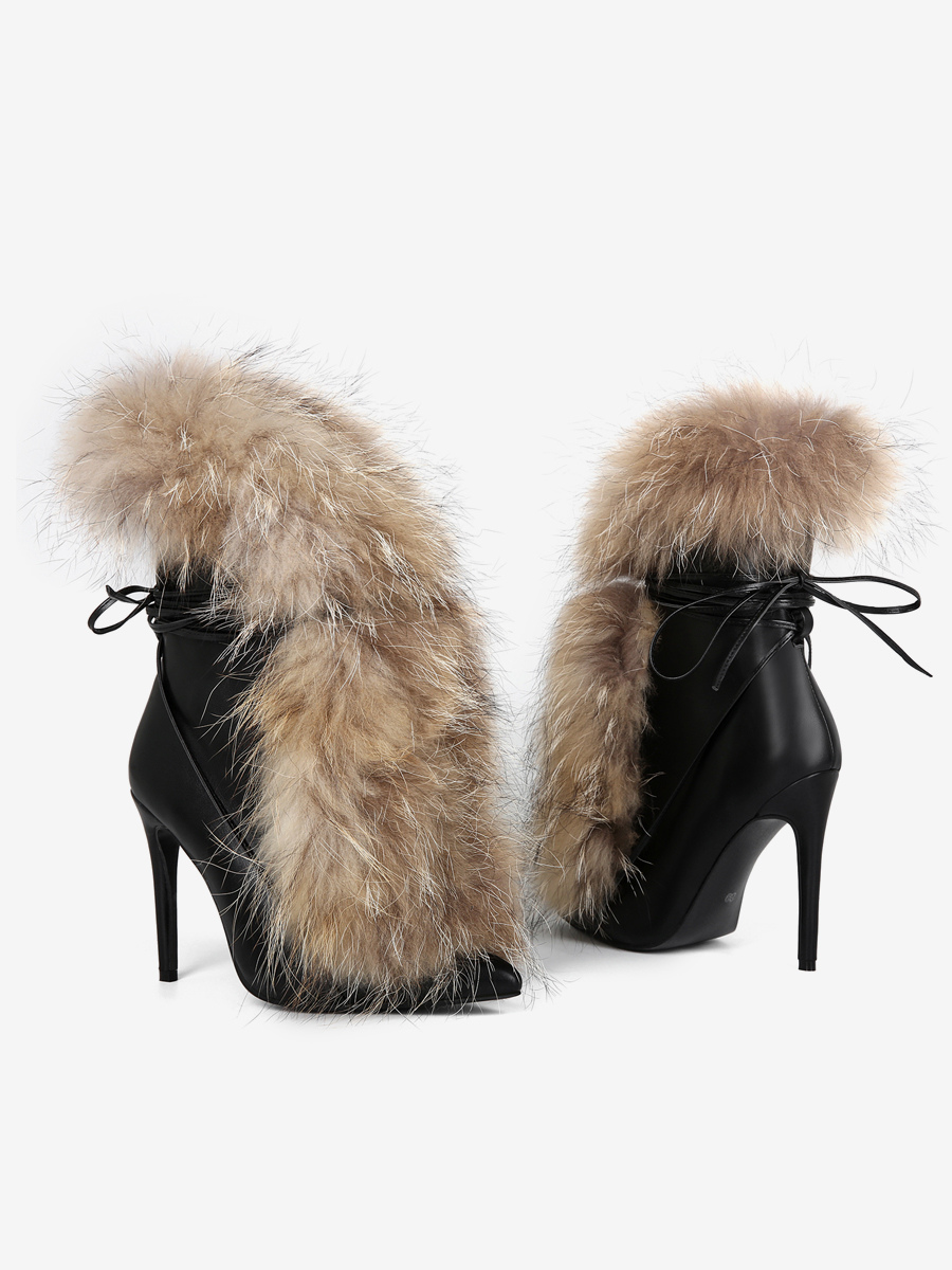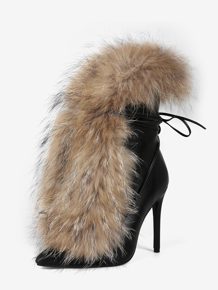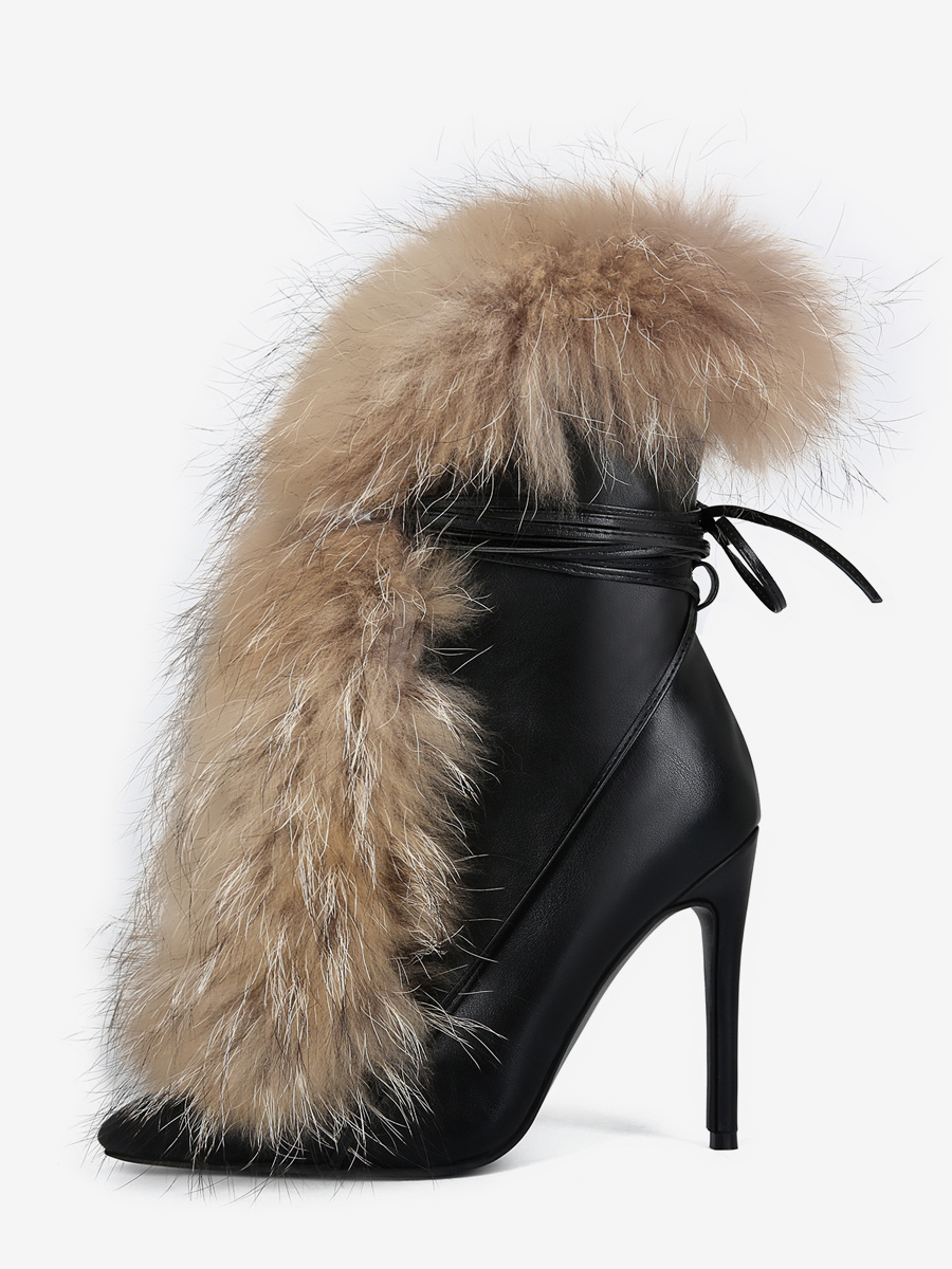 ブラック アンクルブーツ レディース ポインテッドトゥ フェイクファー レースアップ ハイヒール ブーティ