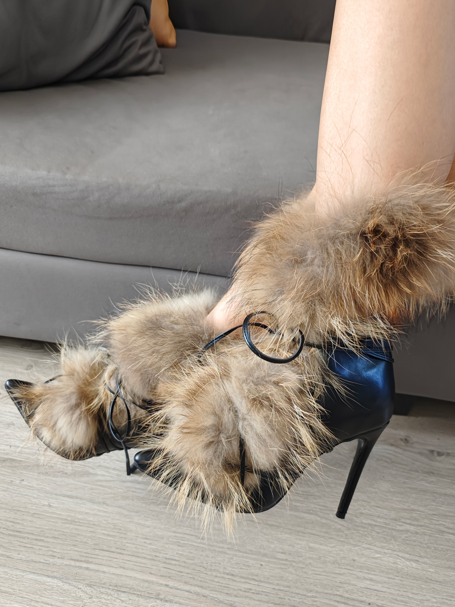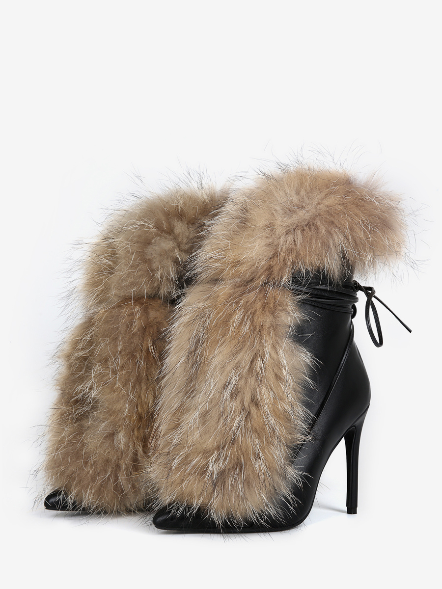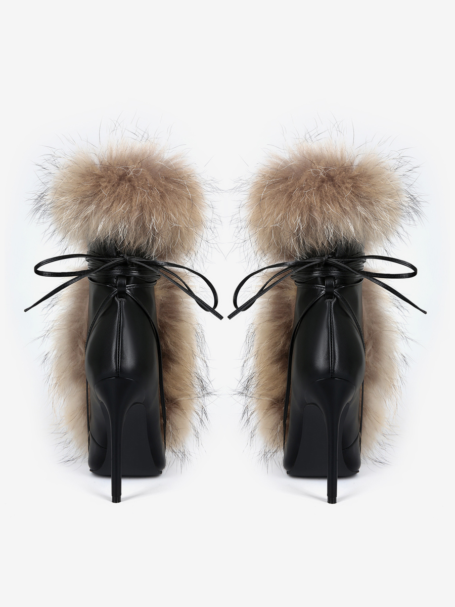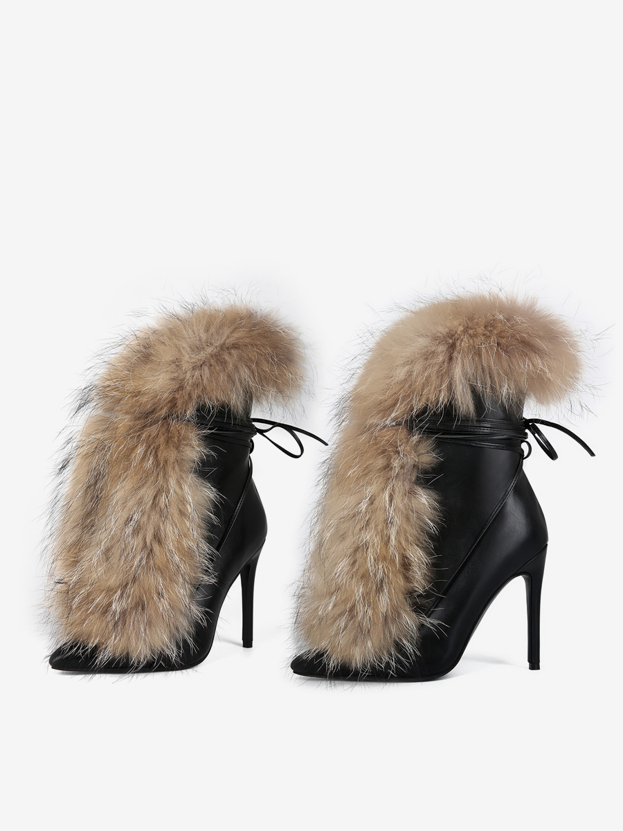 ブラック アンクルブーツ レディース ポインテッドトゥ フェイクファー レースアップ ハイヒール ブーティ
