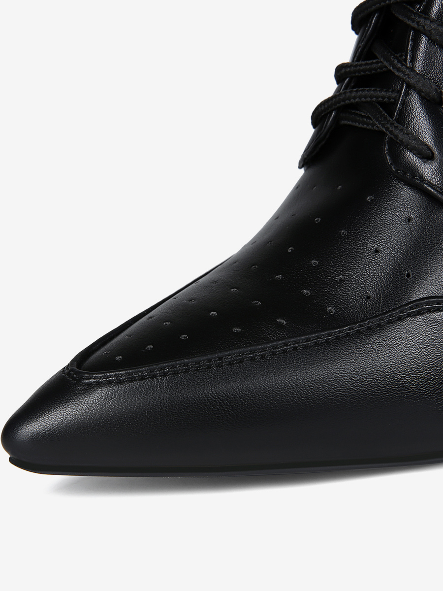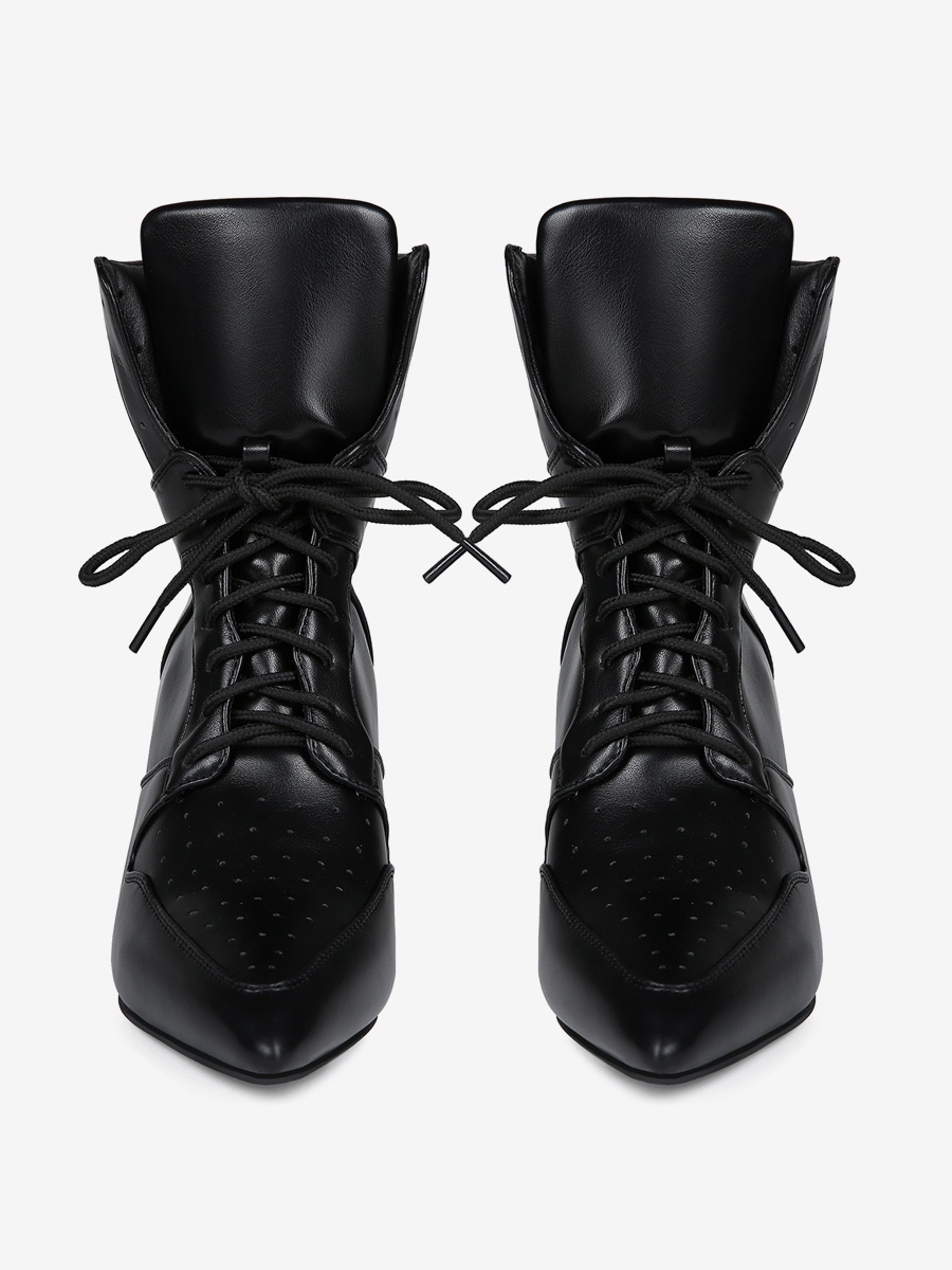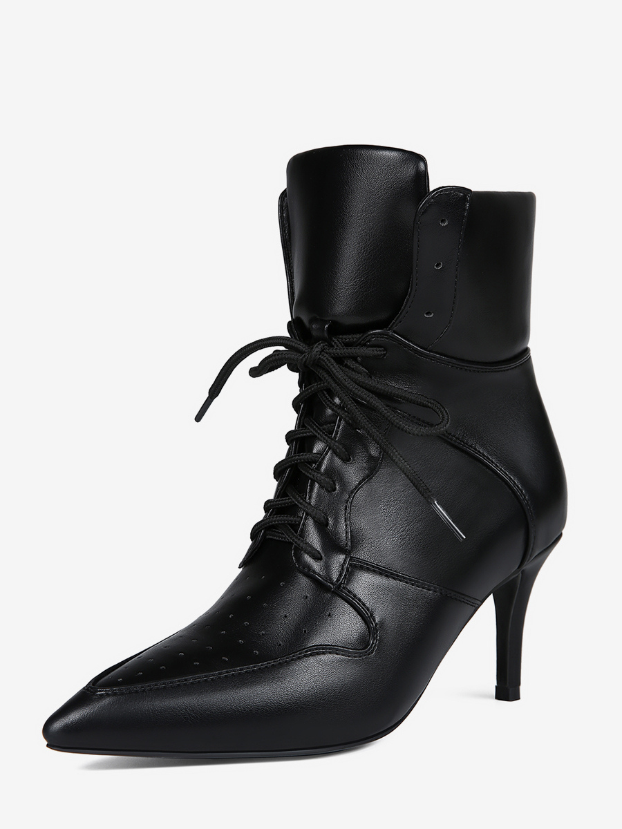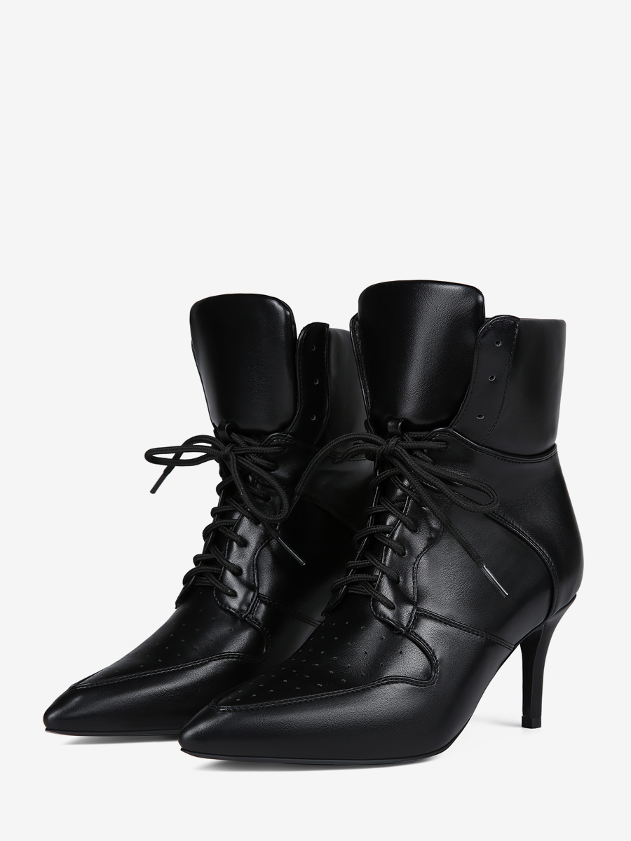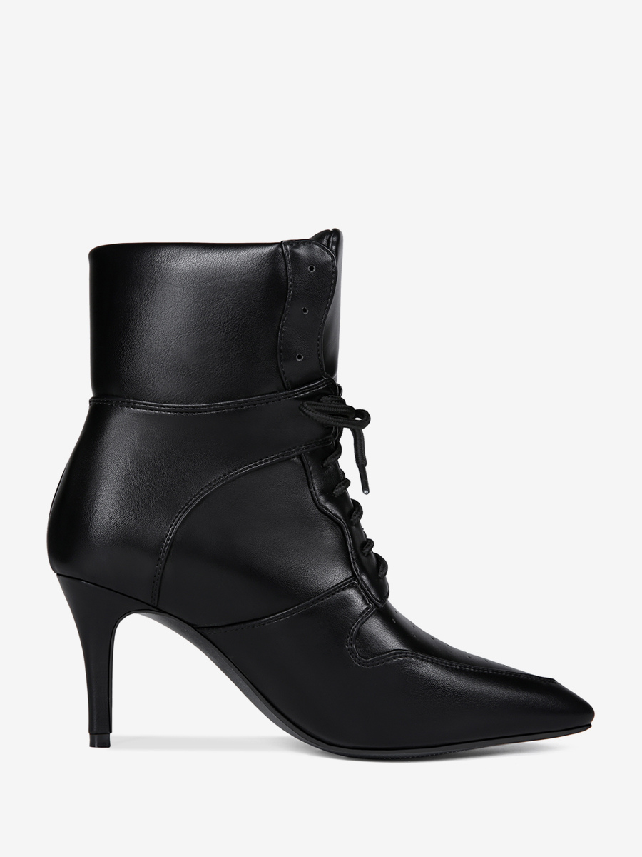 ブラックのアンクルヒール、ポインテッドトゥ、レースアップ、スティレットヒールのブーティ
