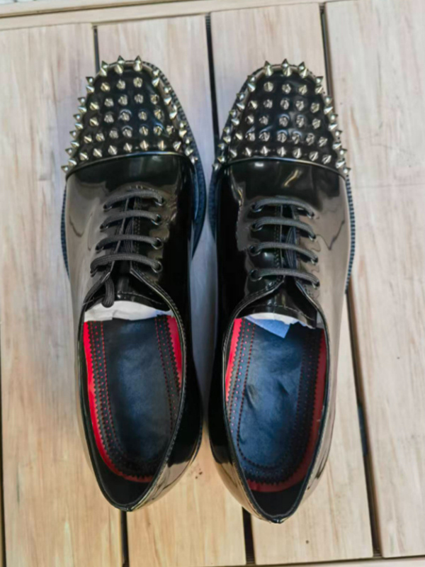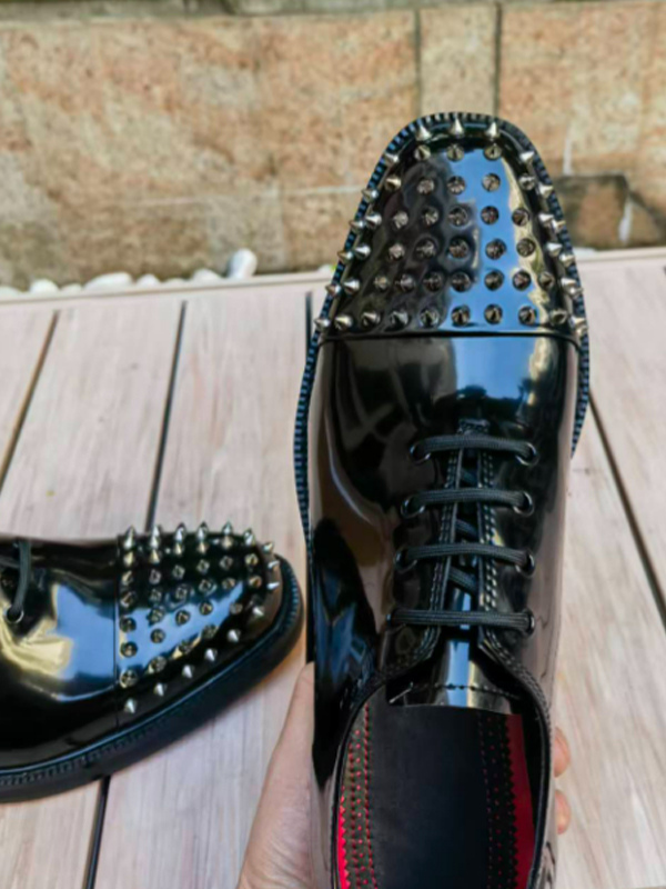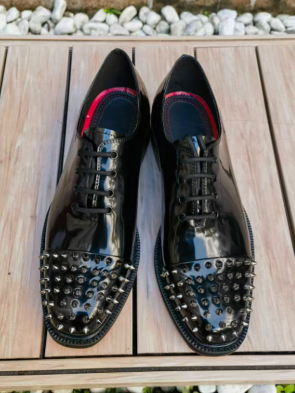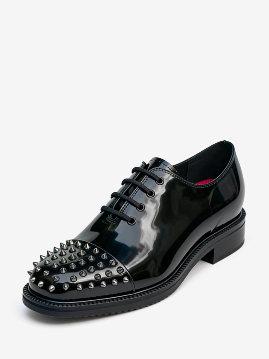 メンズ用ブラックドレスシューズ ラウンドトゥ スタッズ レースアップ プロムシューズ