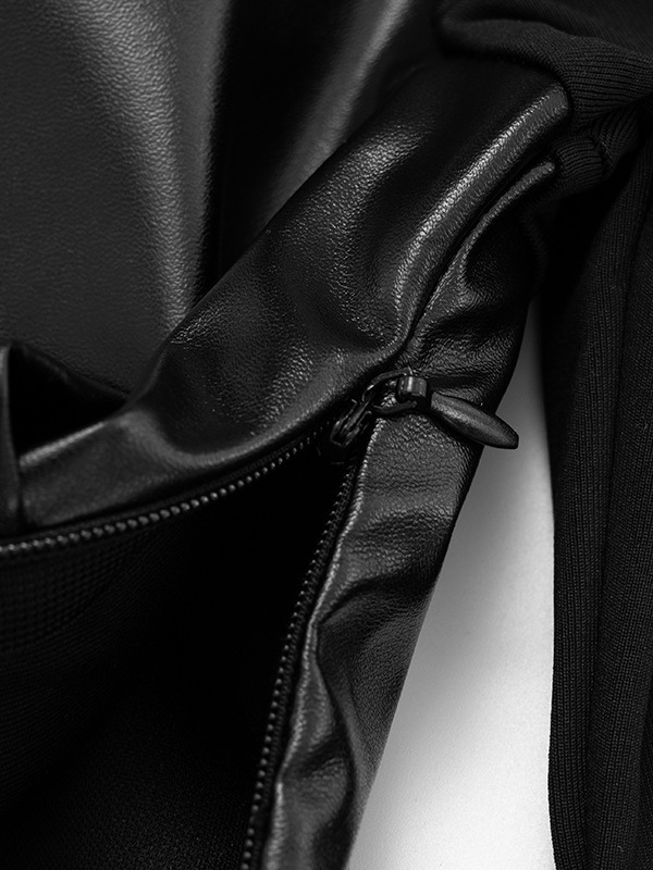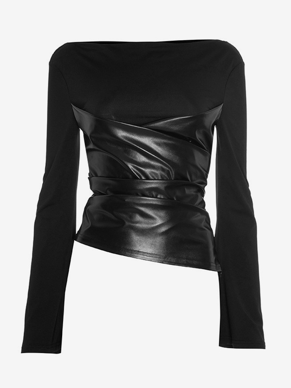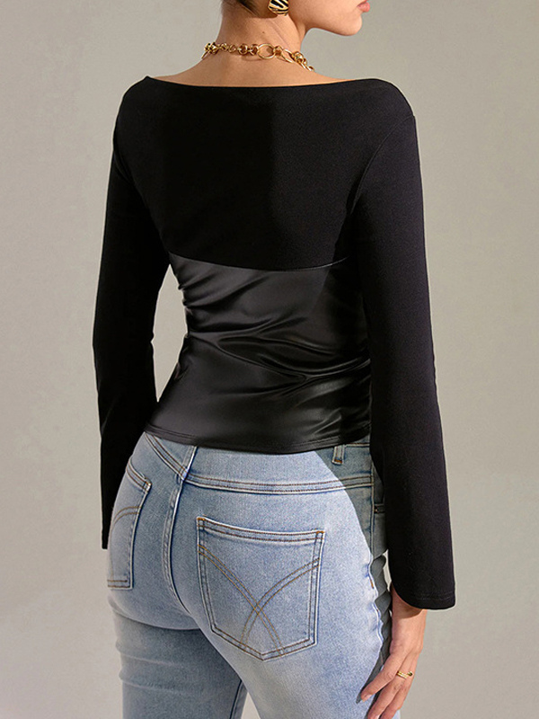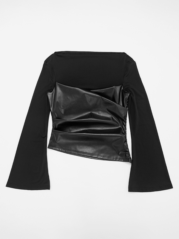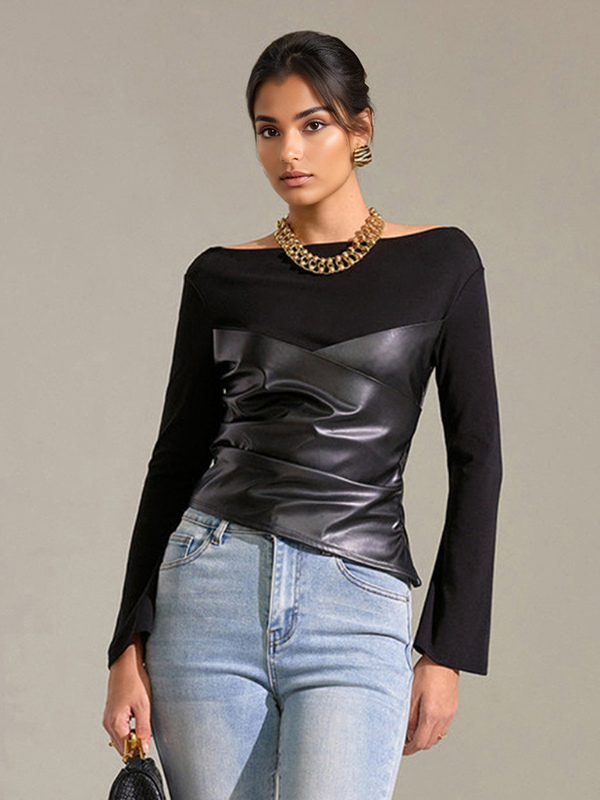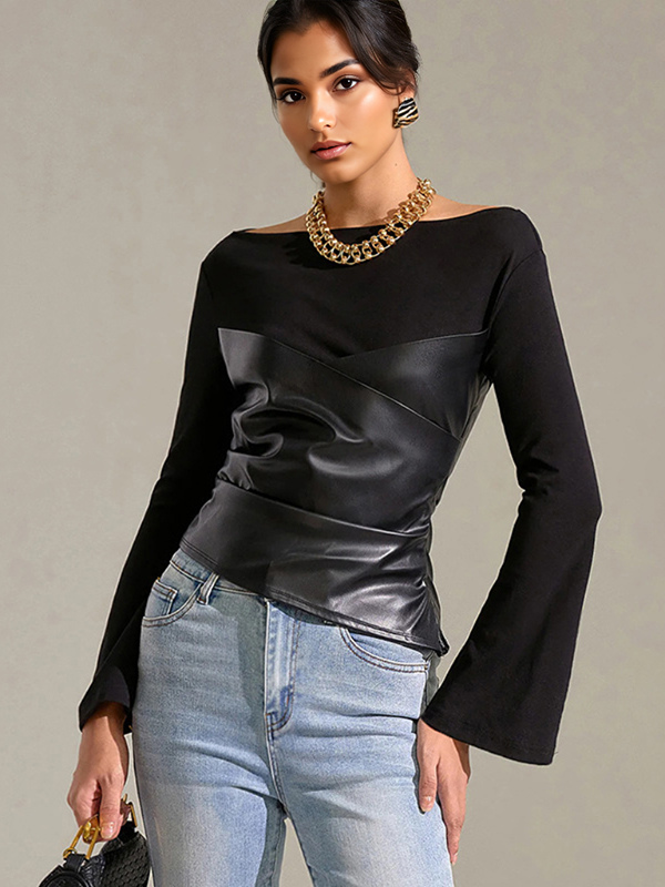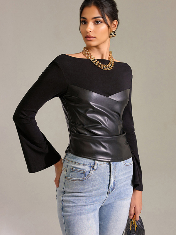 ボートネックとフレアスリーブのブラックフェイクレザーパネルトップス(レディース 2025)
