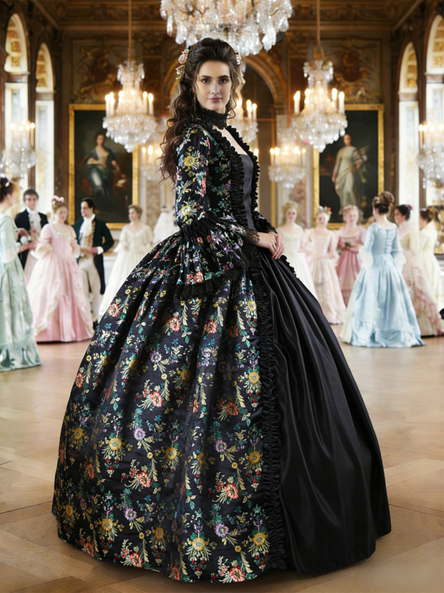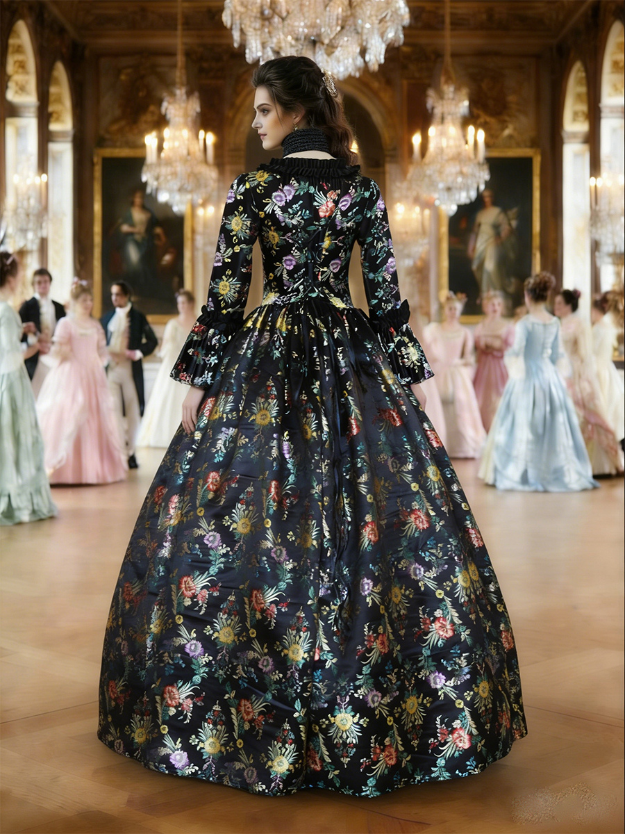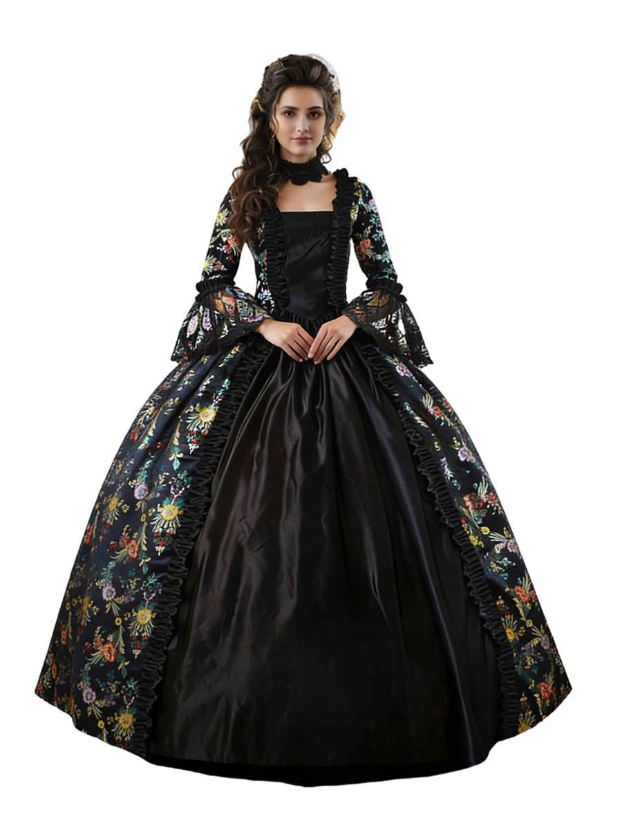 ブラック ゴールド レトロ コスチューム 女の子用 花柄 マリー アントワネット コスチューム レースアップ サテン生地 セット ドレス チョーカー ゴシック 18世紀 コスチューム