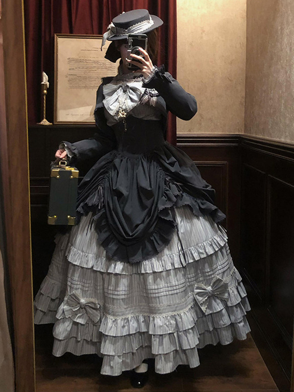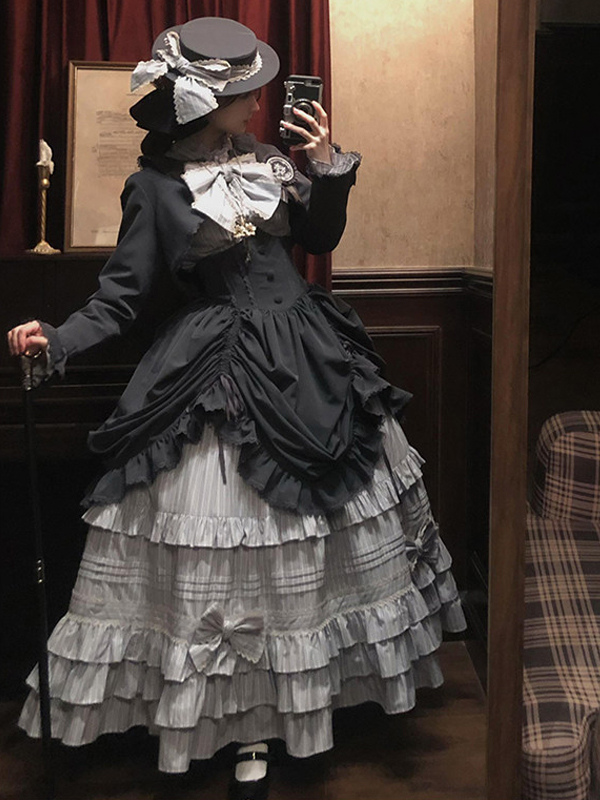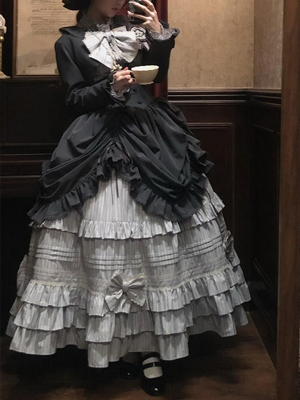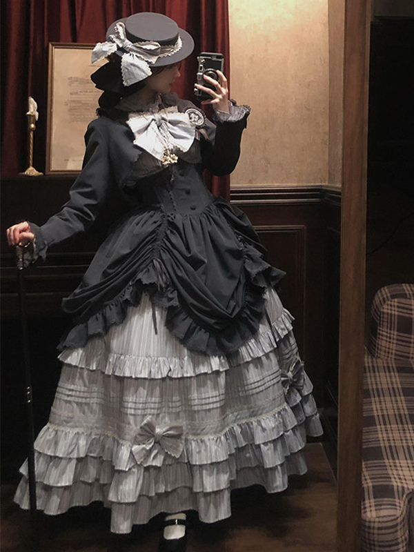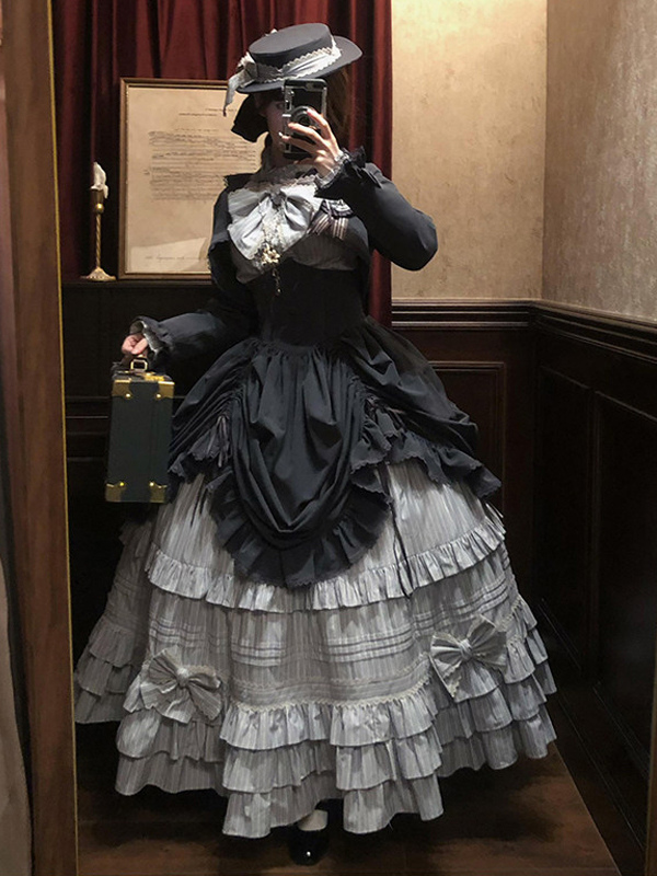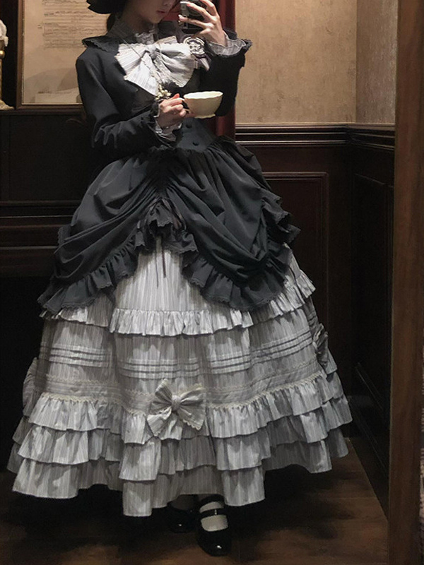 ブラックゴシックロリータドレスセット ヴィンテージスタイル ビクトリアンフリル 長袖シャツ オーバーコート スカートセット