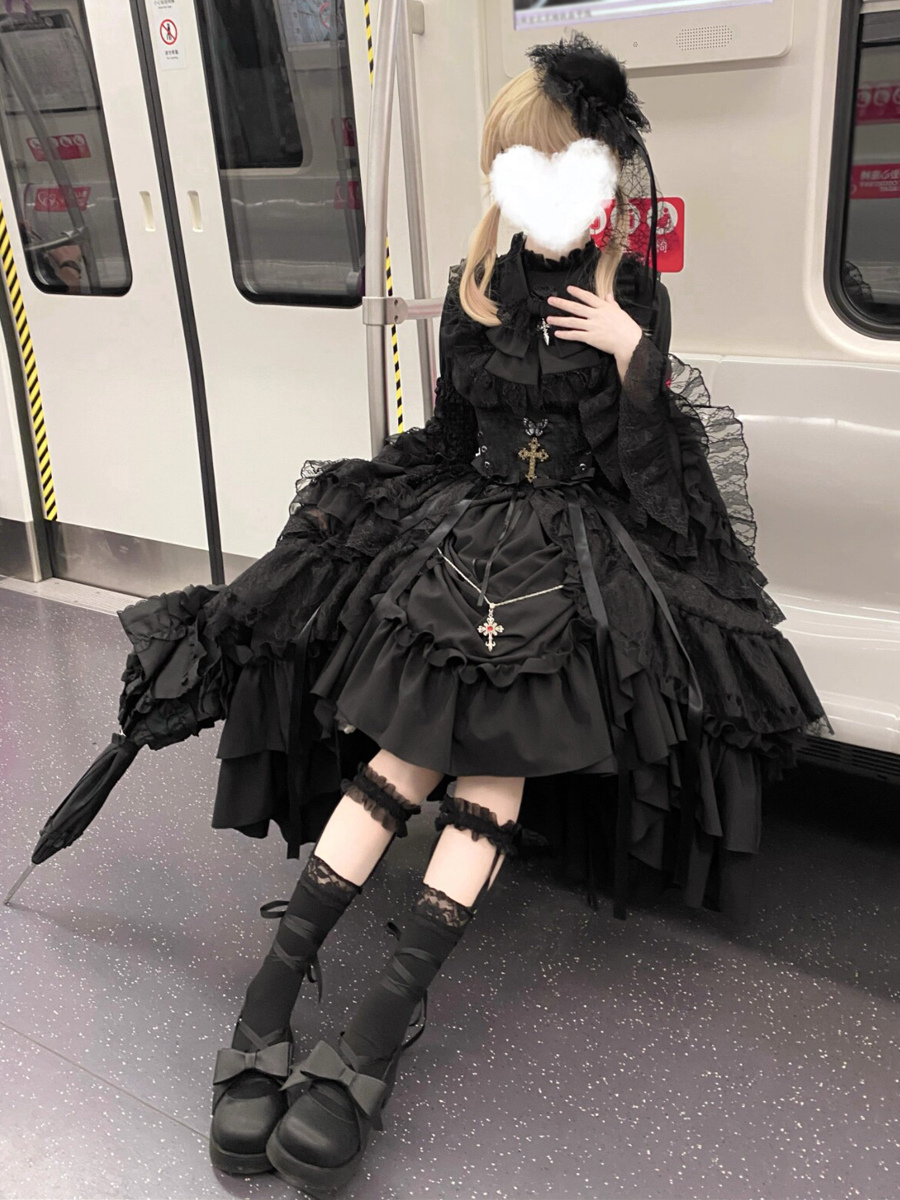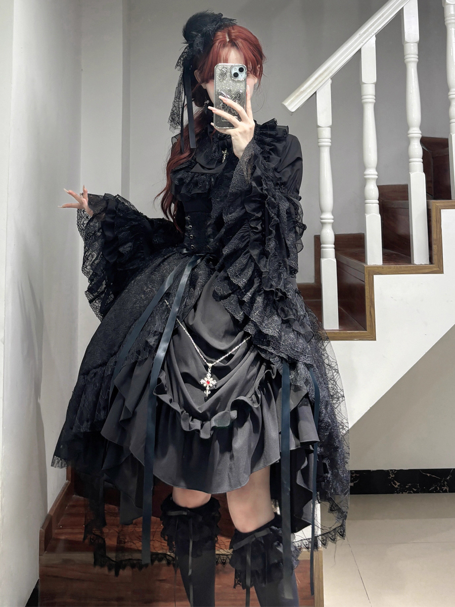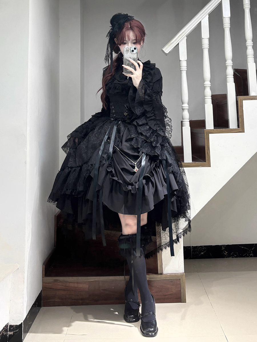 ブラック ゴシック ロリータ ドレス レースアップ ロングスリーブ フリル ゴシック ロリータ ドレス セット