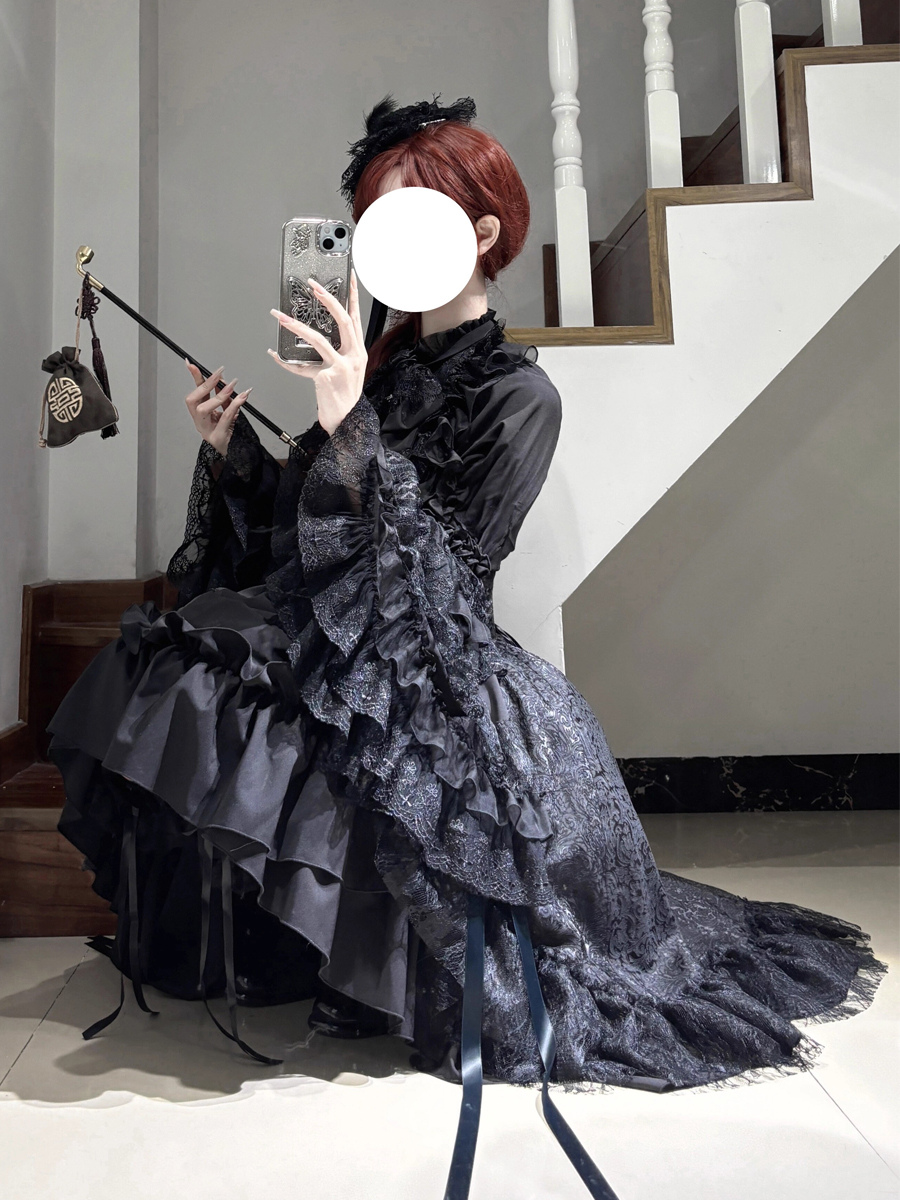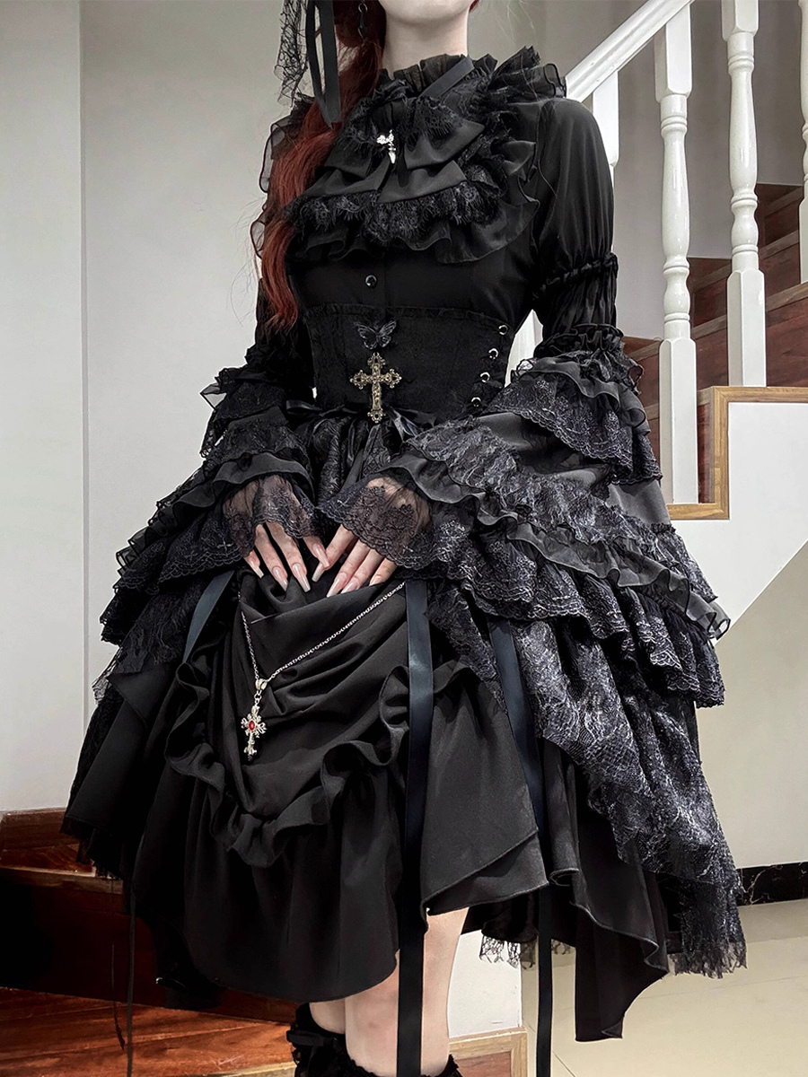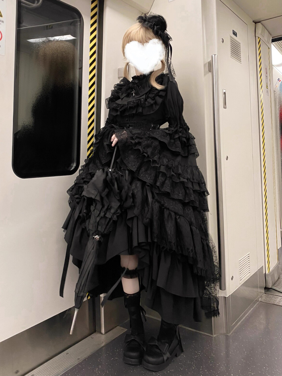 ブラック ゴシック ロリータ ドレス レースアップ ロングスリーブ フリル ゴシック ロリータ ドレス セット