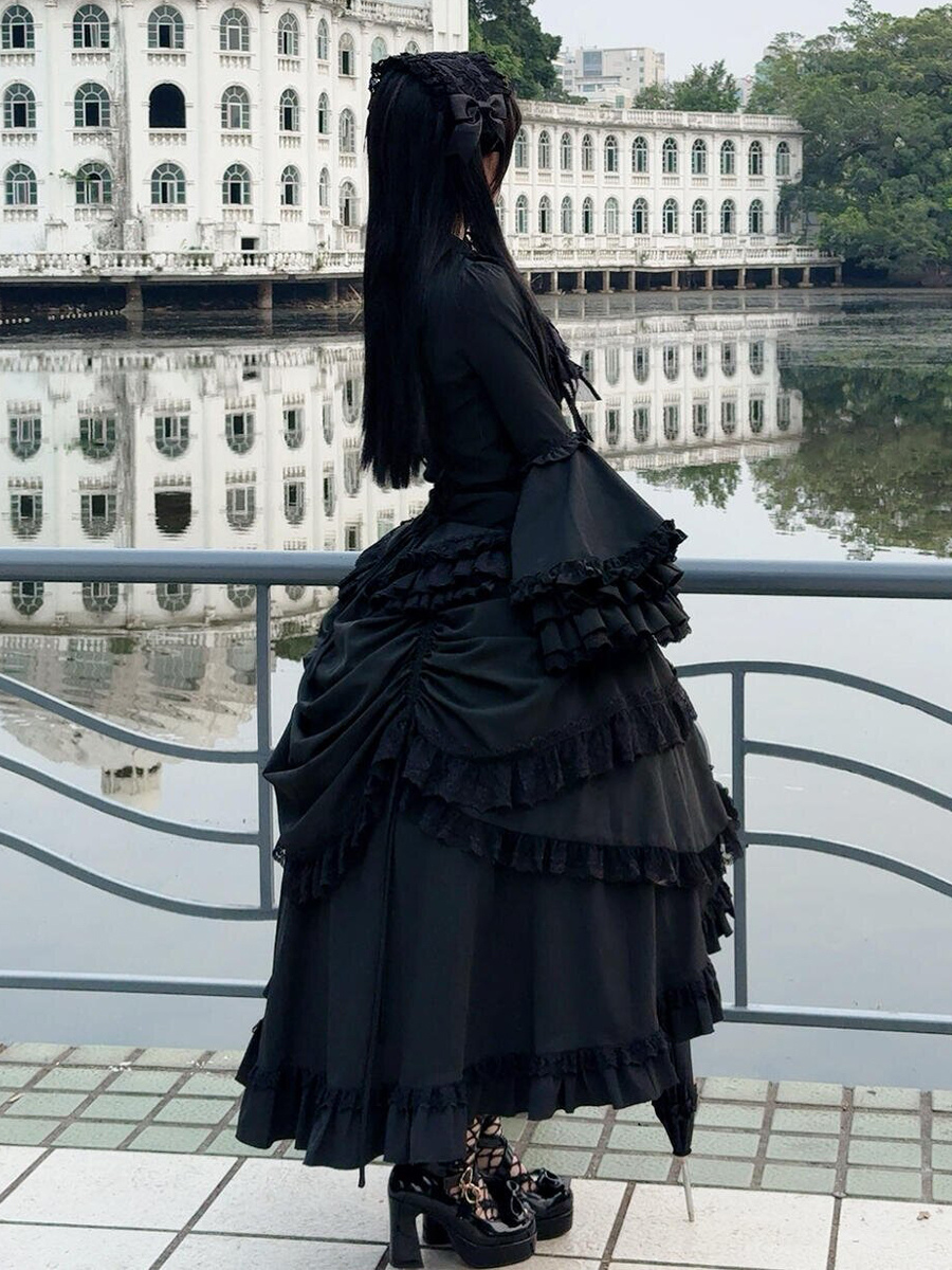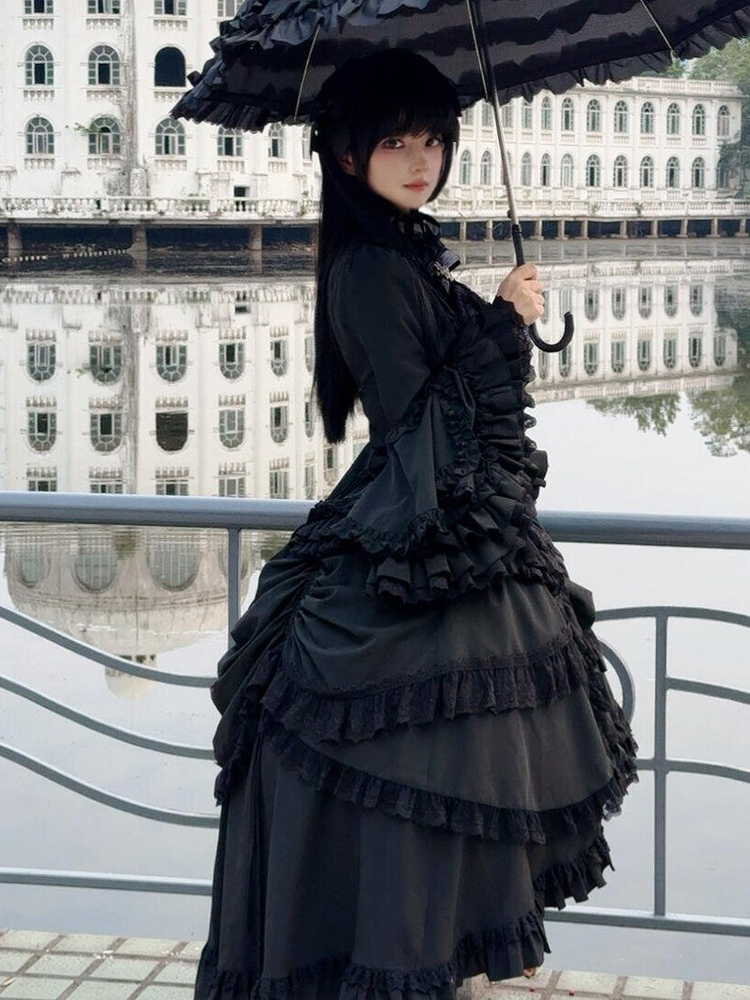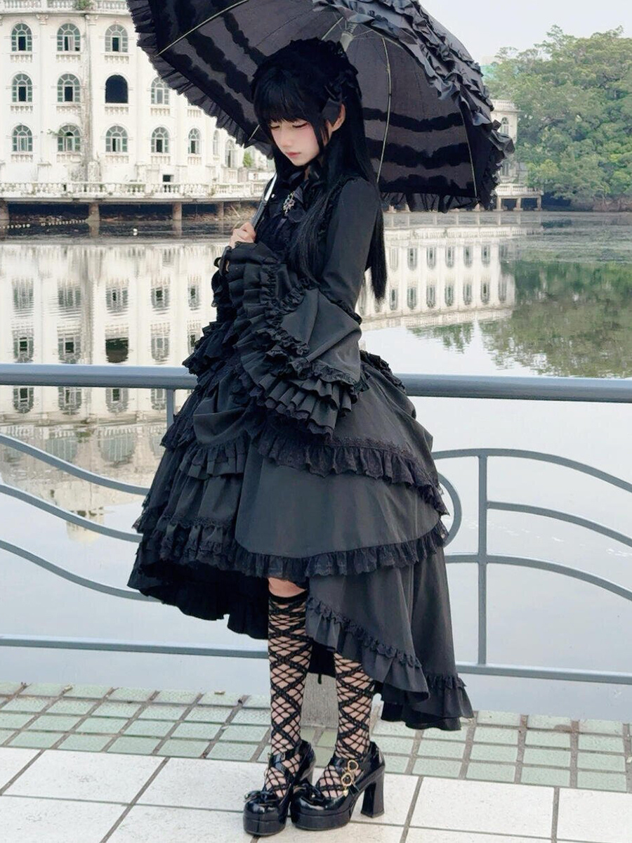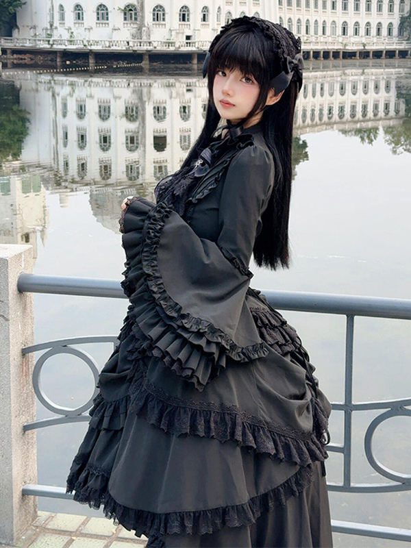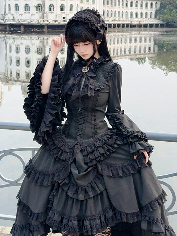 黒のゴシックロリータセットドレス、フリル、長袖、クラバットトップ、スカートのロリータドレス