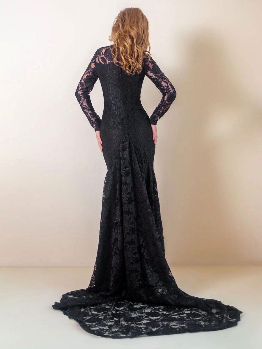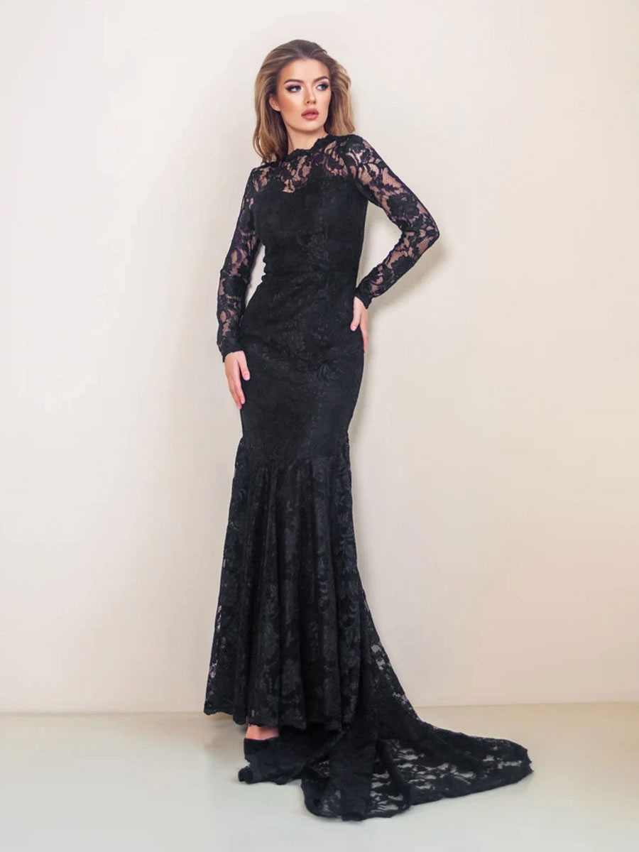 黒ゴシックウェディングドレスマーメイド長袖レーストレーンブライダルドレス無料カスタマイズ
