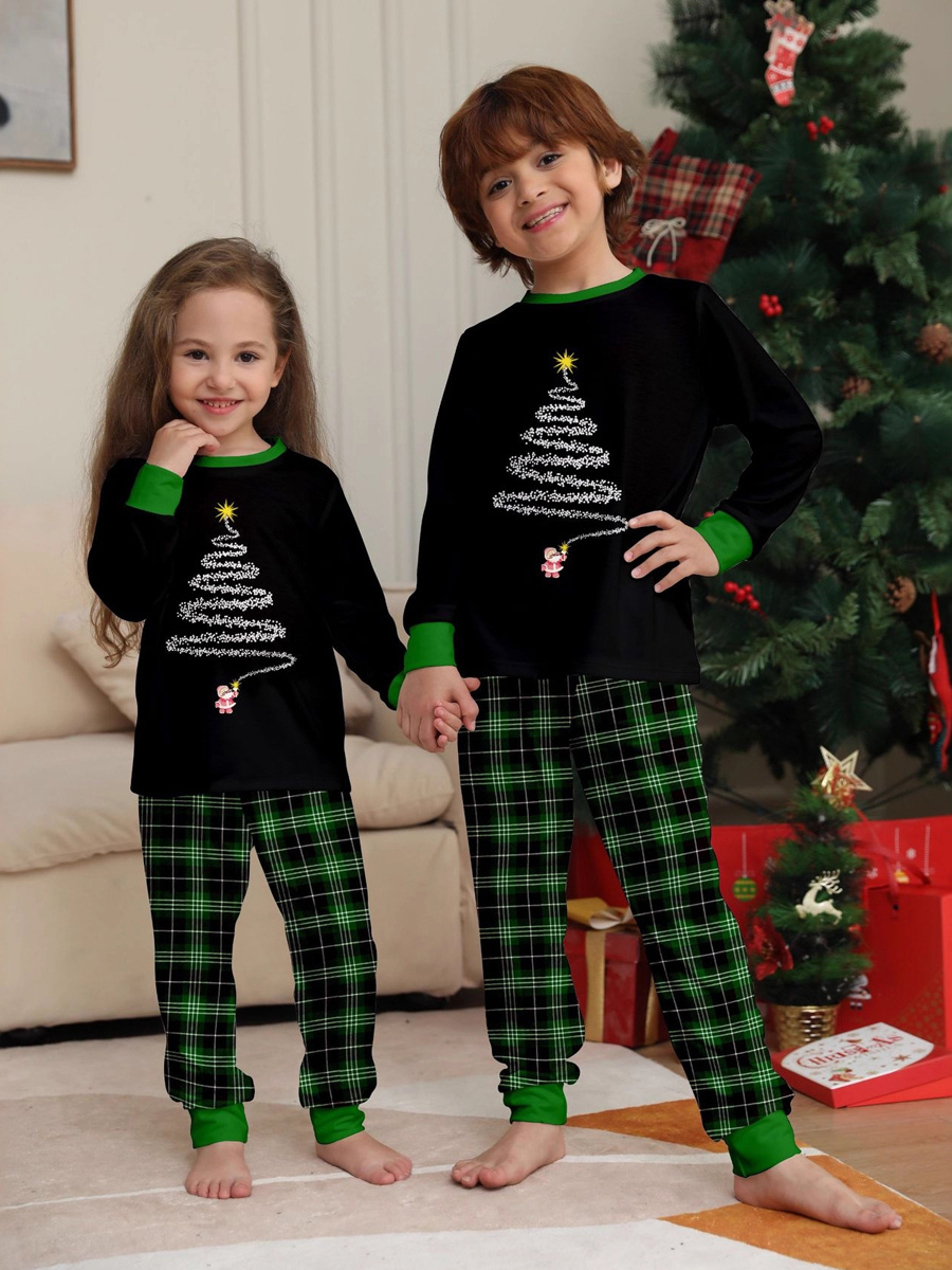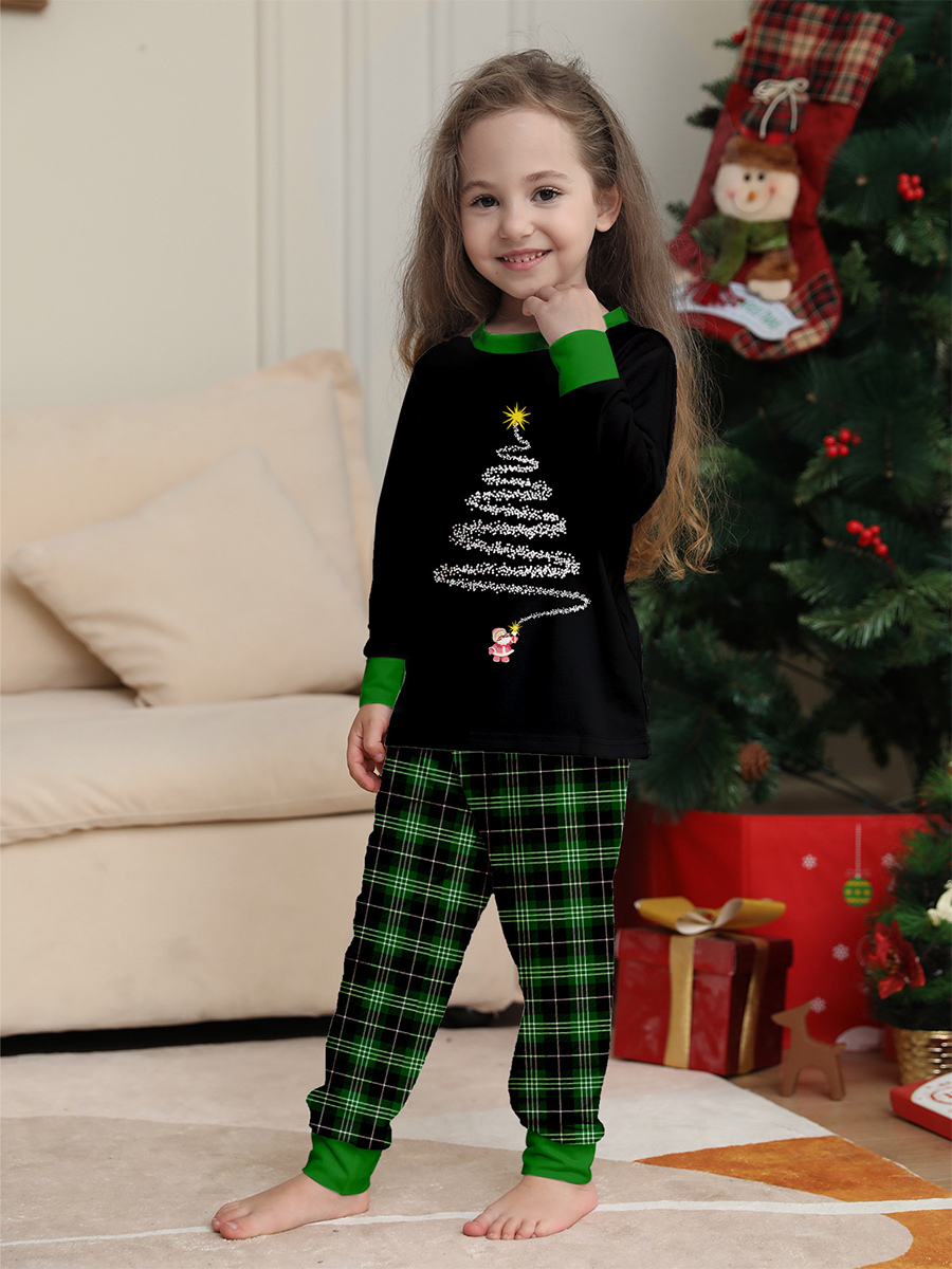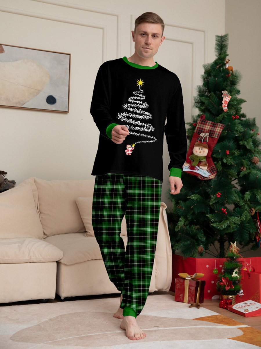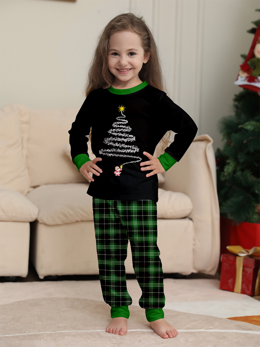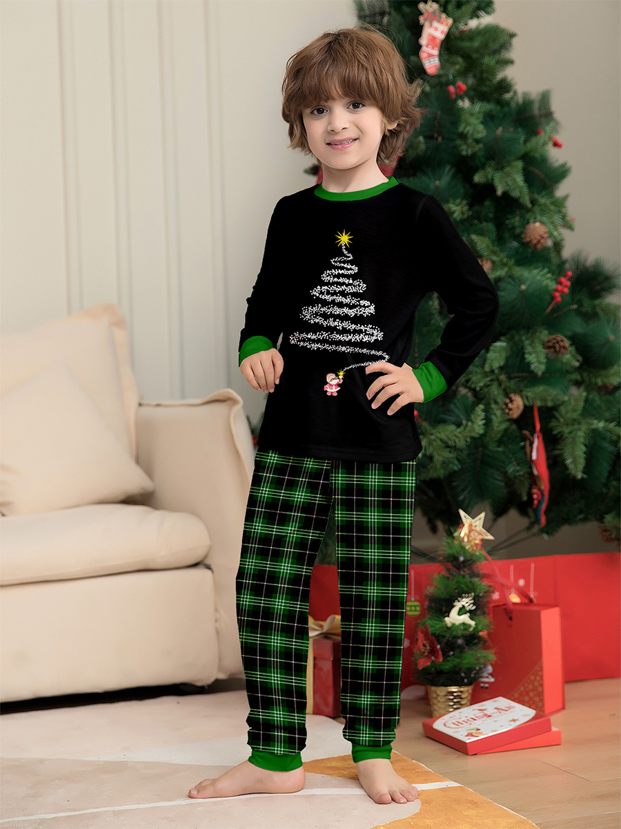 ブラックグリーンのチェック柄ファミリークリスマスパジャマ(ワイヤーツリープリント)2025年