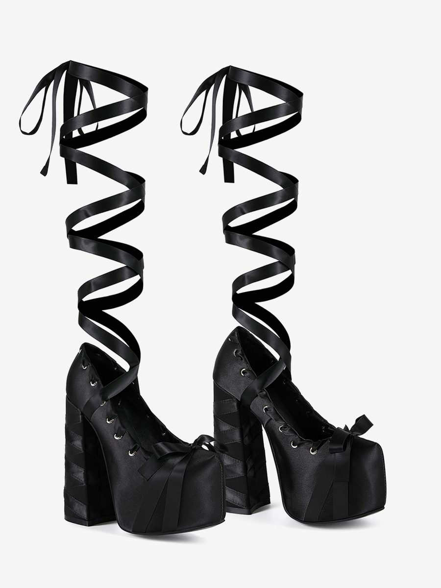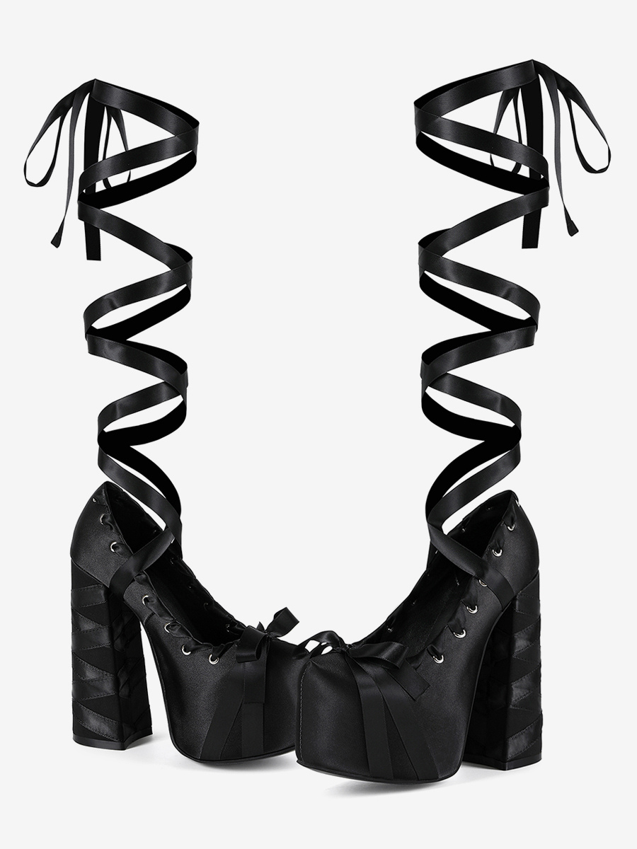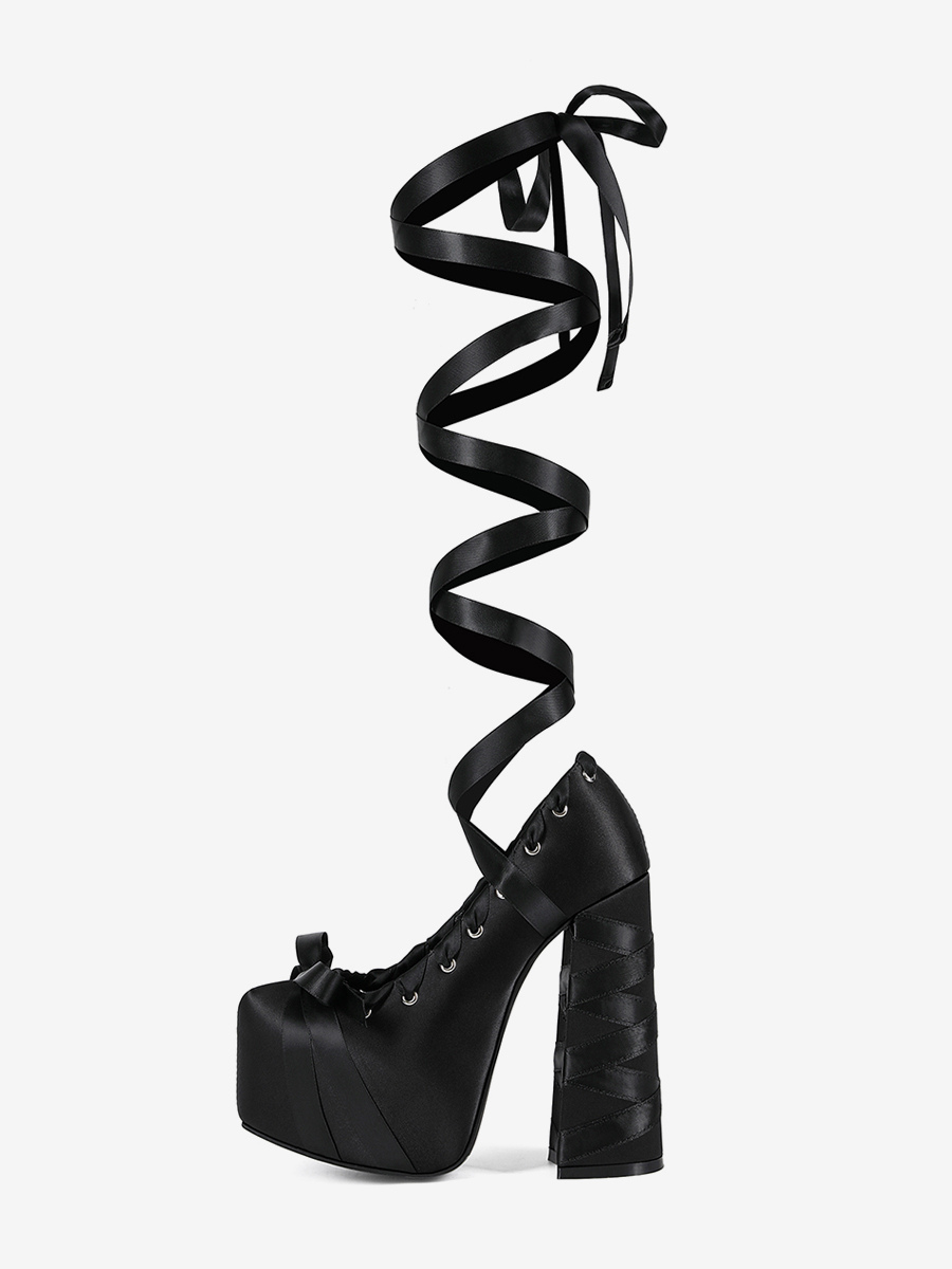 ブラックハイヒールパンプス サテンラウンドトゥ チャンキーヒール レースアップ ロリータシューズ