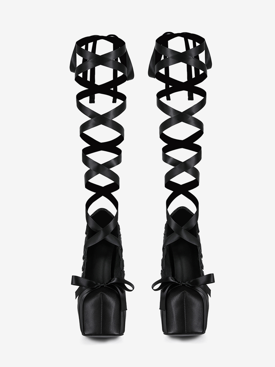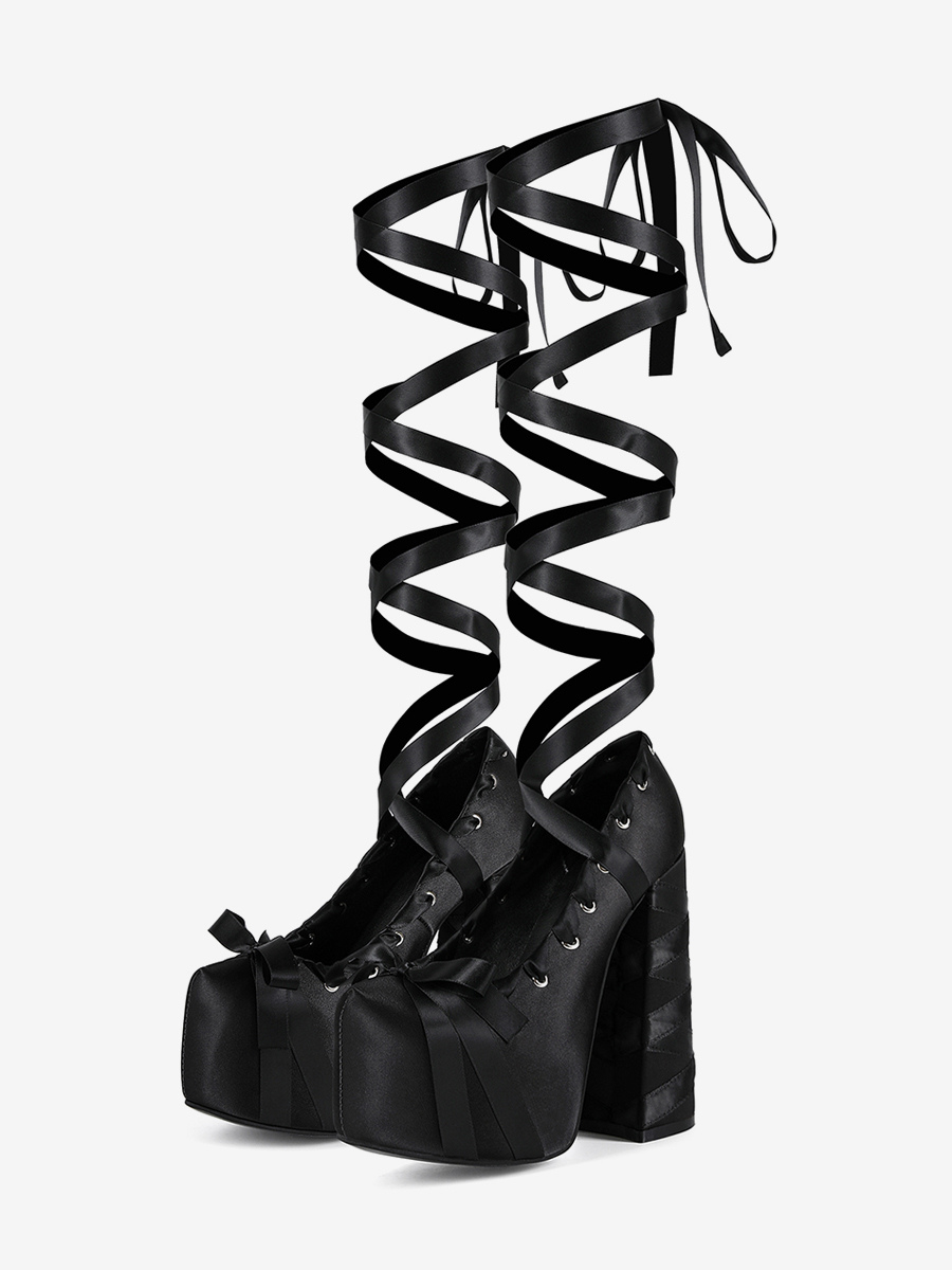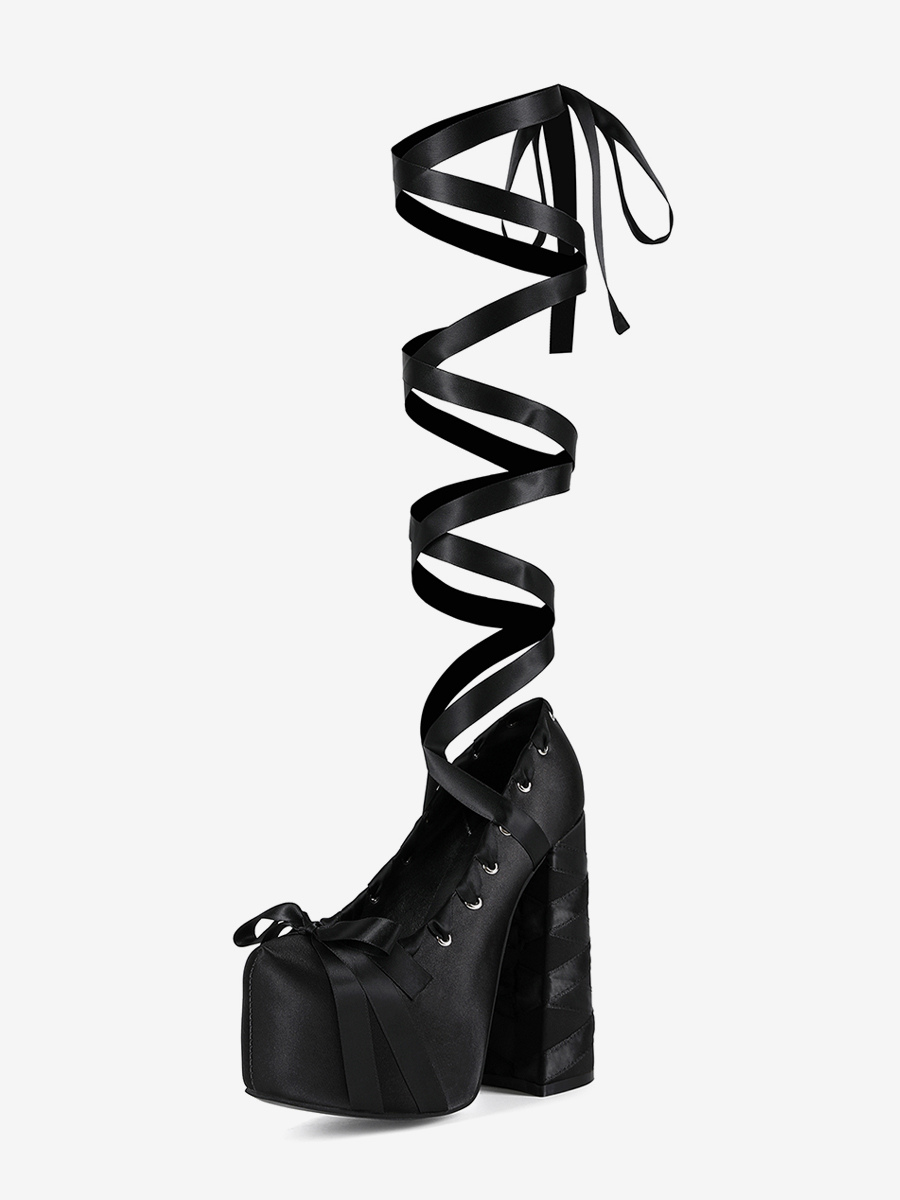 ブラックハイヒールパンプス サテンラウンドトゥ チャンキーヒール レースアップ ロリータシューズ