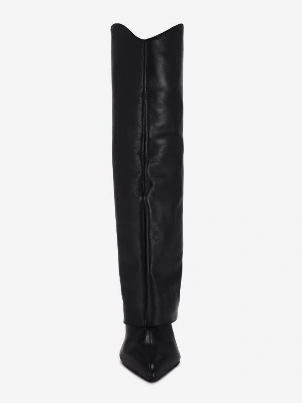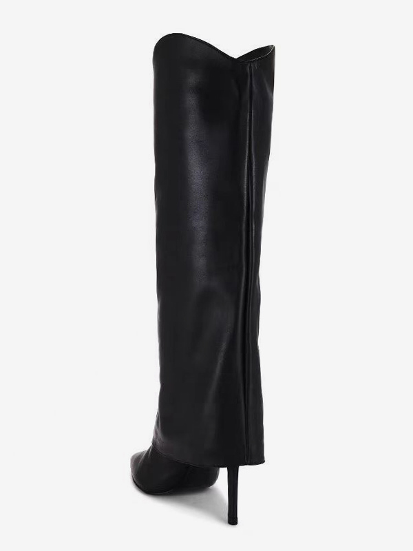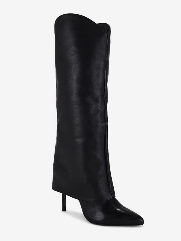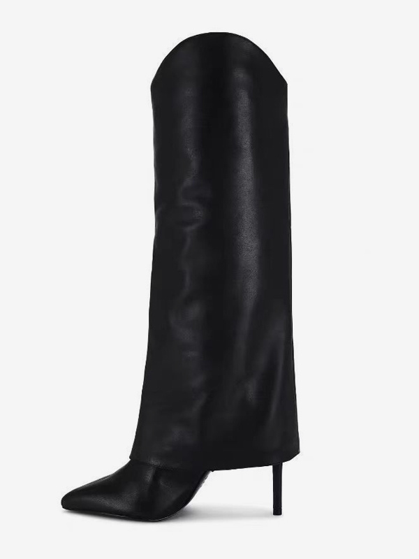レディース ブラック ニーハイブーツ ハイヒール ポインテッドトゥ フォールドオーバーブーツ