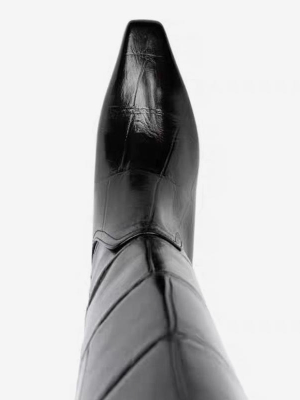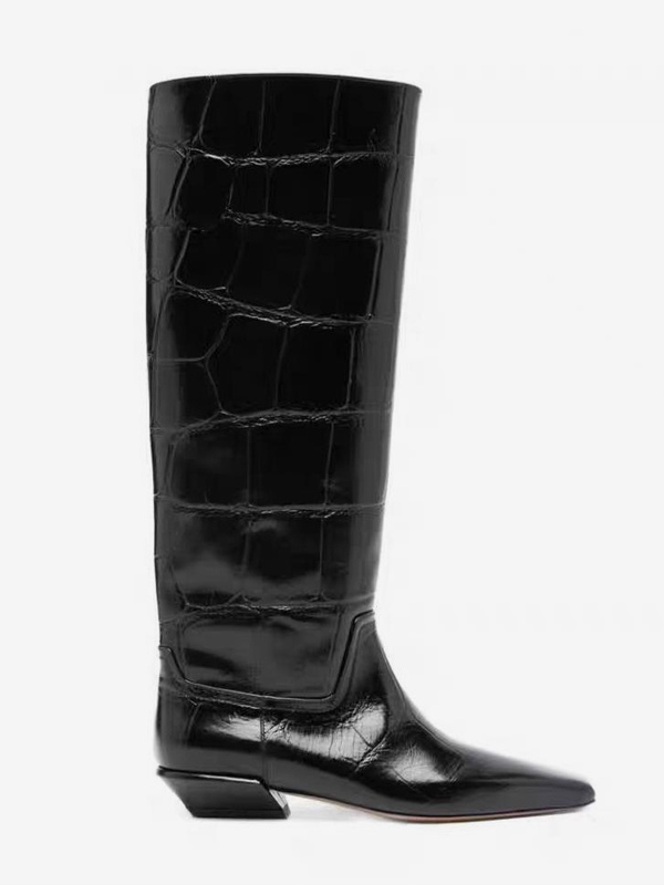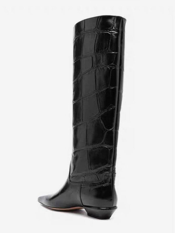 ブラックニーハイブーツ ストーン柄 スクエアトゥ チャンキーヒールブーツ
