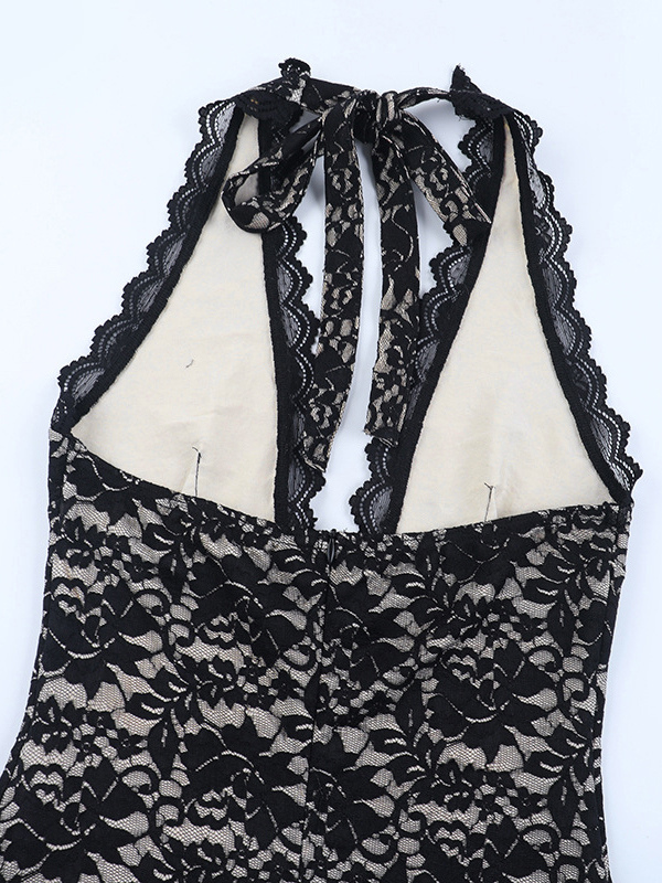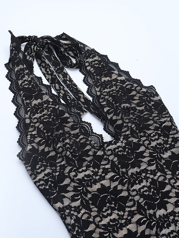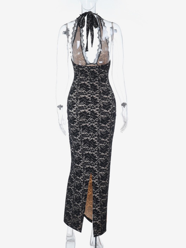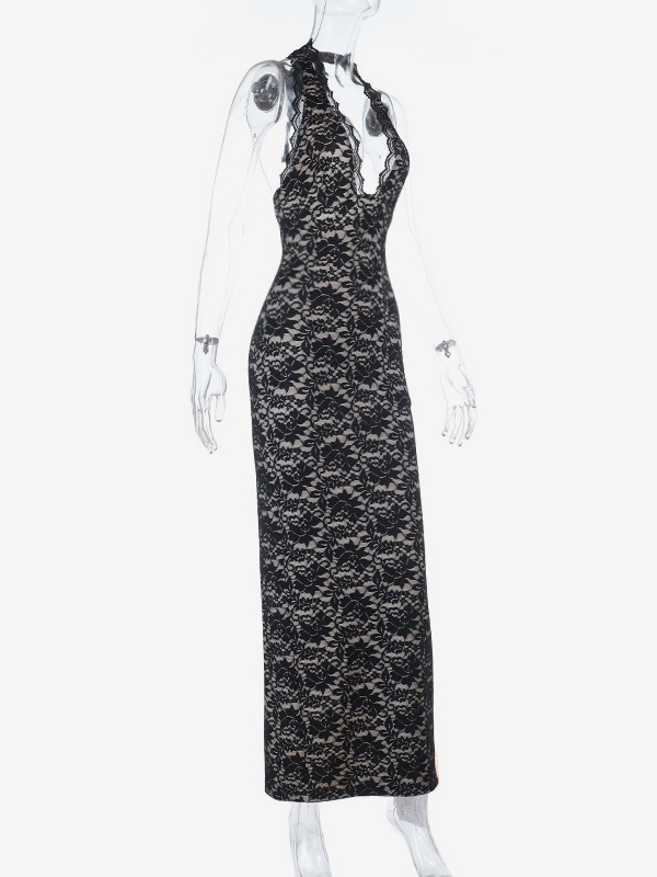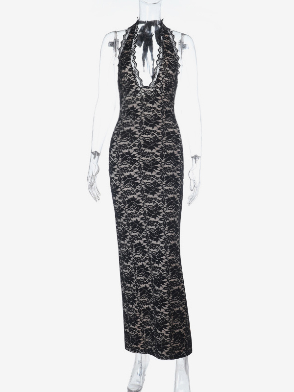 ブラックレースオーバーレイレディースマキシドレス - ホルターネックバックレスヌードライニングガウン - セクシーなボディコンナイトアウトパーティードレス 2026