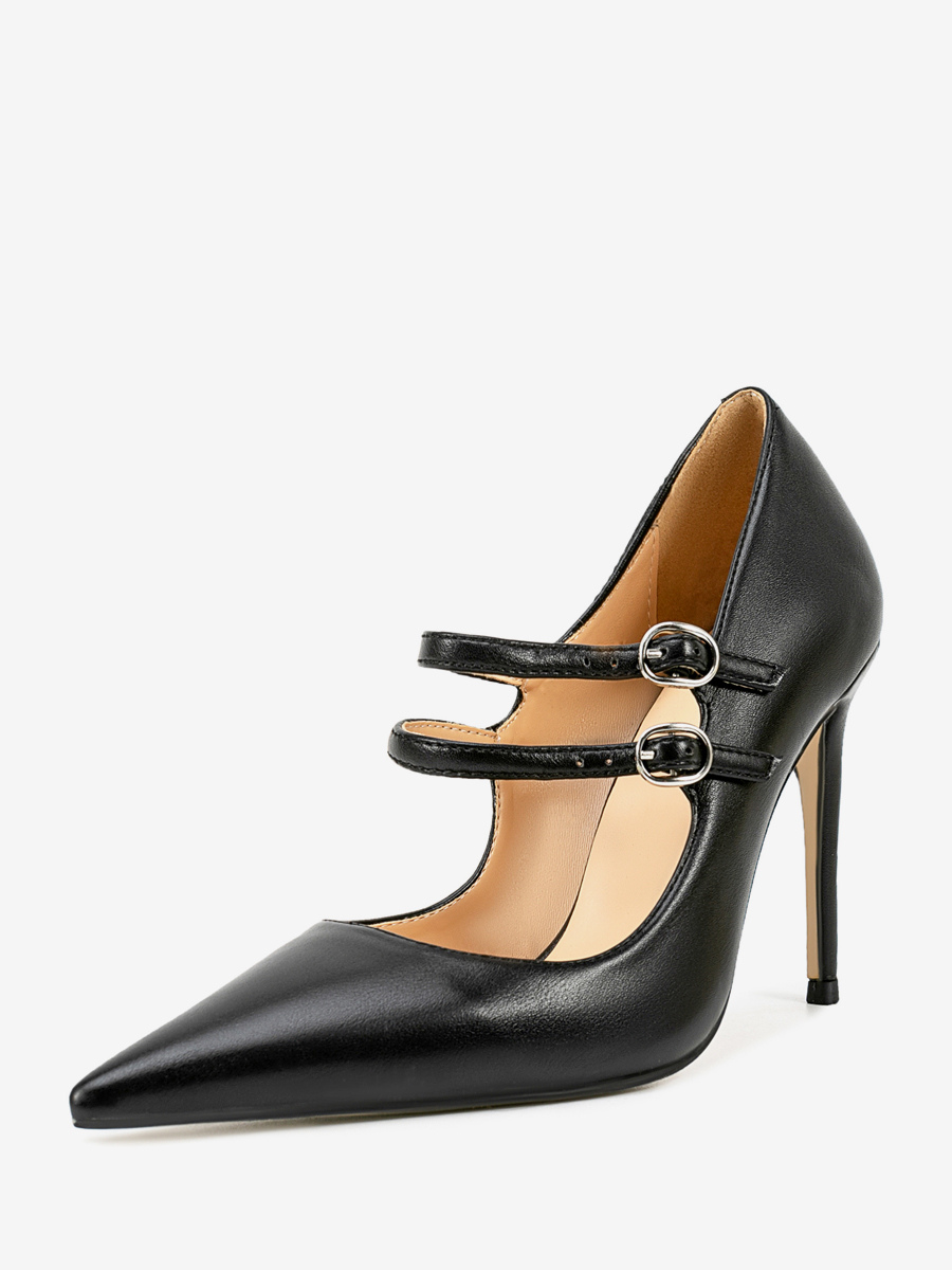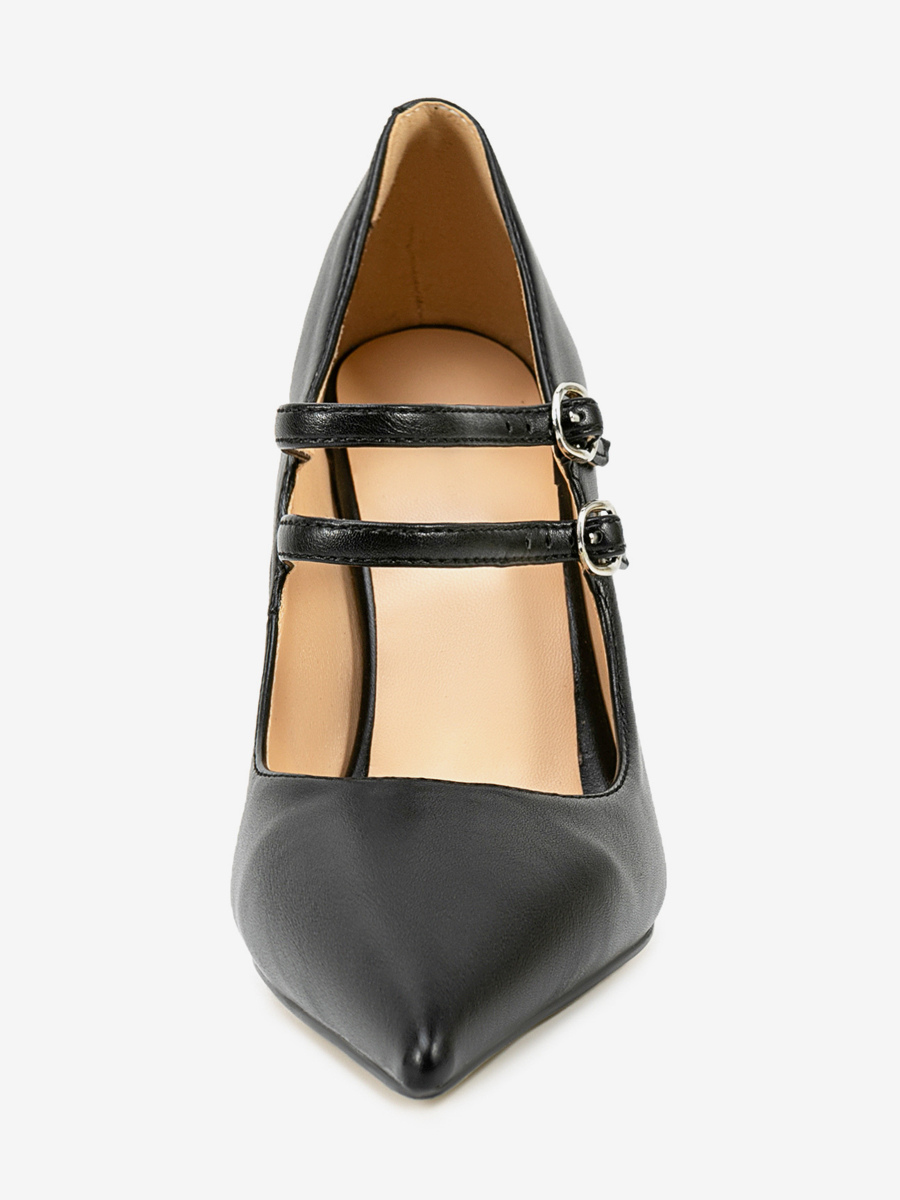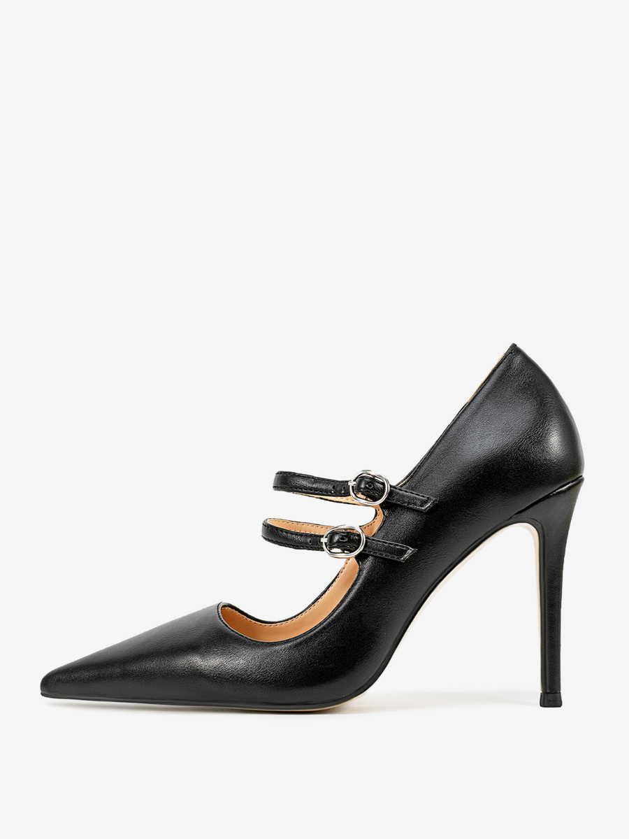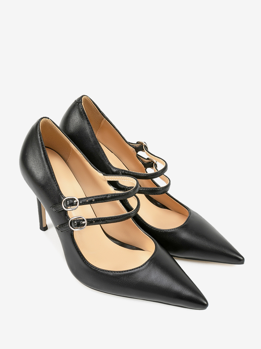 ブラックのメリージェーンシューズ、ポインテッドトゥ、スティレットヒールパンプス
