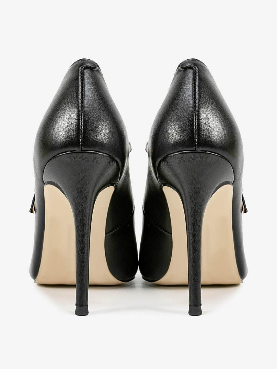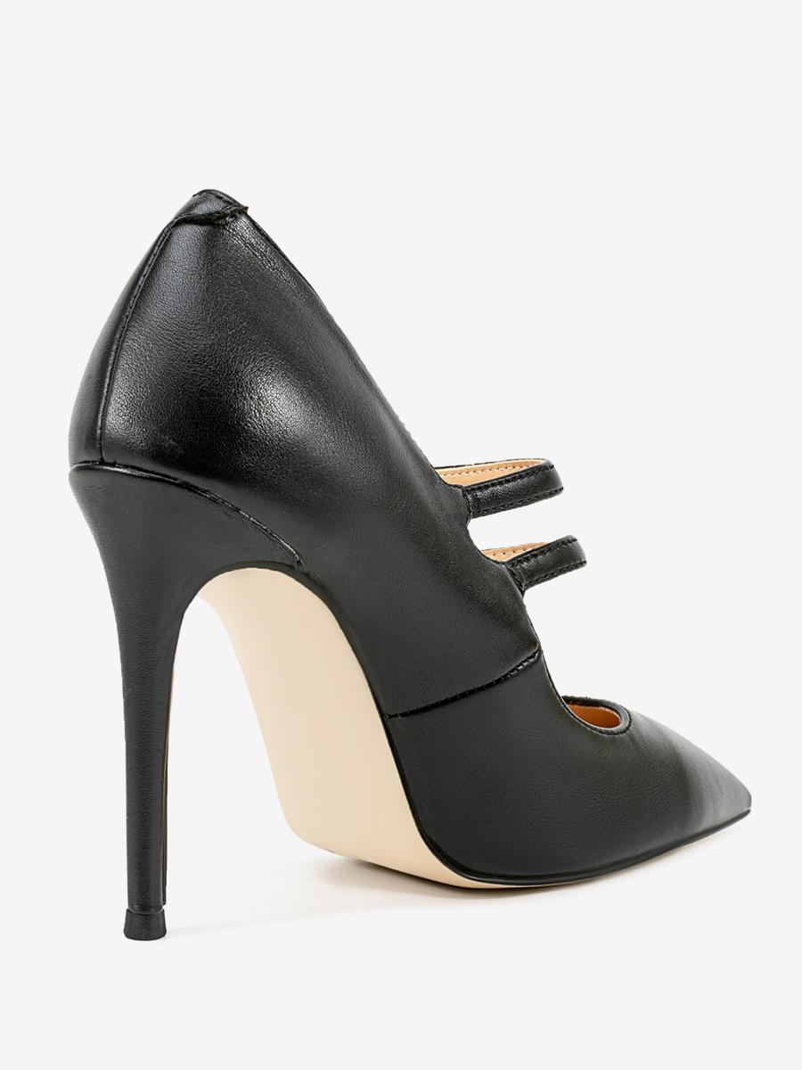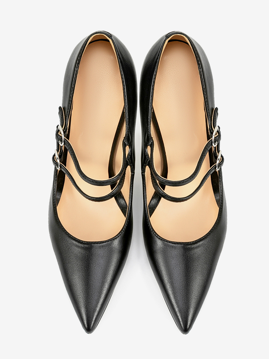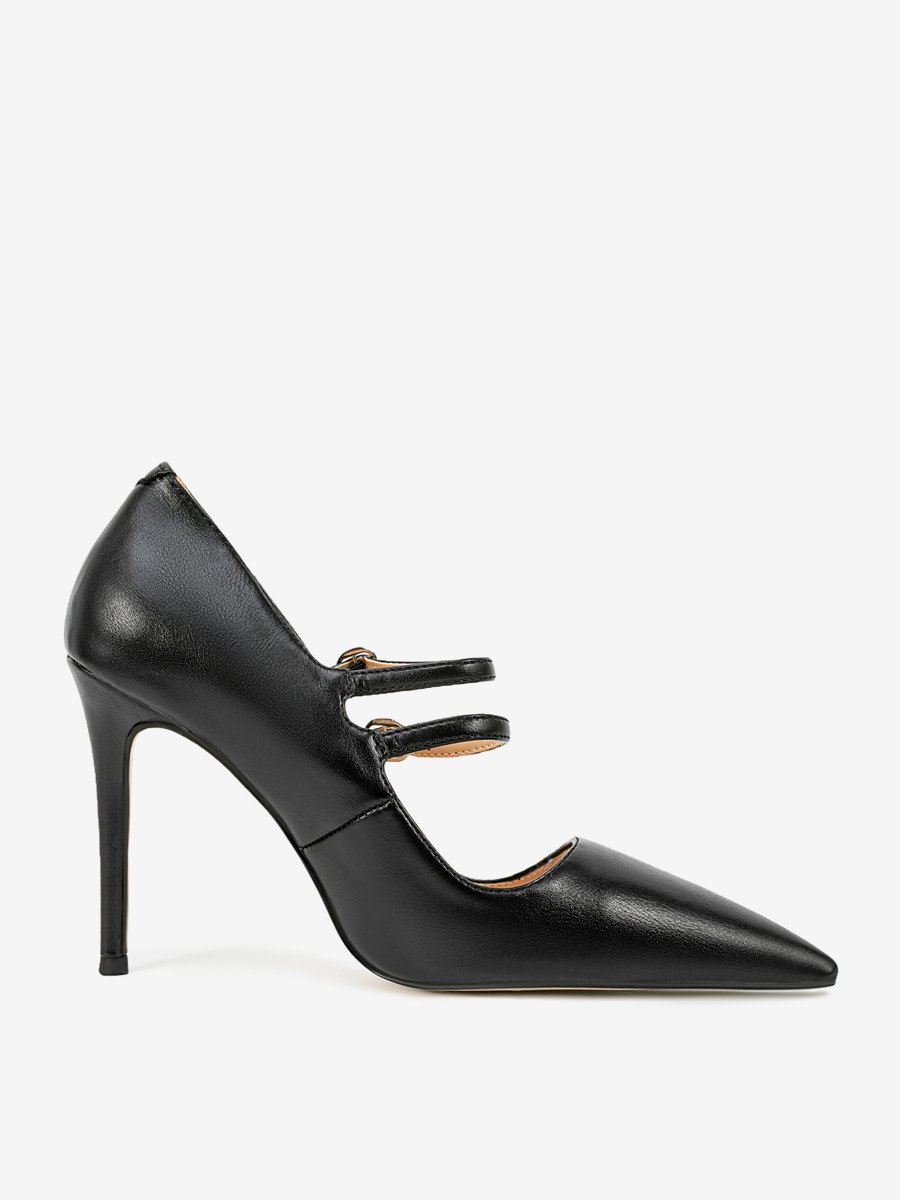 ブラックのメリージェーンシューズ、ポインテッドトゥ、スティレットヒールパンプス