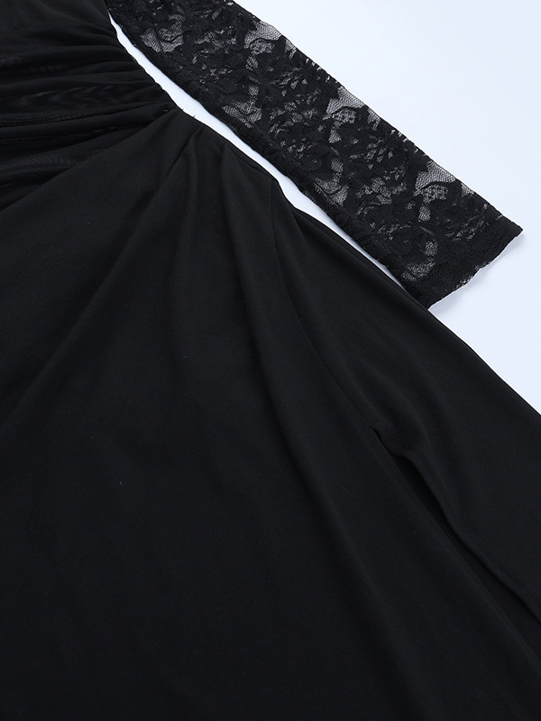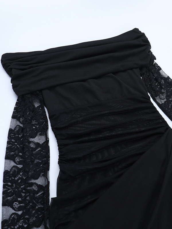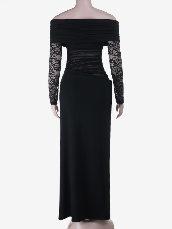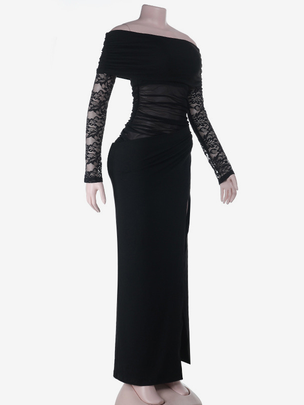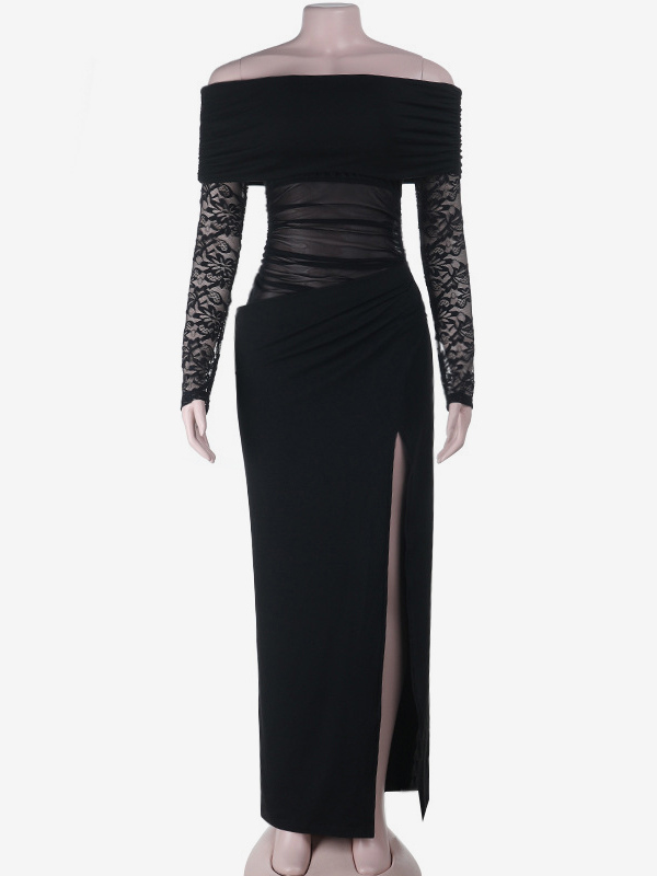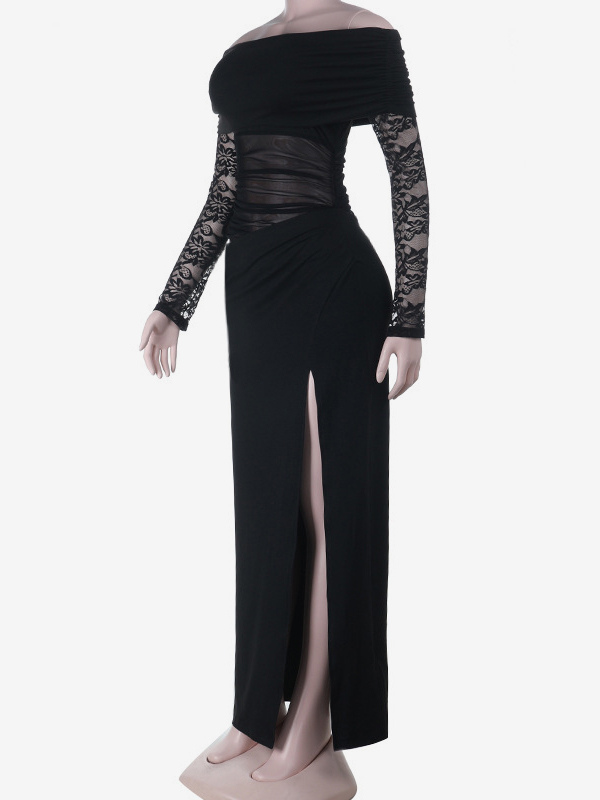 ブラック オフショルダー レディース マキシドレス - シースルー メッシュ ウエスト レーススリーブ ガウン - セクシーなハイスリット ボディコン ナイトアウト パーティーウェア 2026