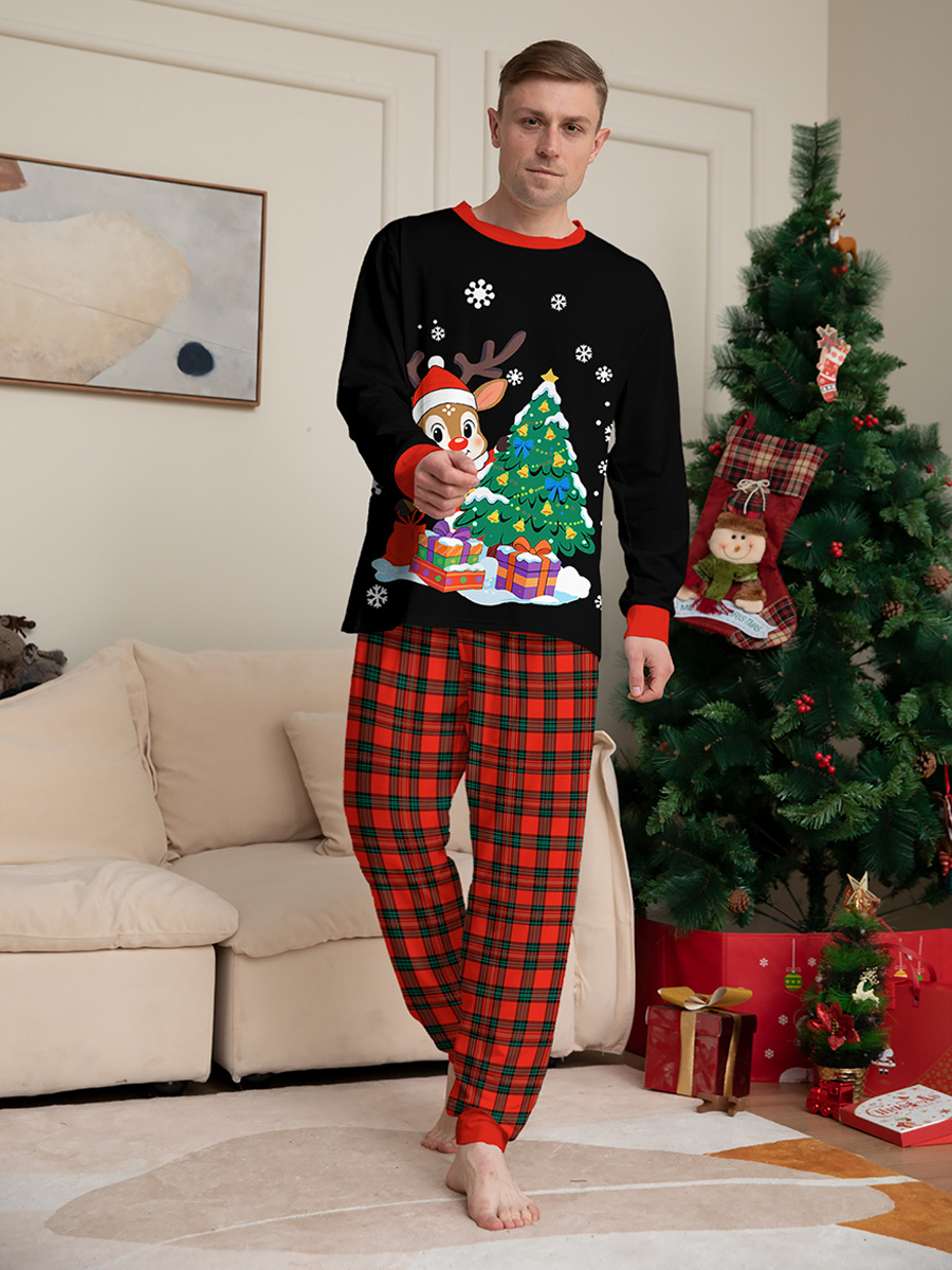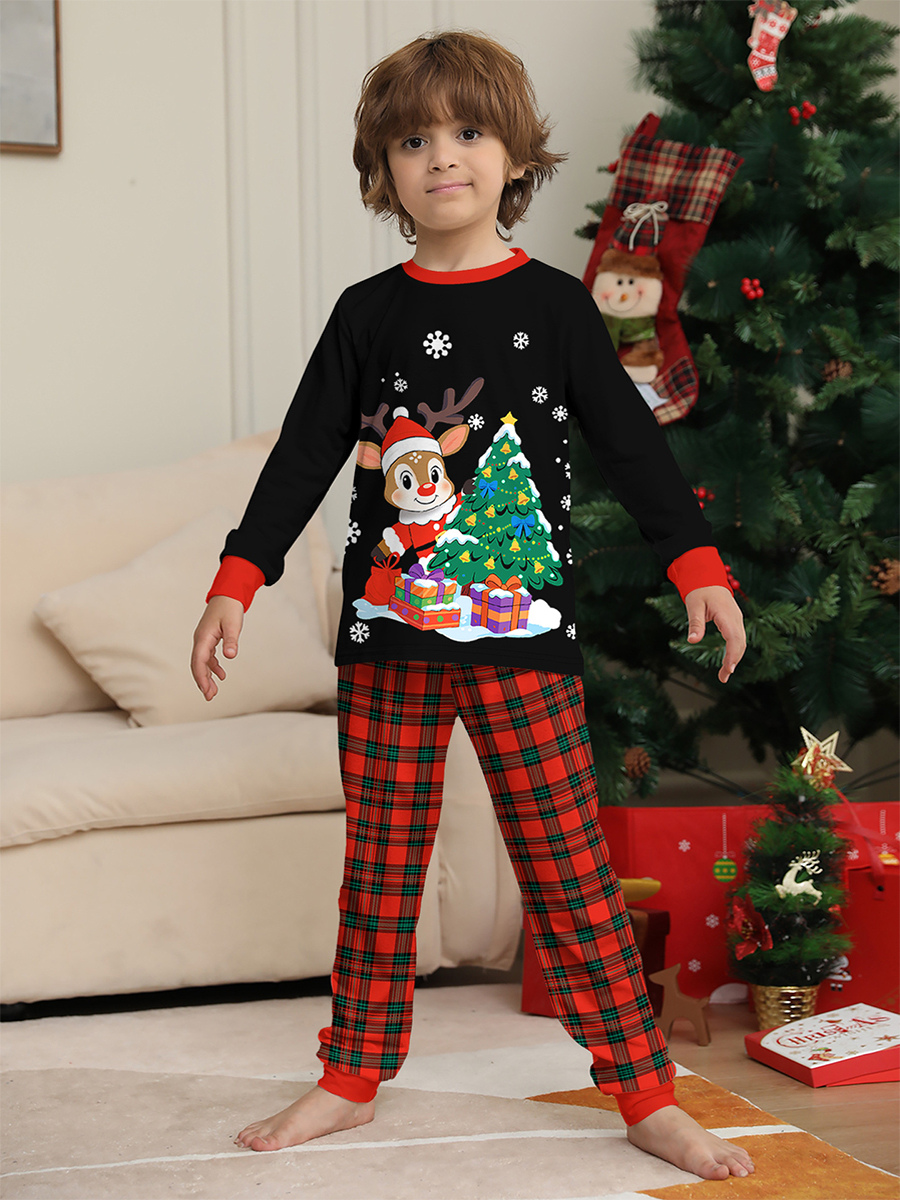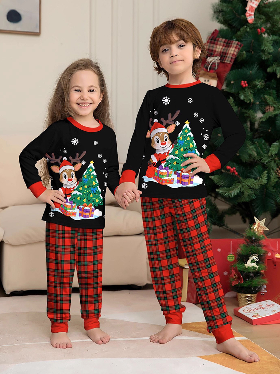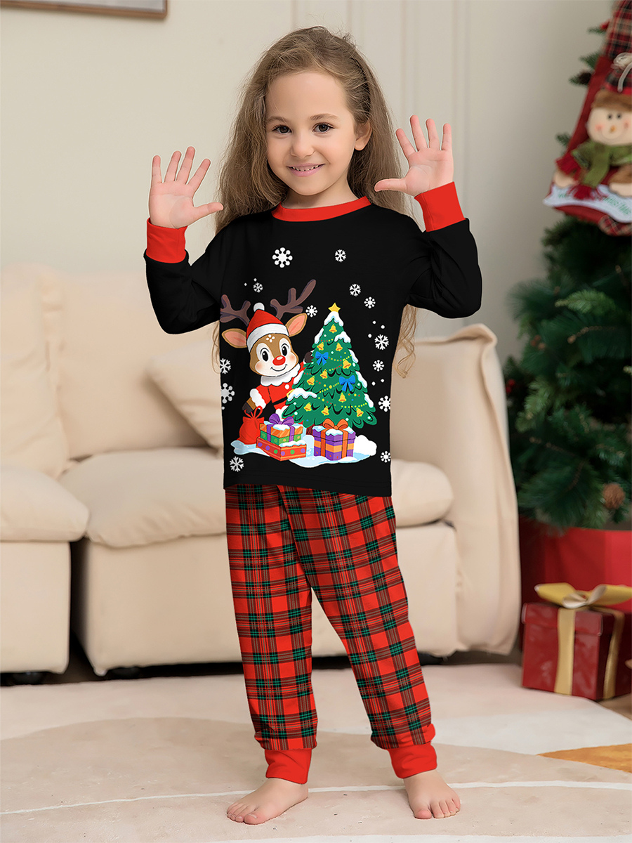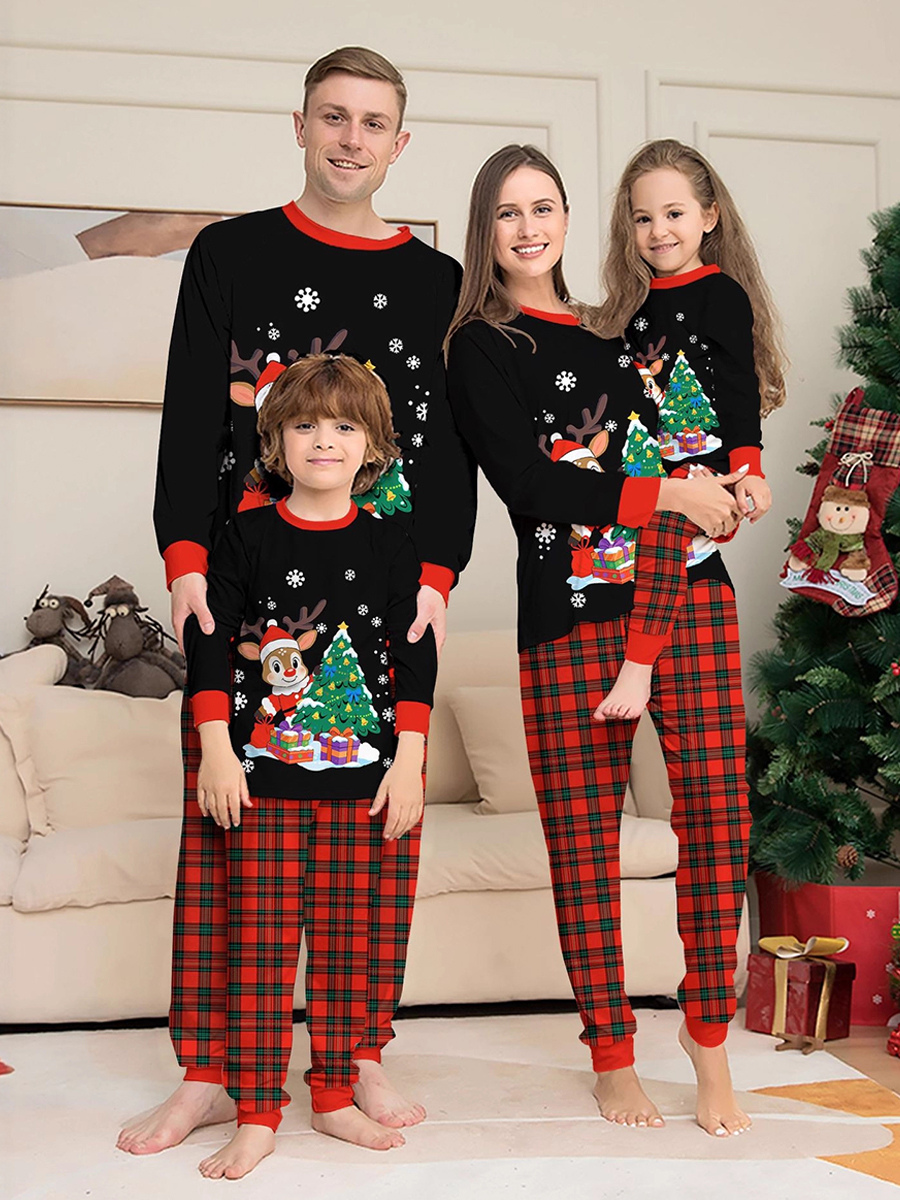 トナカイとツリーのプリントが施された黒と赤のチェック柄ファミリークリスマスパジャマ 2025