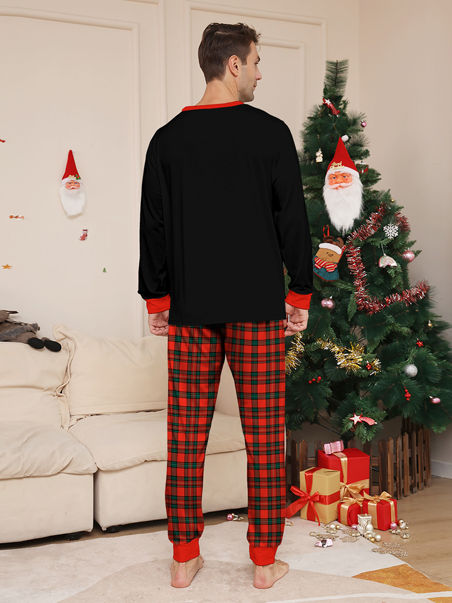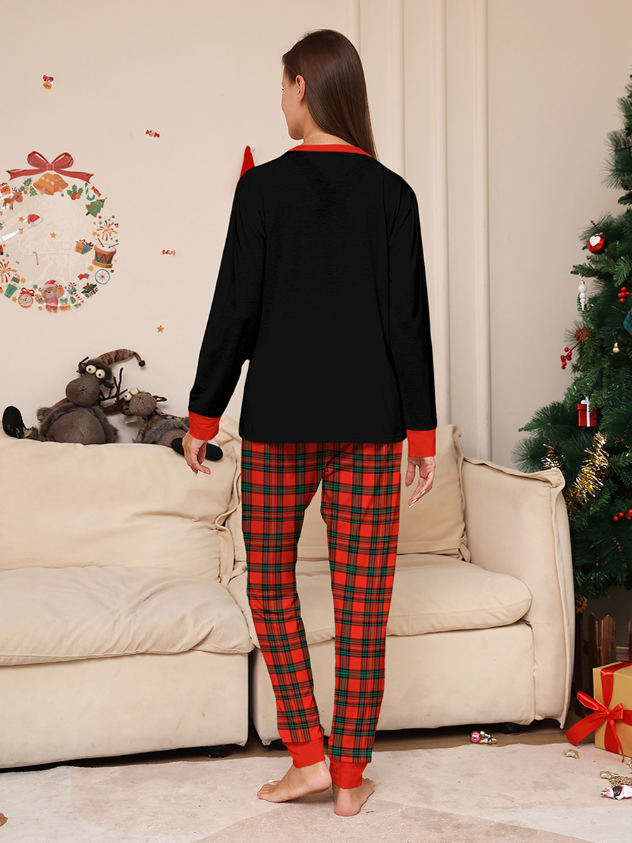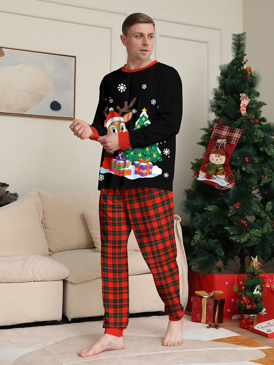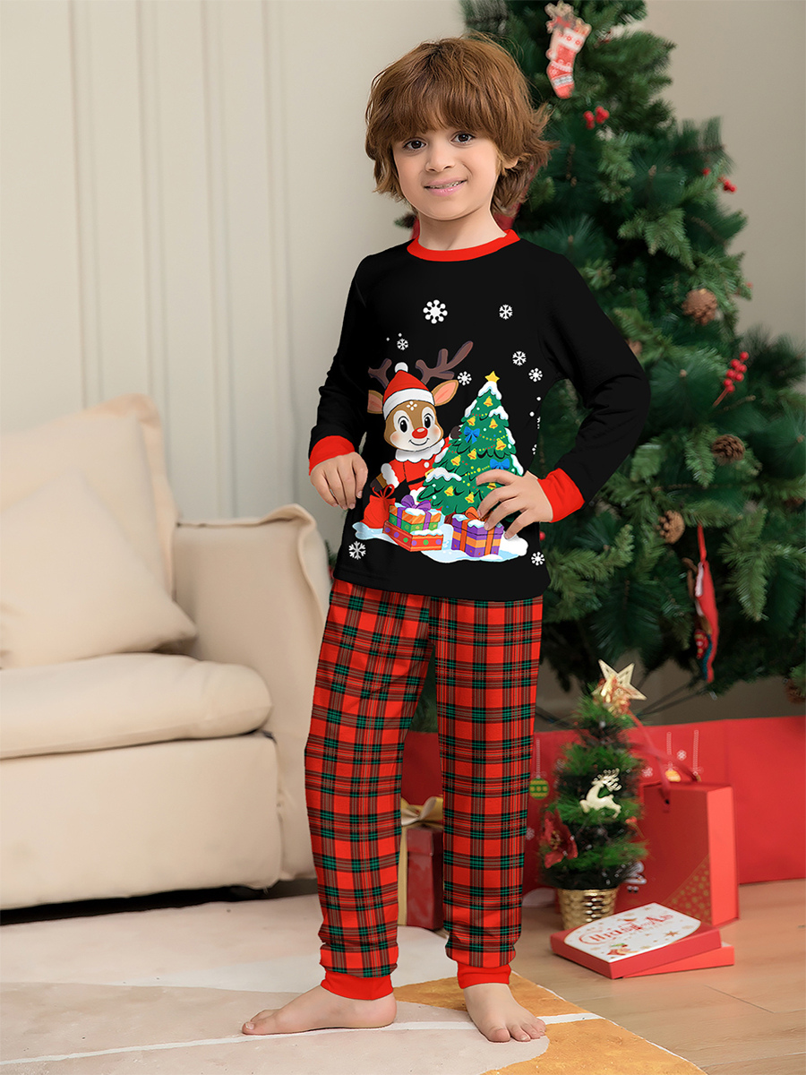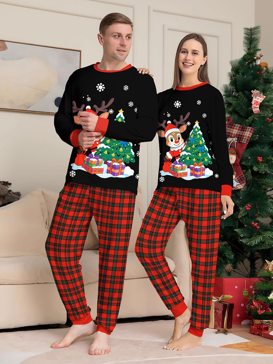 トナカイとツリーのプリントが施された黒と赤のチェック柄ファミリークリスマスパジャマ 2025