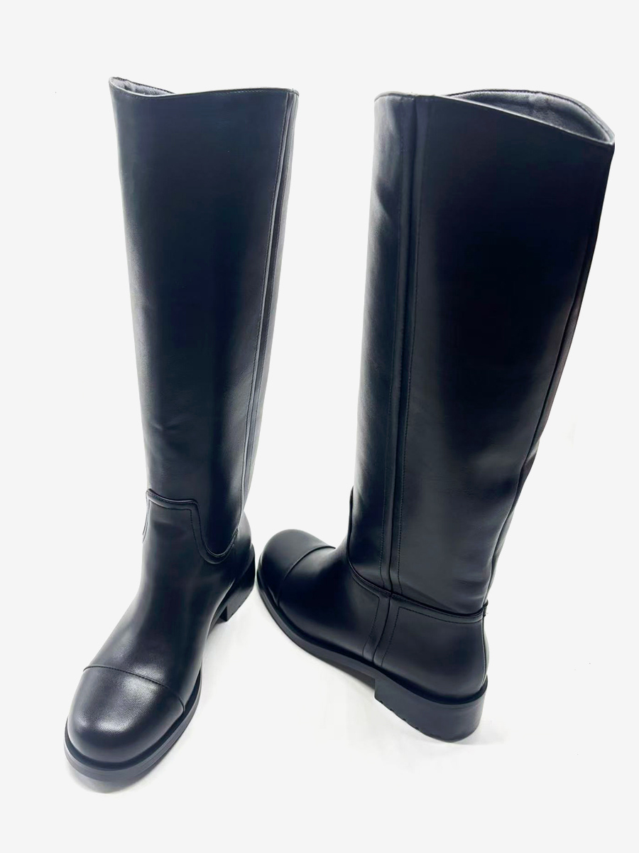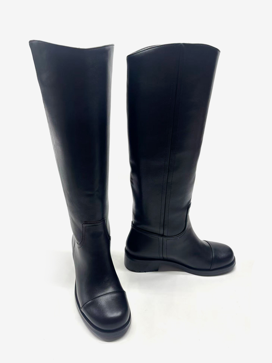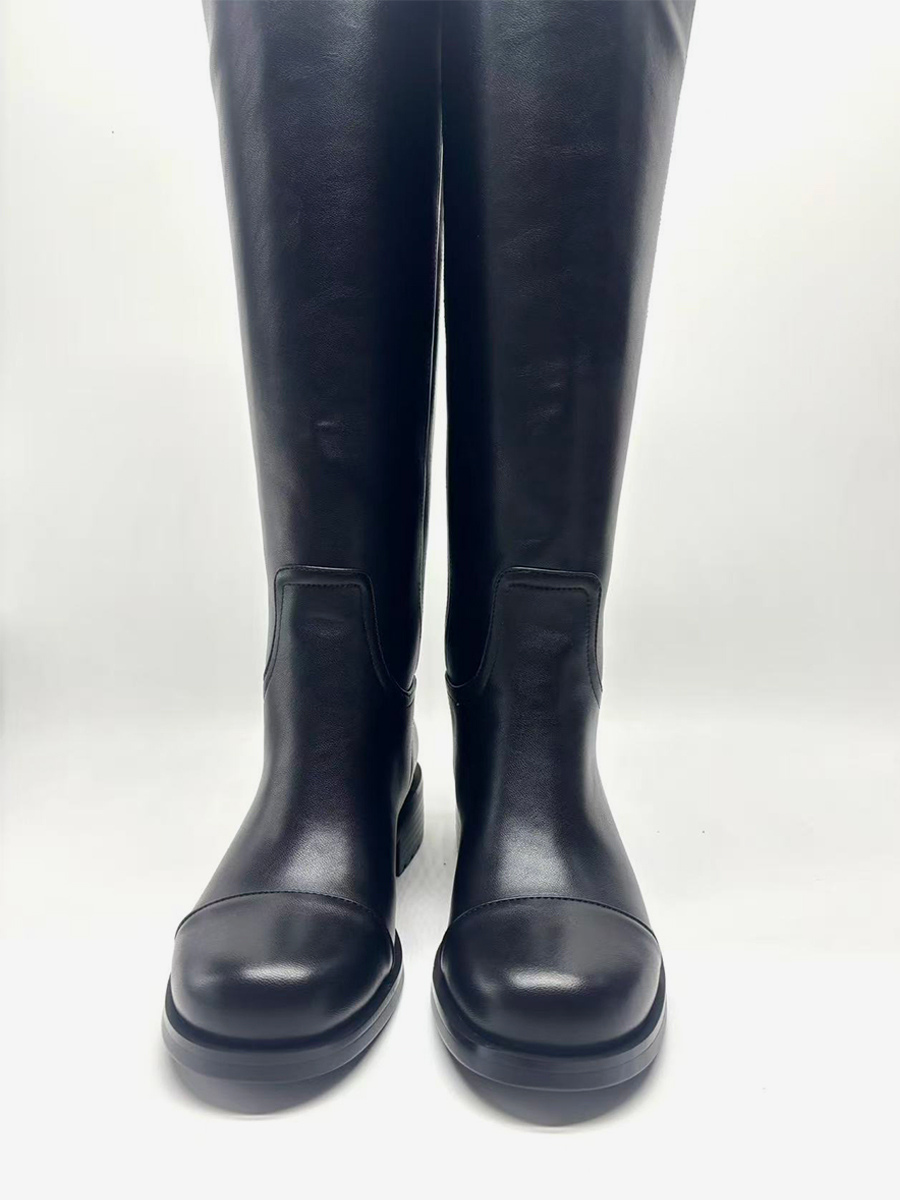 ブラック乗馬ブーツ レディース ラウンドトゥ フラットニーハイブーツ