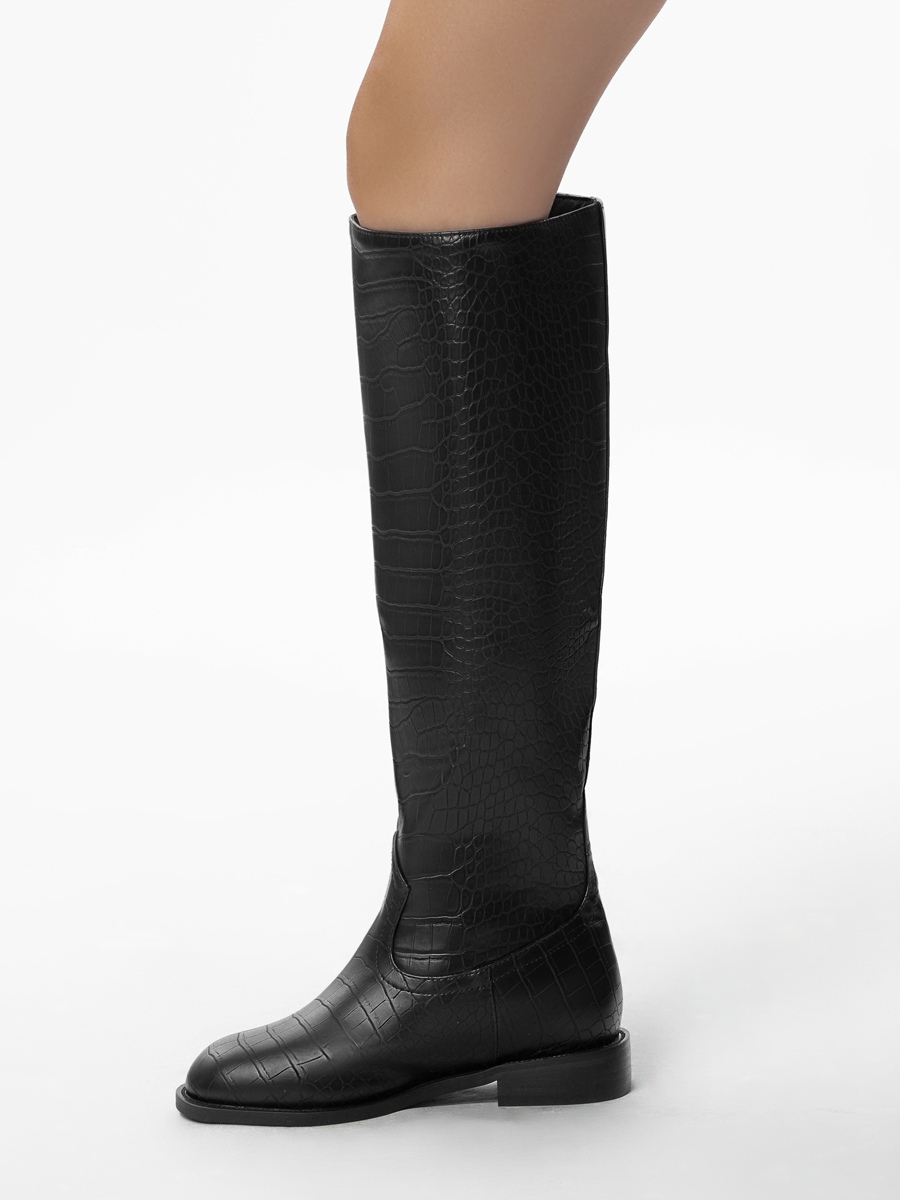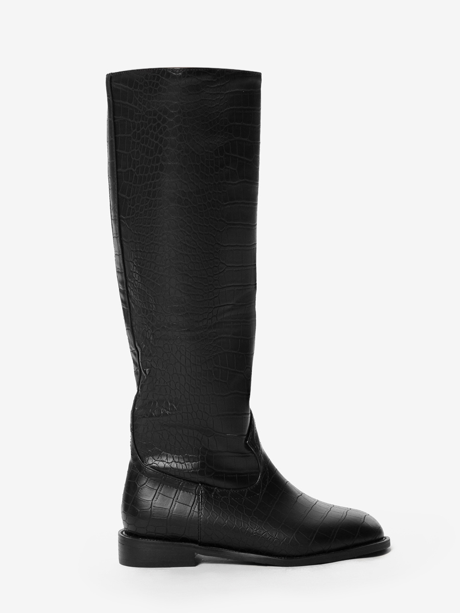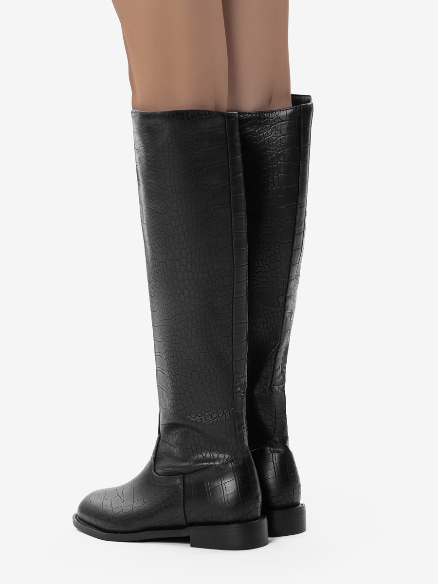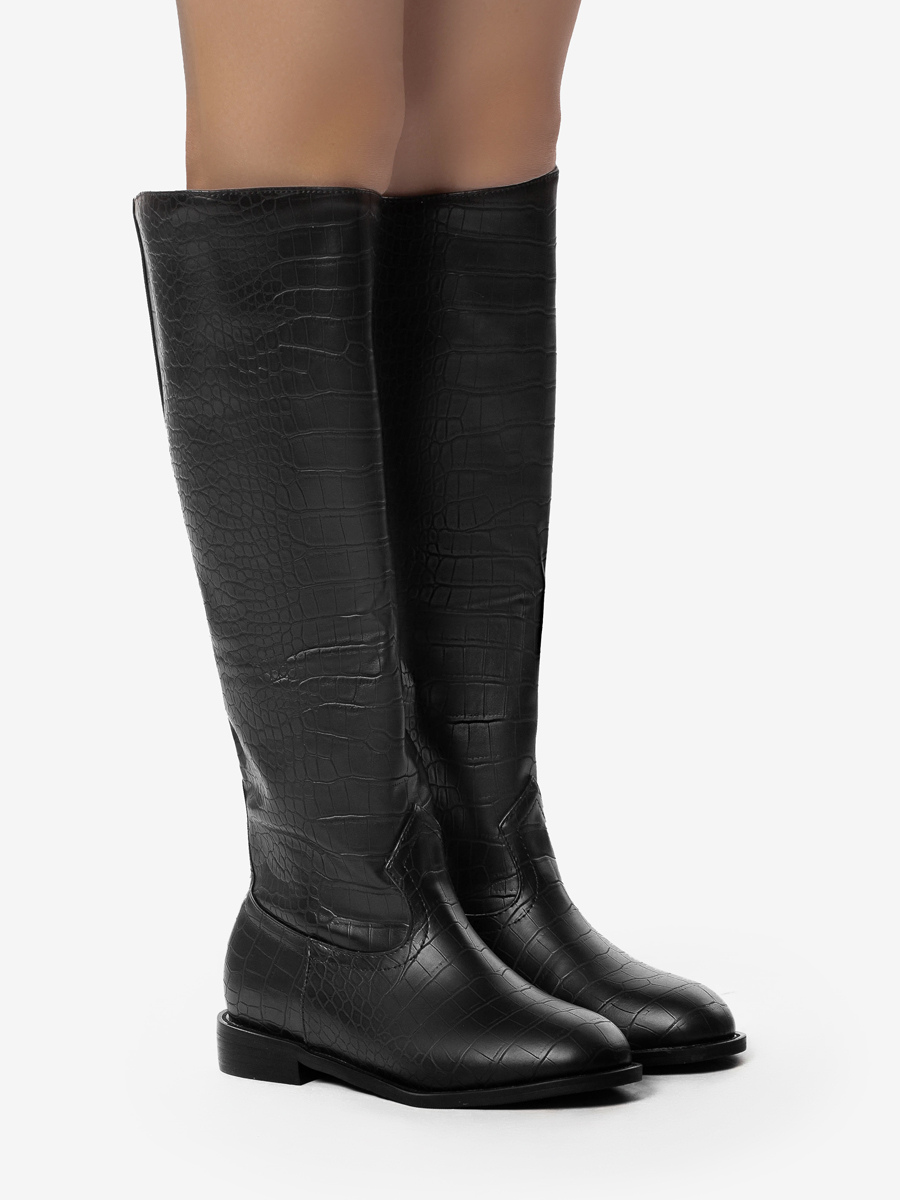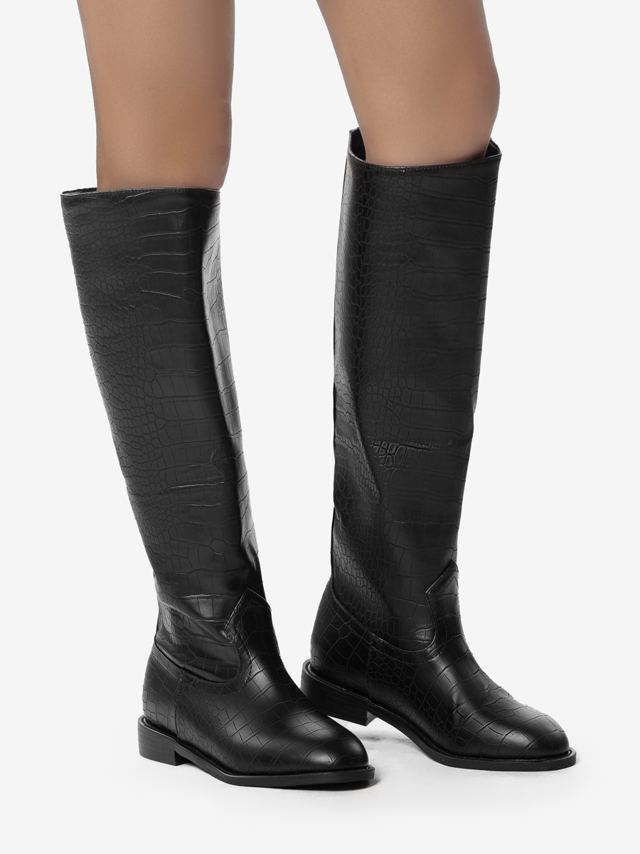 ブラック乗馬ブーツ レディース ラウンドトゥ ストーン柄 フラットニーハイブーツ