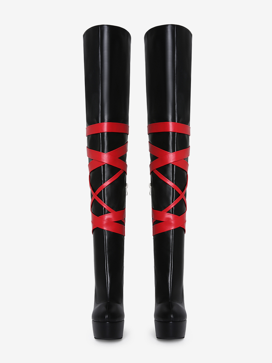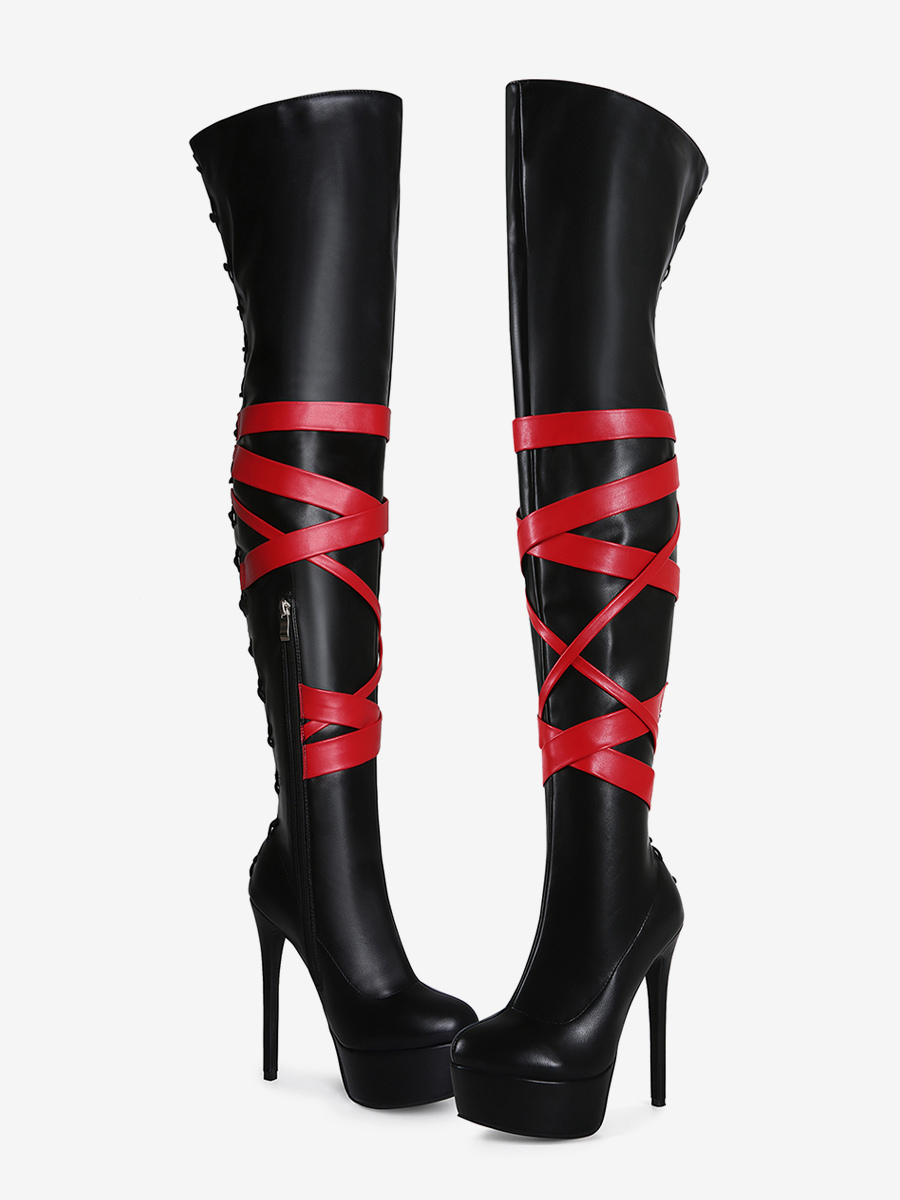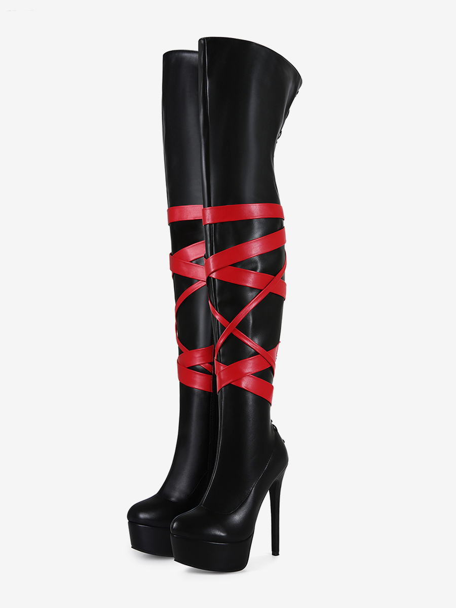 ブラックのセクシーなブーツ レディース プラットフォーム オープントゥ ハイヒール オーバーニーブーツ