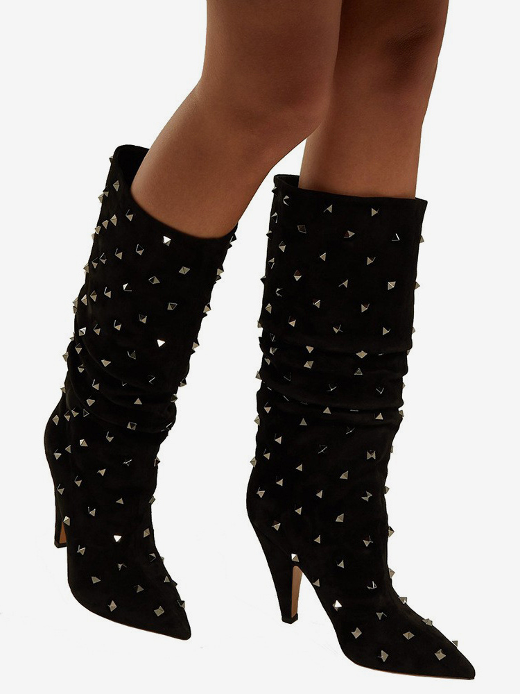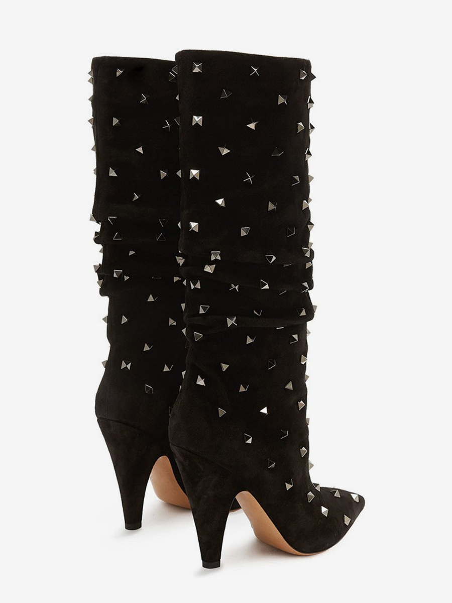 ブラック スラウチブーツ スエード ポインテッドトゥ スタッズ チャンキーヒール ミッドカーフブーツ