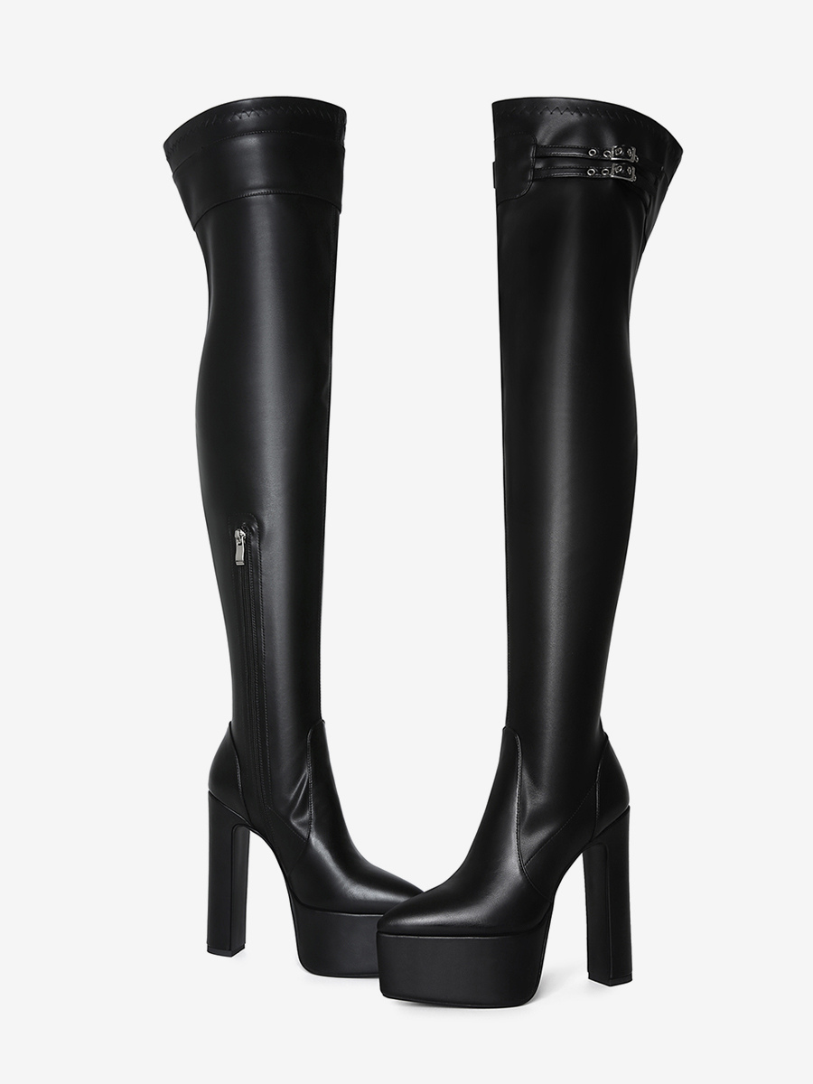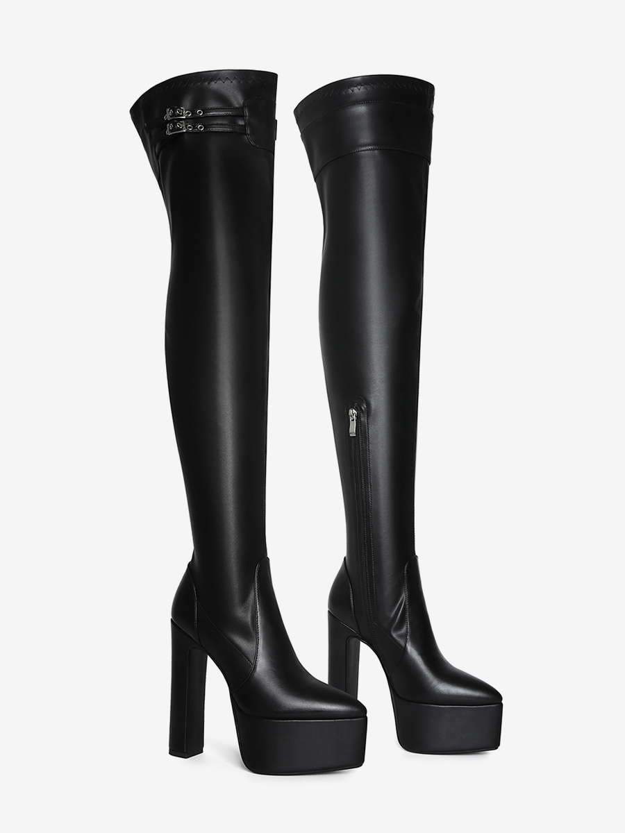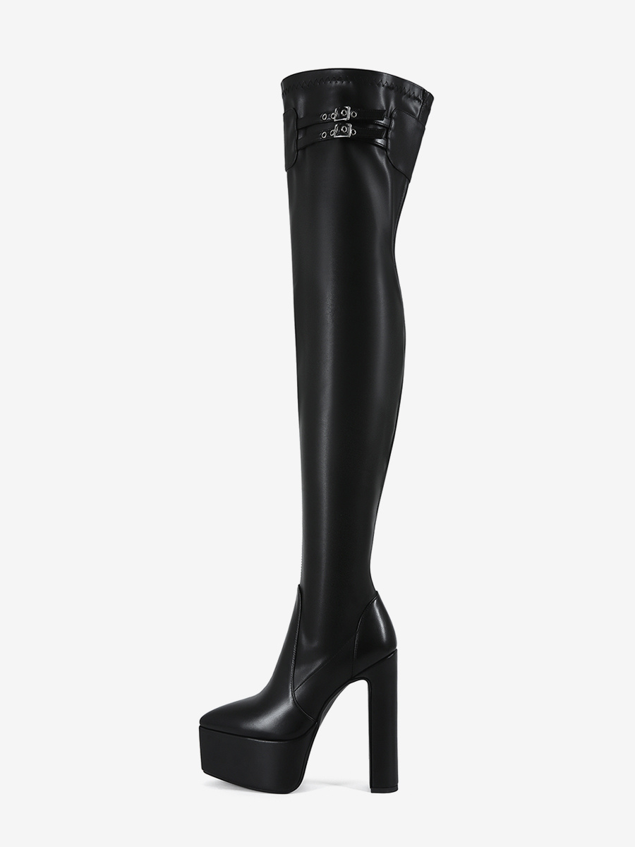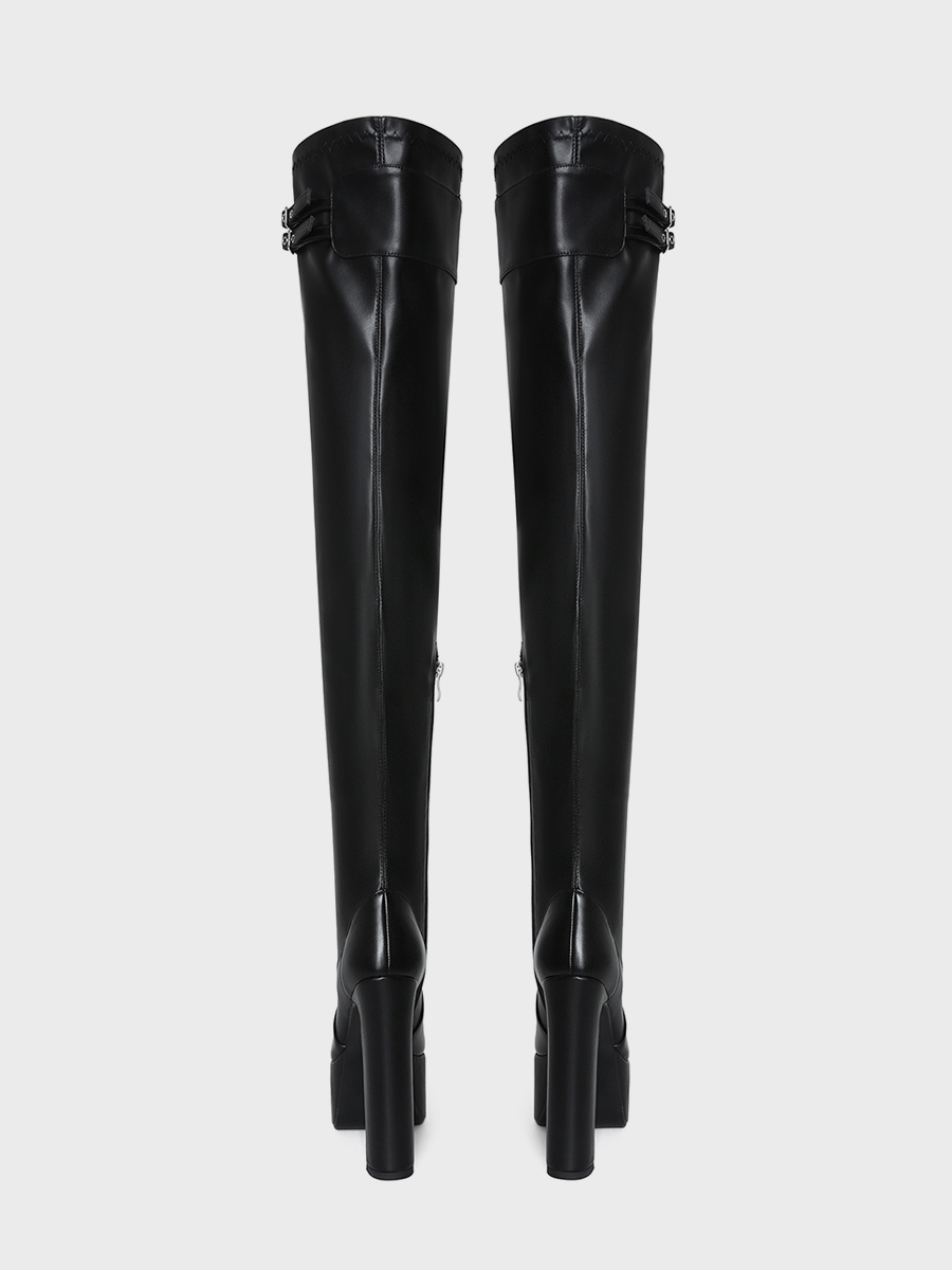 ブラックのサイハイブーツ、プラットフォームバックルディテール、チャンキーヒール、オーバーニーブーツ
