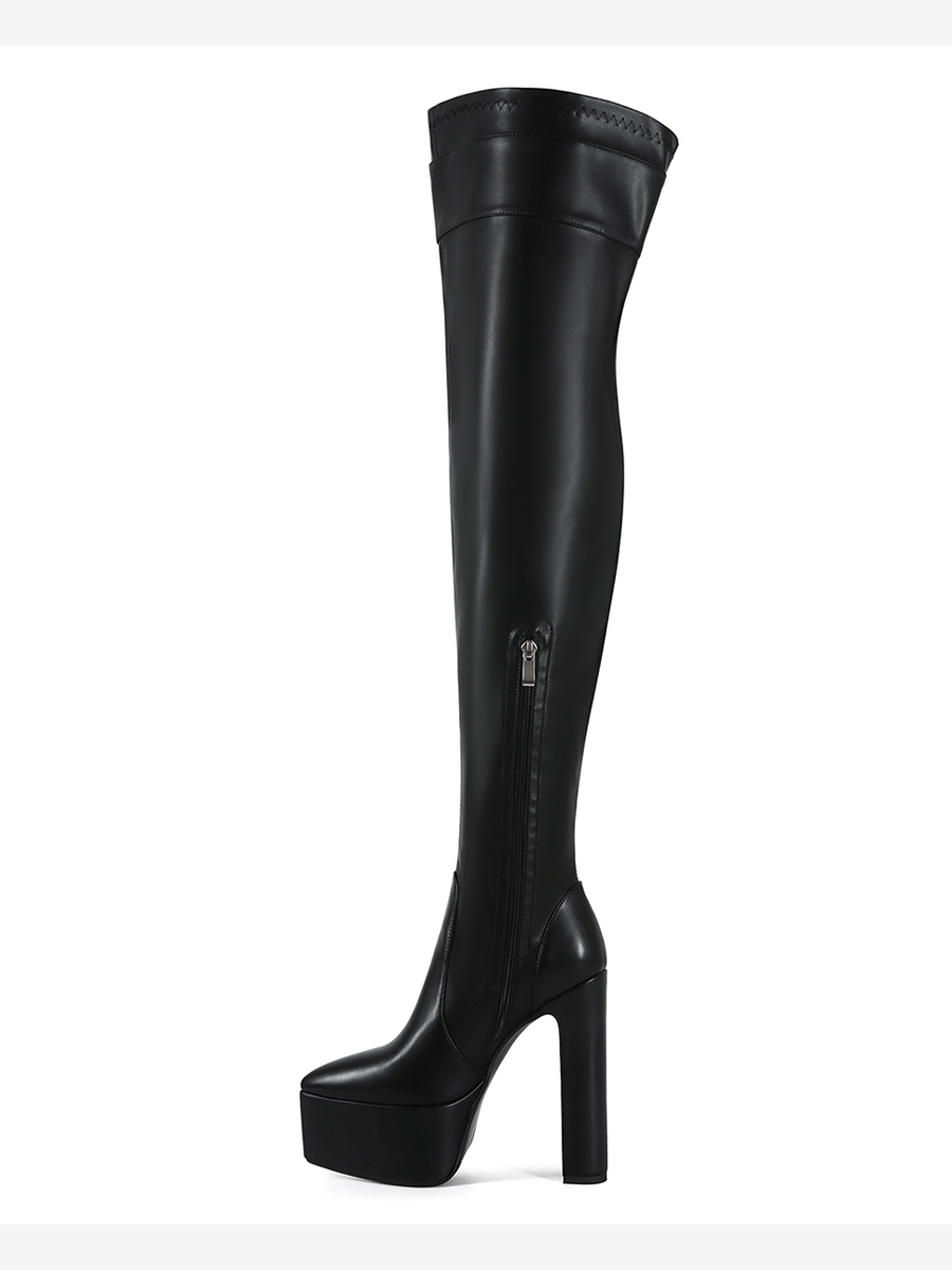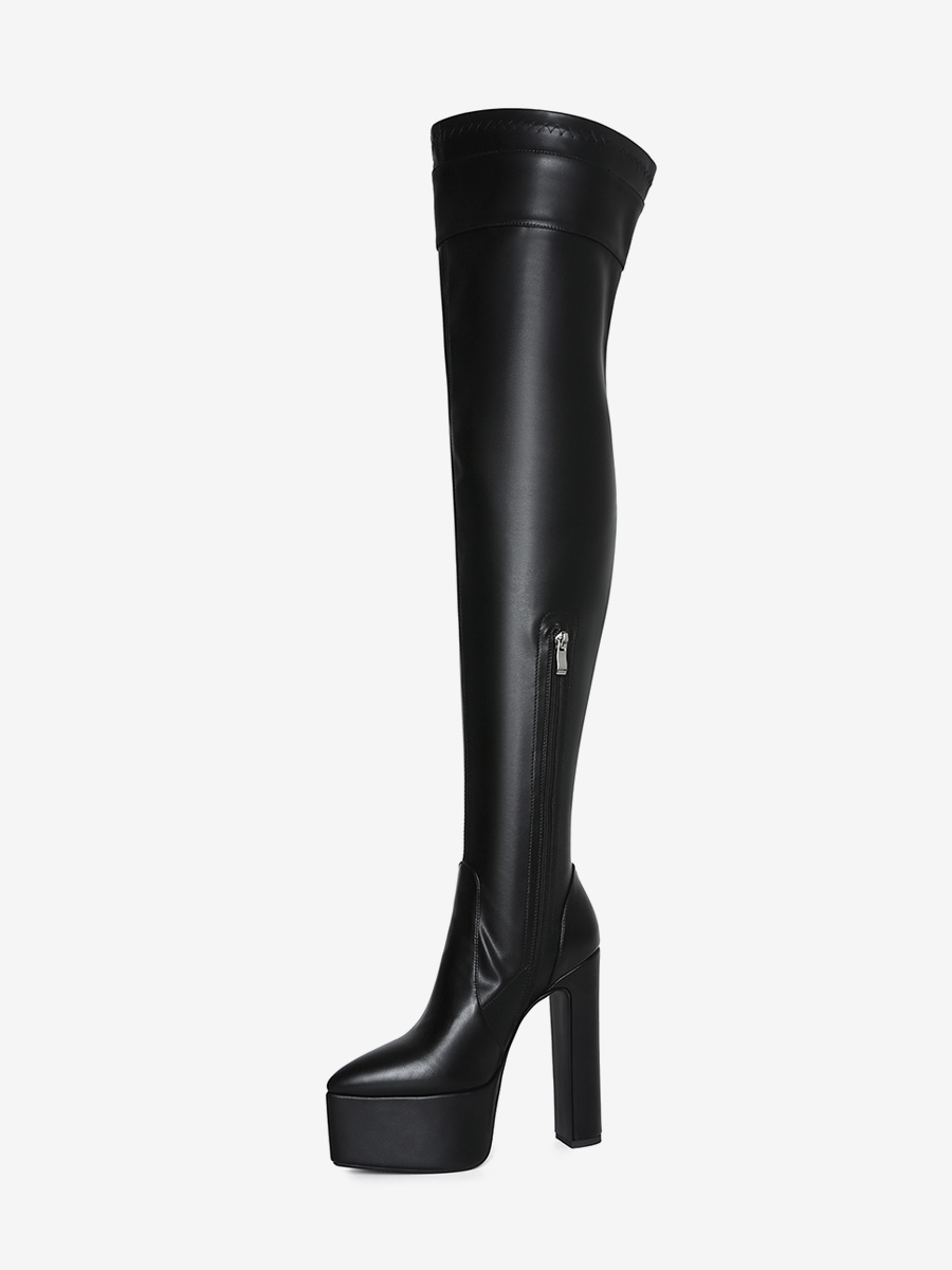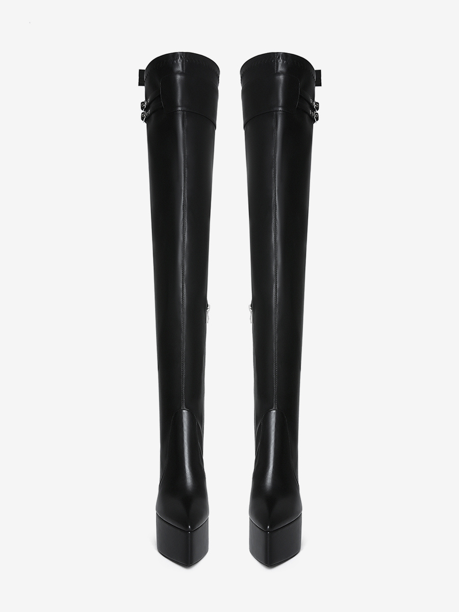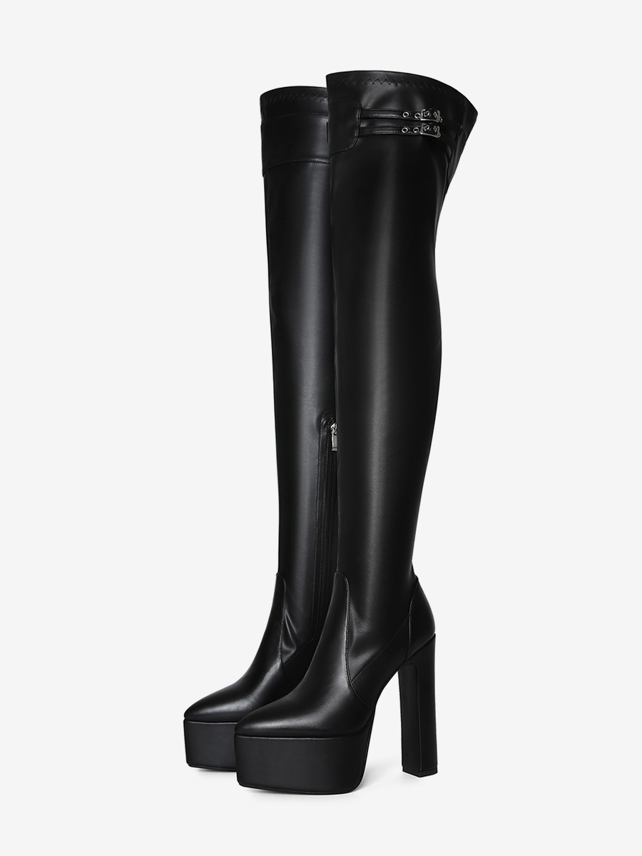 ブラックのサイハイブーツ、プラットフォームバックルディテール、チャンキーヒール、オーバーニーブーツ