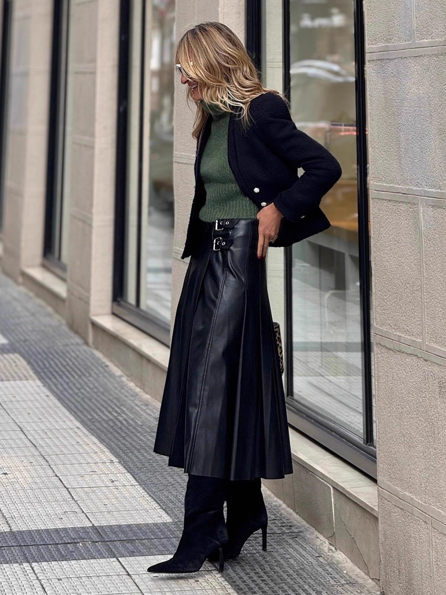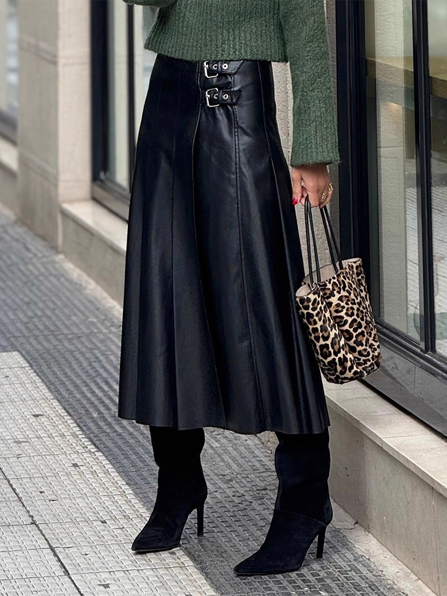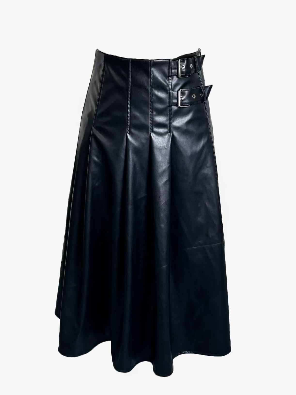 ダブルバックル付きブラックヴィンテージプリーツフェイクレザーミディスカート(レディース)2026