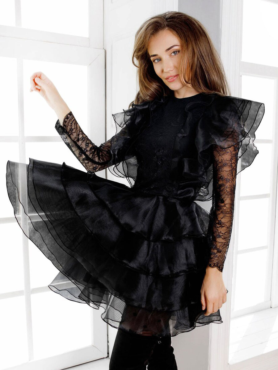 黒のウェディングドレスレース A ライン長袖ショートブライダルドレス無料カスタマイズ