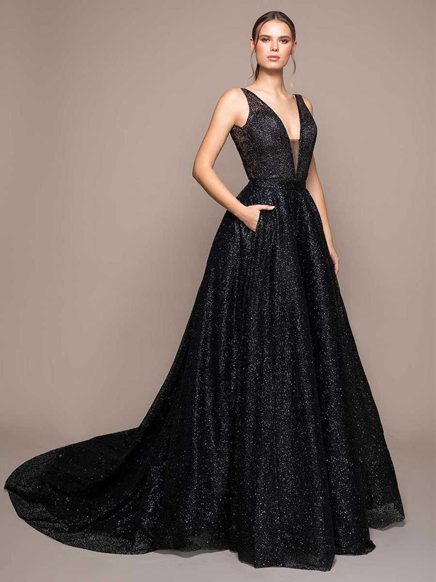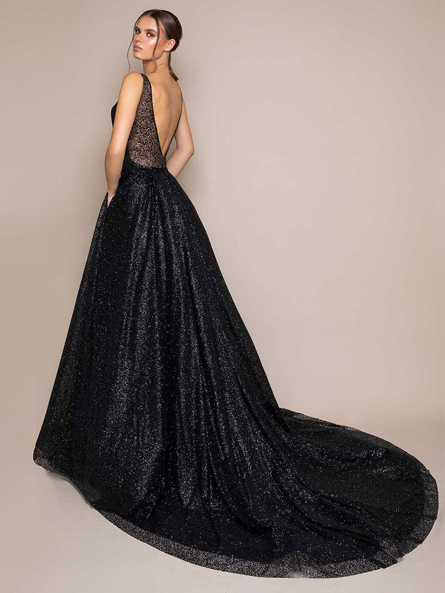 黒のウェディングドレス レース A ライン ノースリーブ ポケット コート トレイン ブライダル ドレス無料カスタマイズ