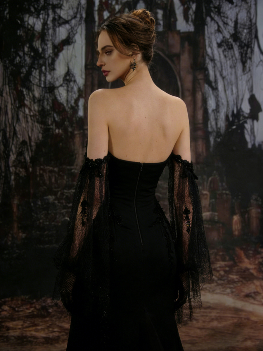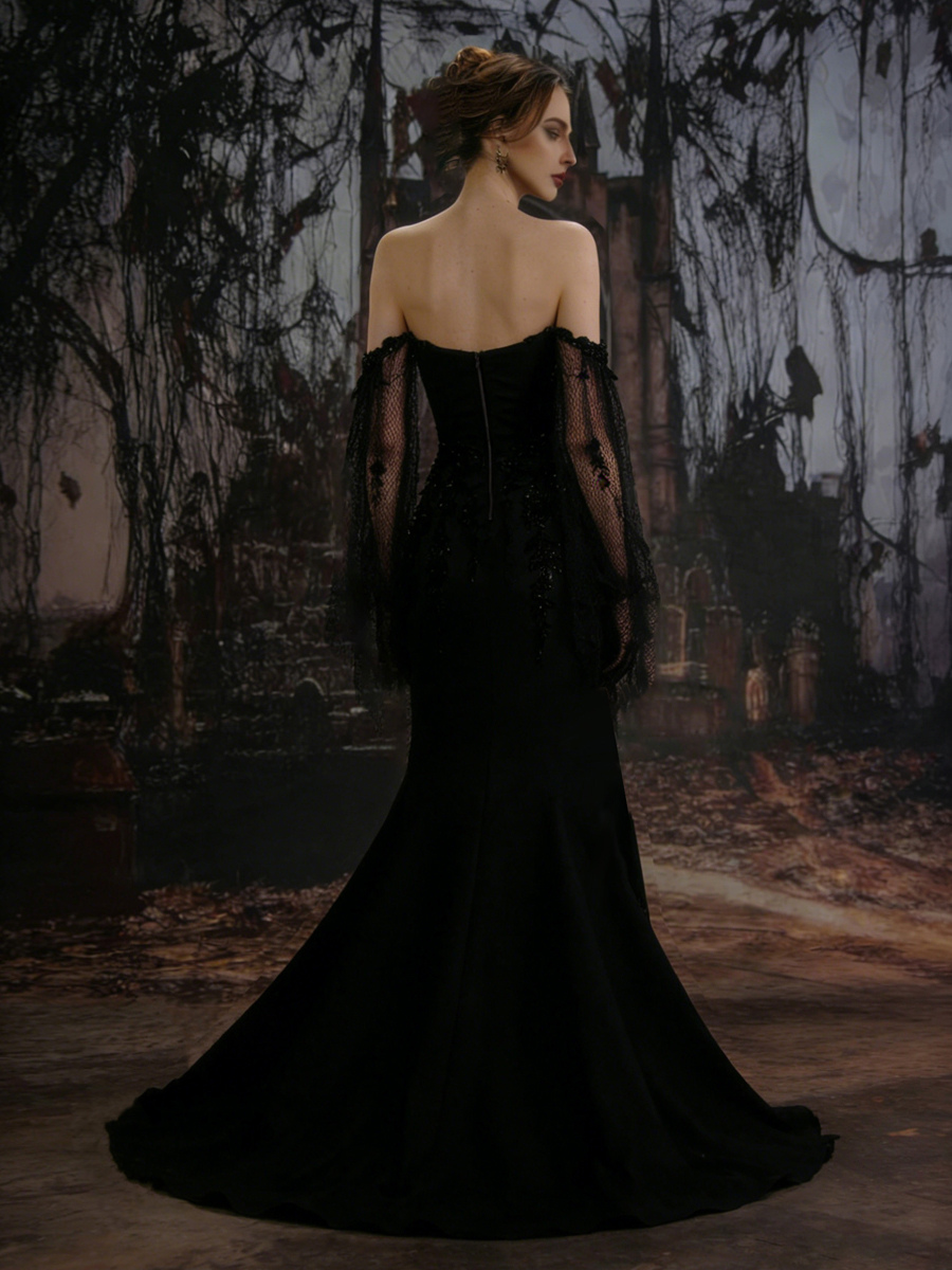 ブラックウェディングドレス サテン生地 マーメイドライン ロングスリーブ ナチュラルウエスト スパンコール トレーン付き ブライダルガウン