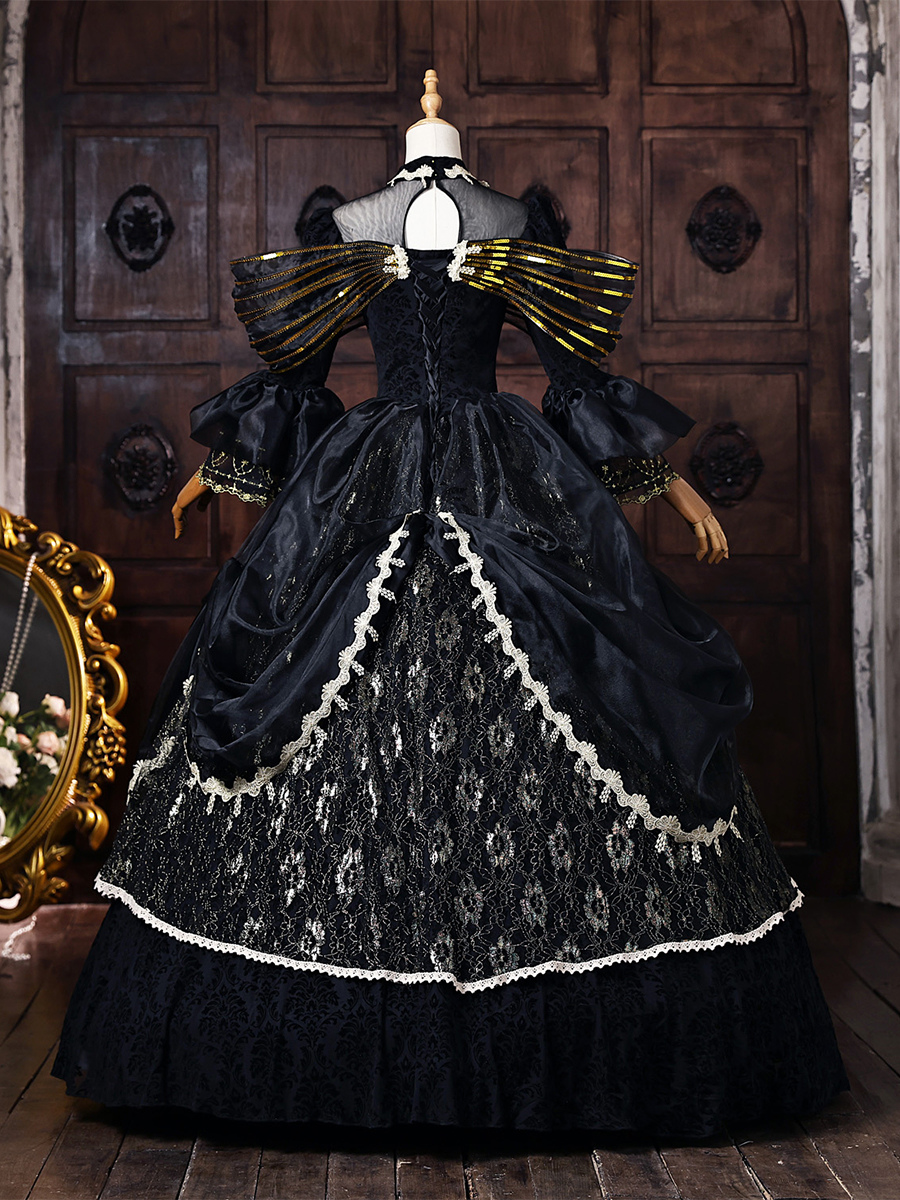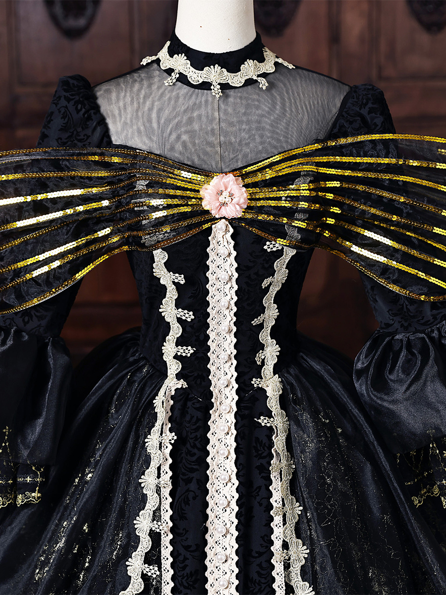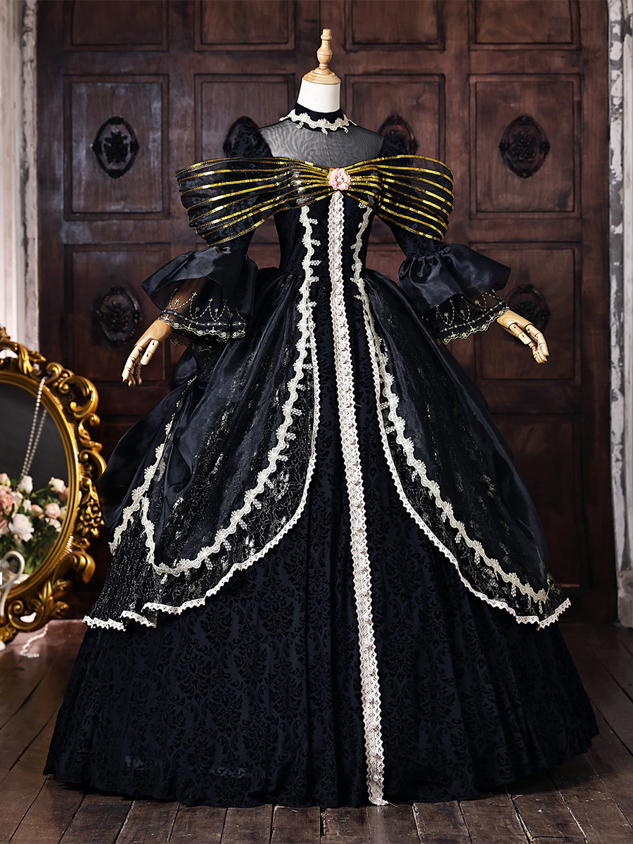 黒のヴィクトリアンロココ調ドレス、金色のリボン、フレア袖、レース、ヴィンテージレトロドレス