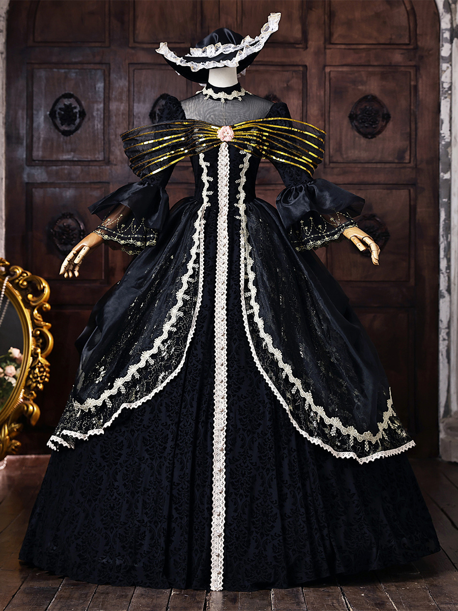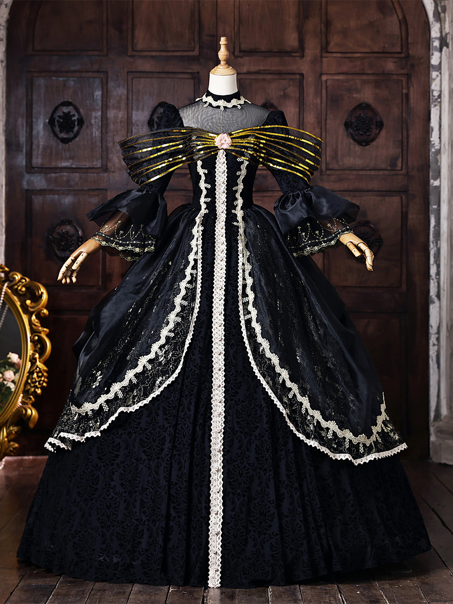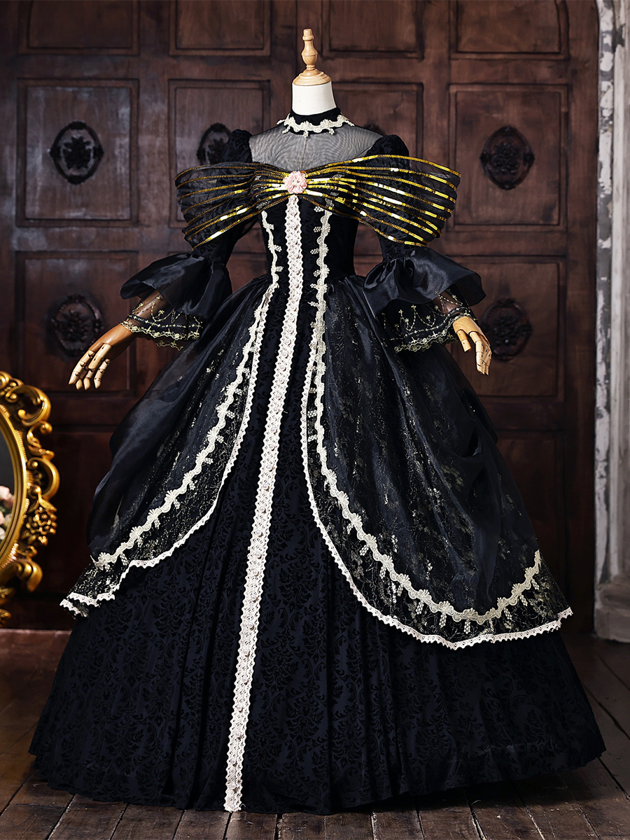 黒のヴィクトリアンロココ調ドレス、金色のリボン、フレア袖、レース、ヴィンテージレトロドレス