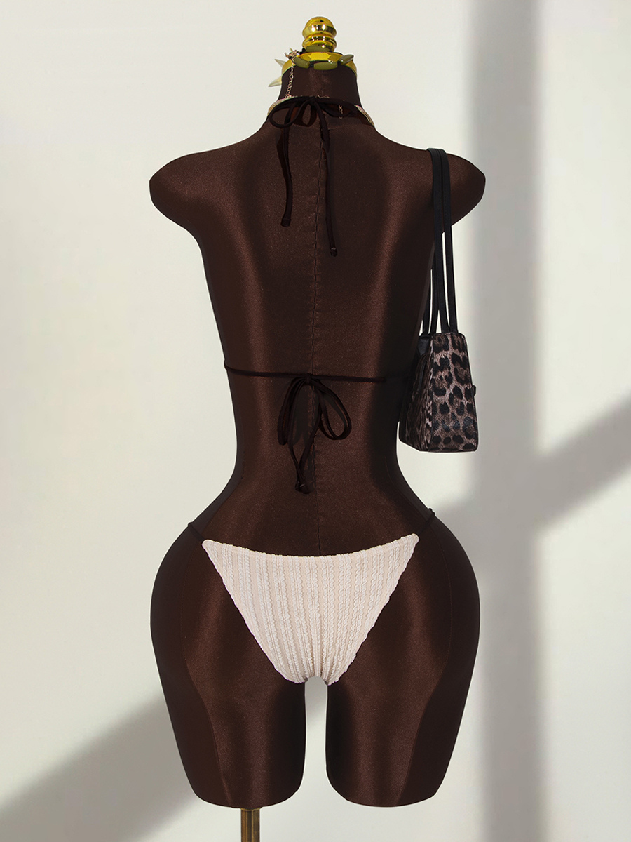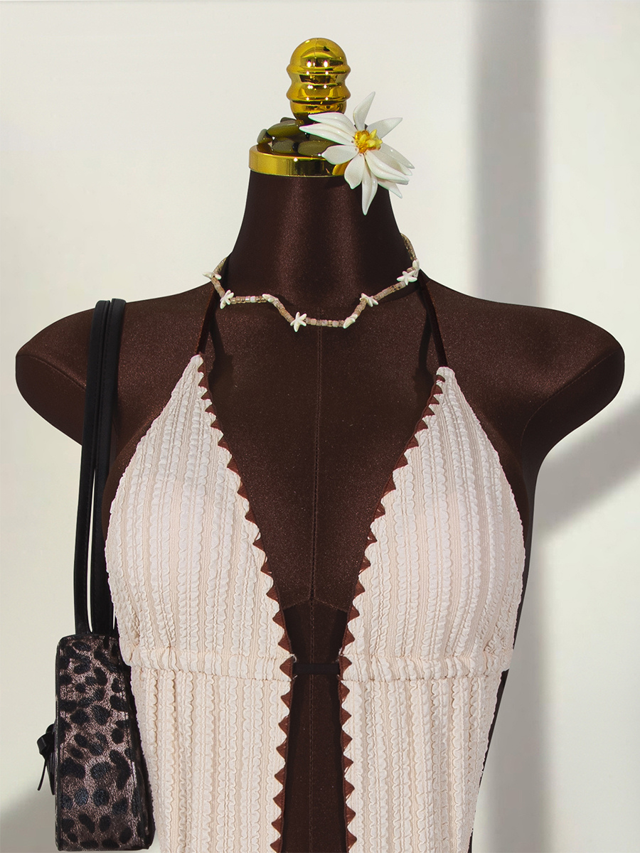 ボヘミアン風ワンピース水着(女性用) - クリーム色のテクスチャード加工ホルターネックモノキニ、深いVネック、ブラウンのリックラックトリム付き - 2026年夏ビーチ