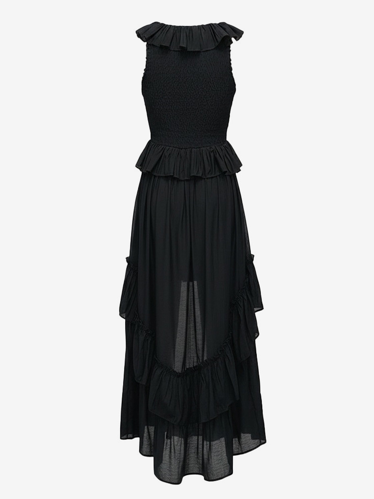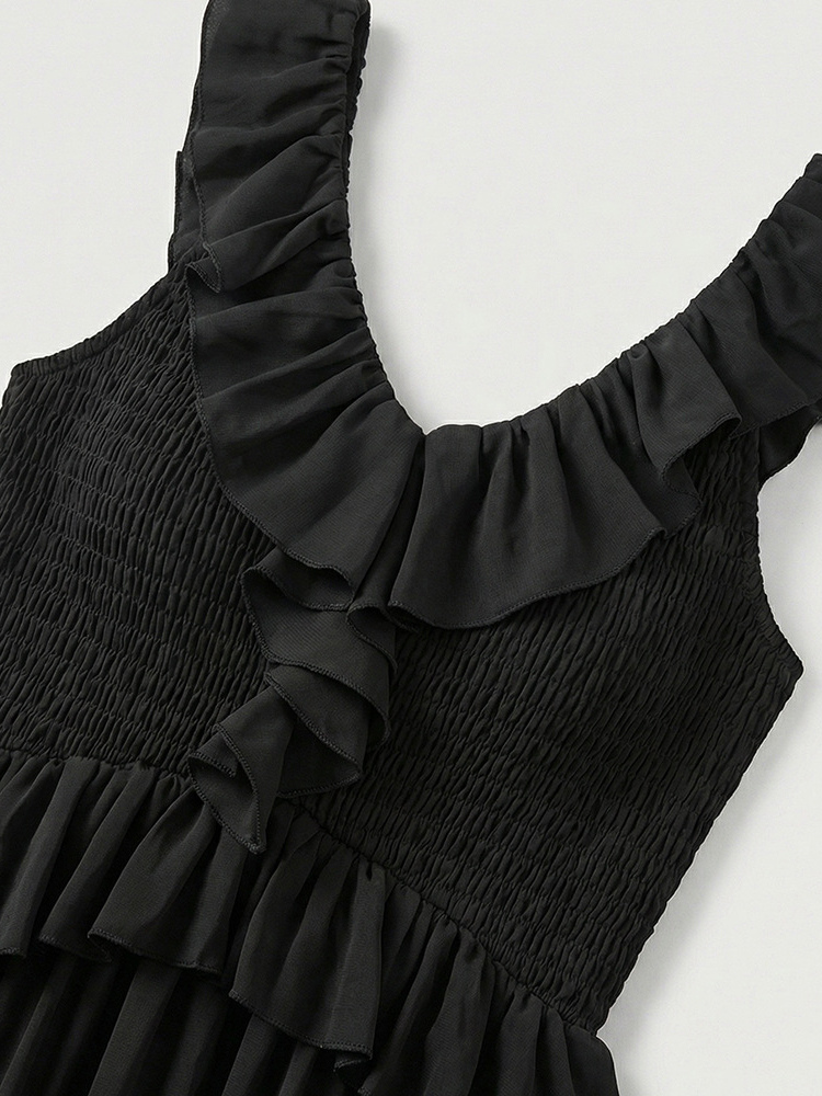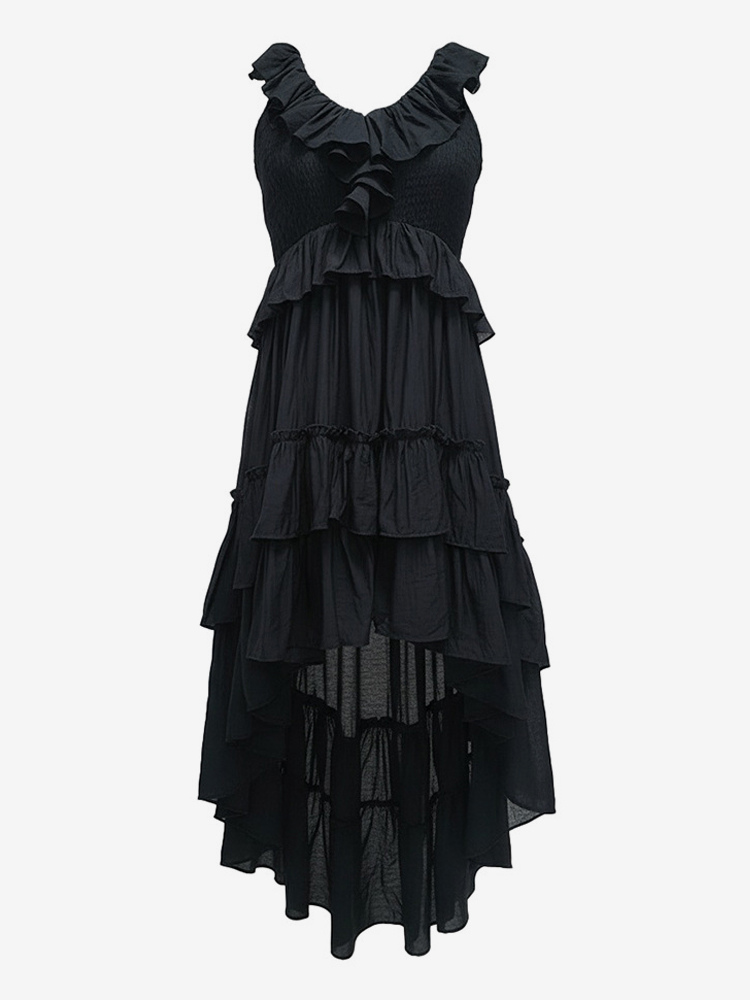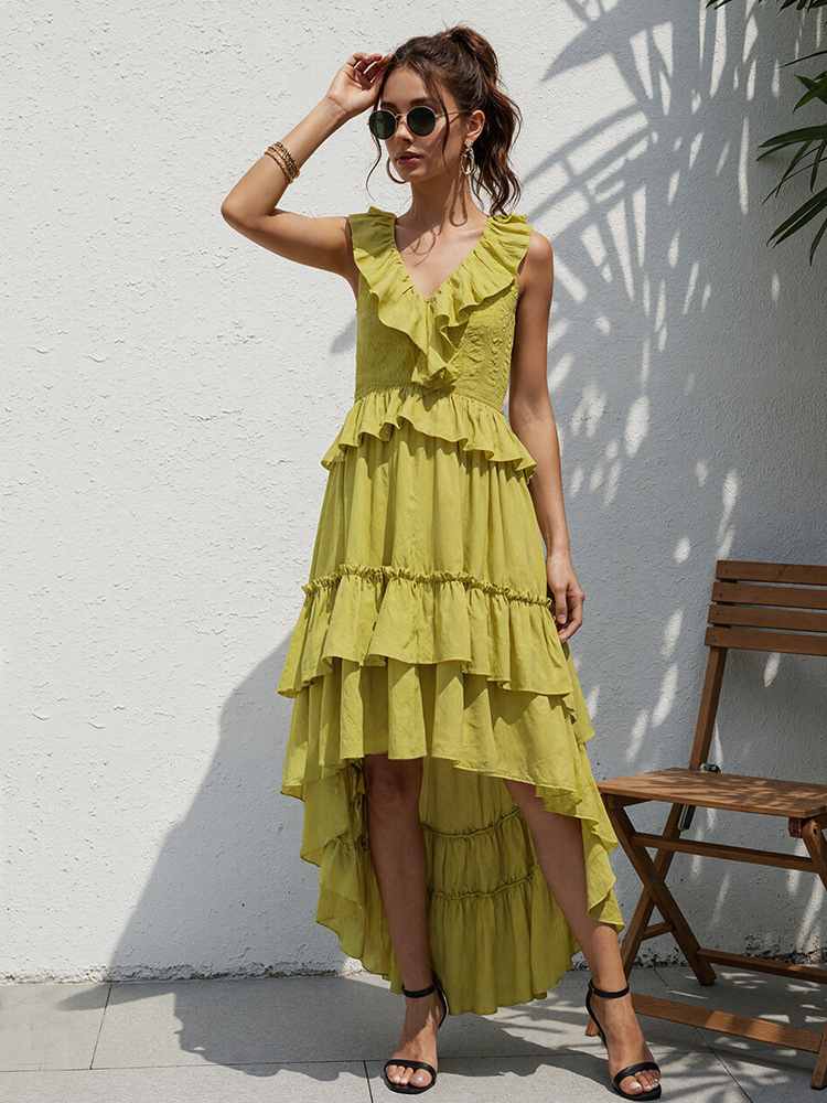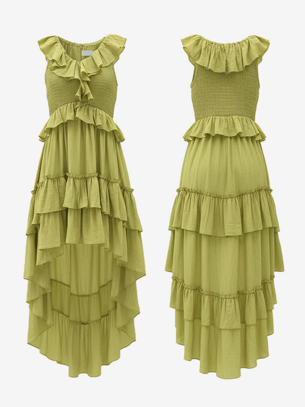 ボヘミアン風フリル付きハイローサマードレス(レディース) - スモックVネックノースリーブティアードフローリーミディドレス - 夏のビーチバケーション2026