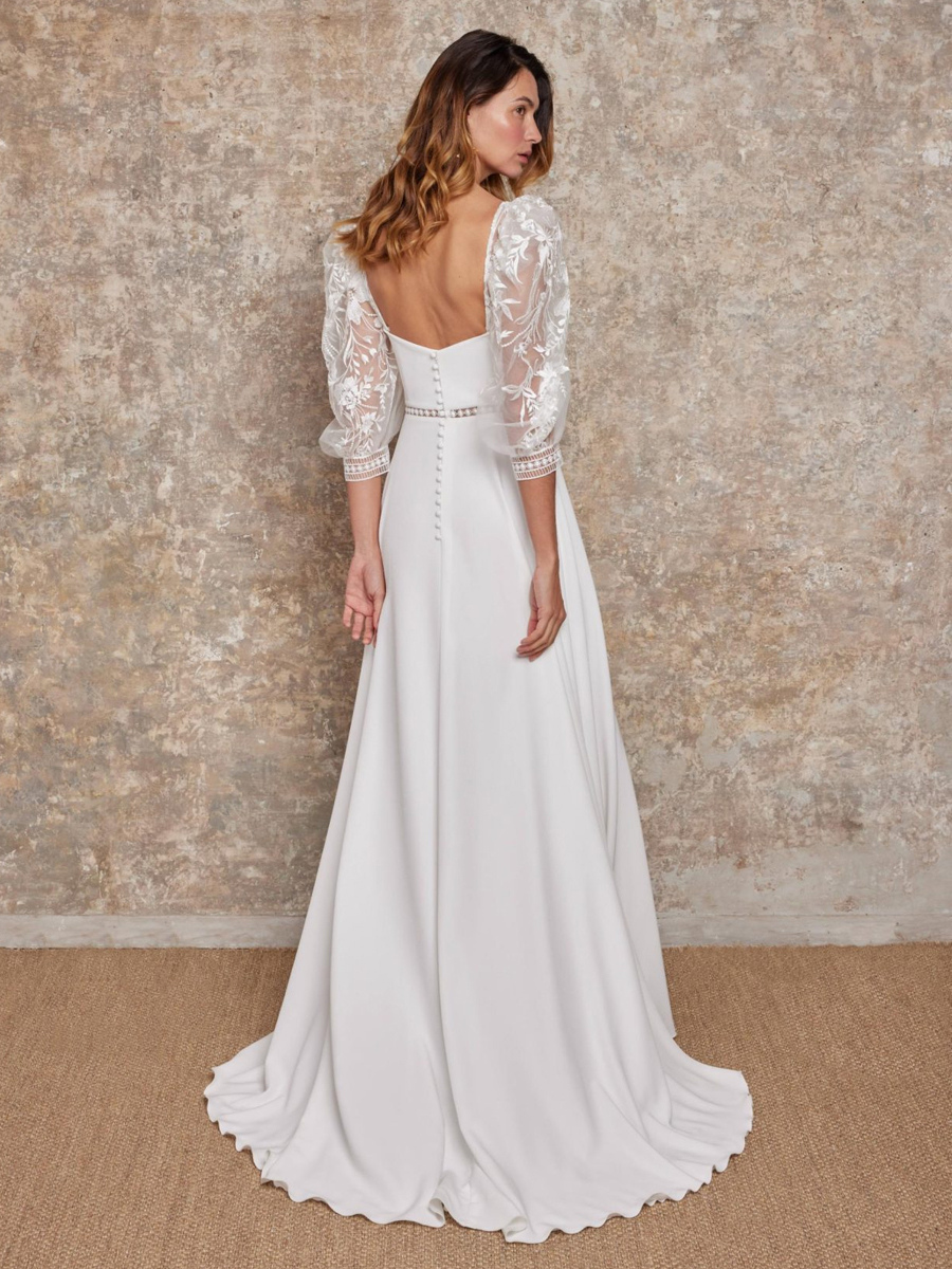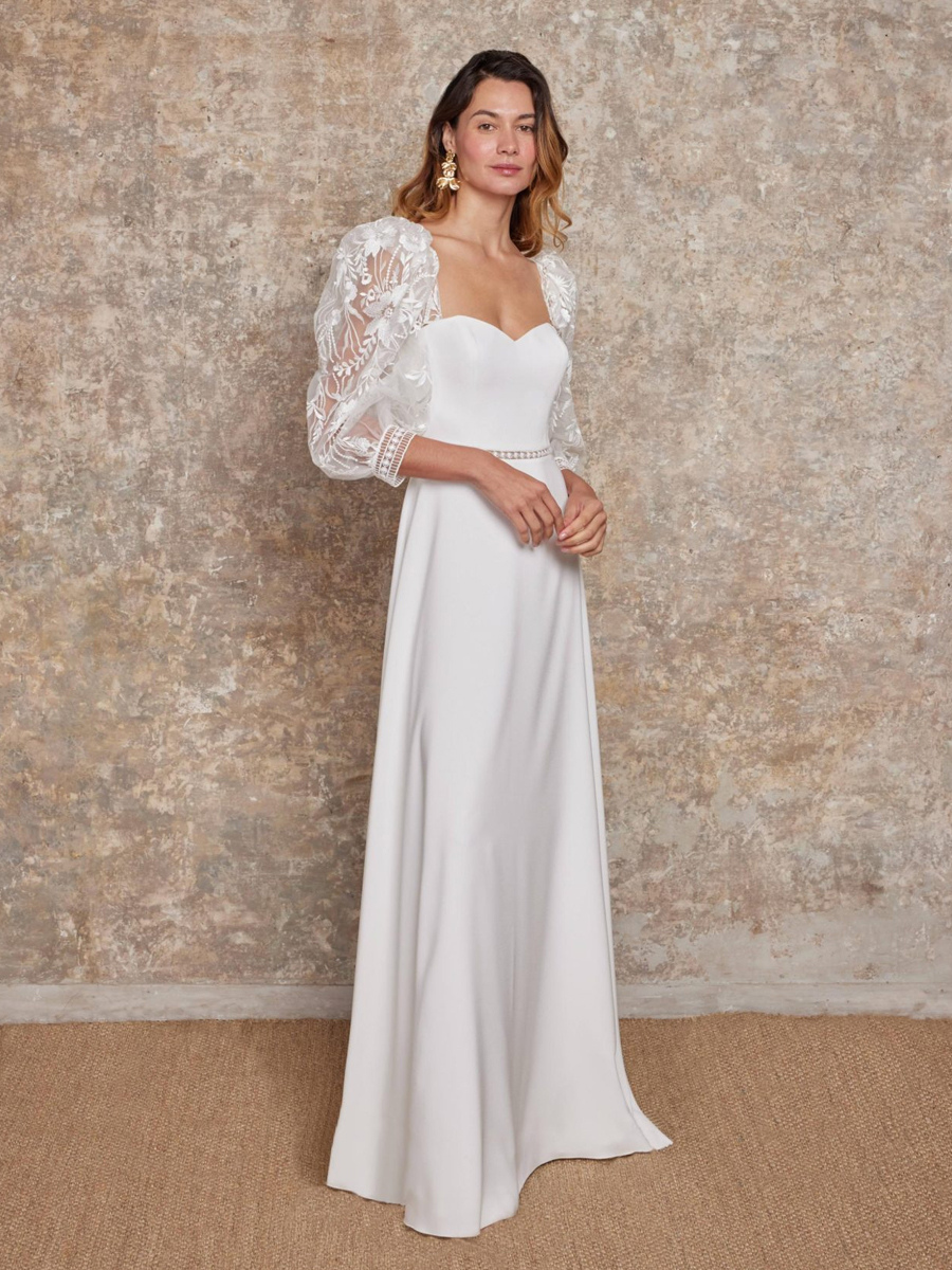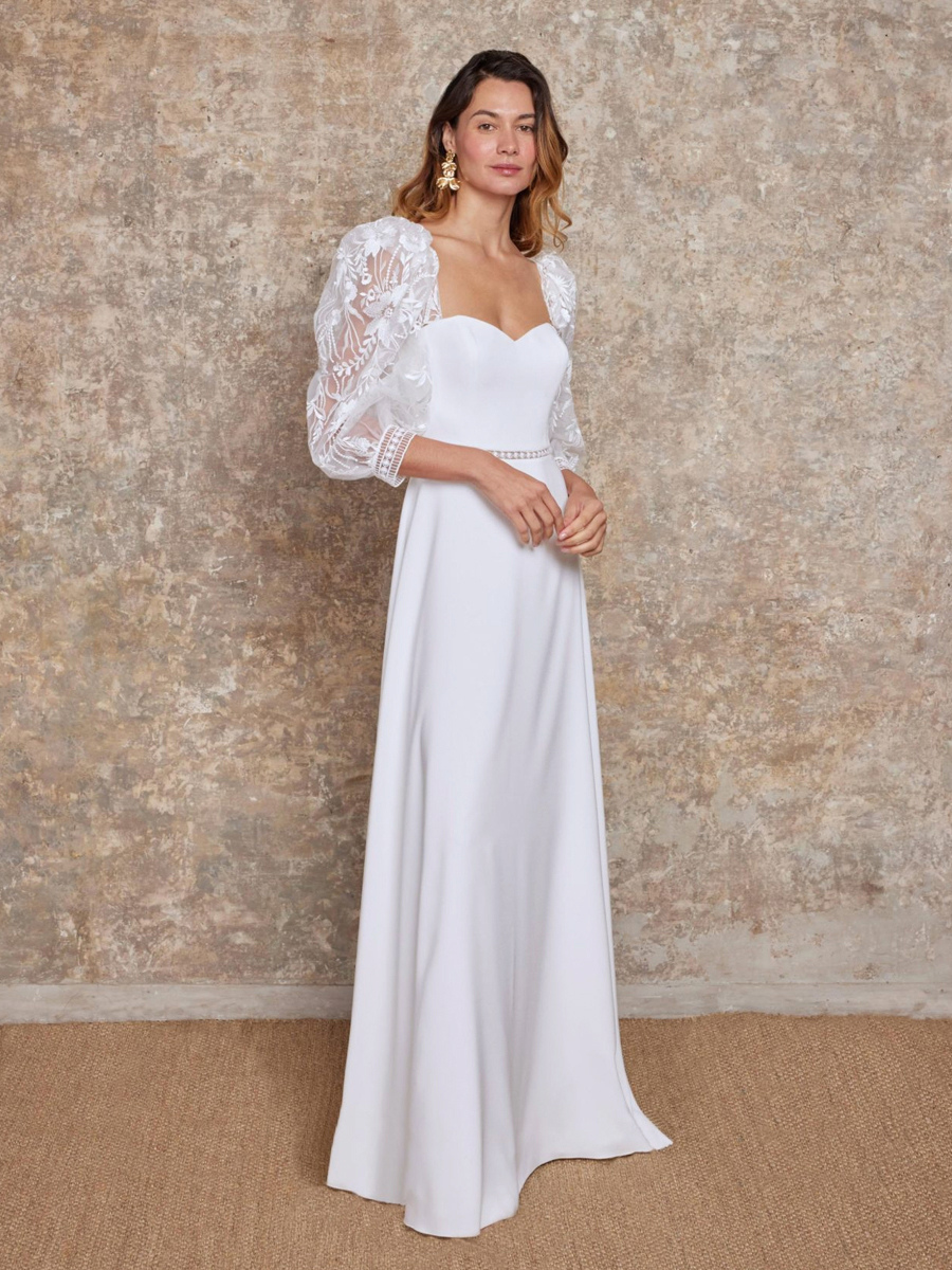 ボヘミアンウェディングドレス、Aライン、7分袖、サテン生地、スウィートハートネック、ブライダルガウン