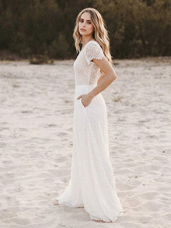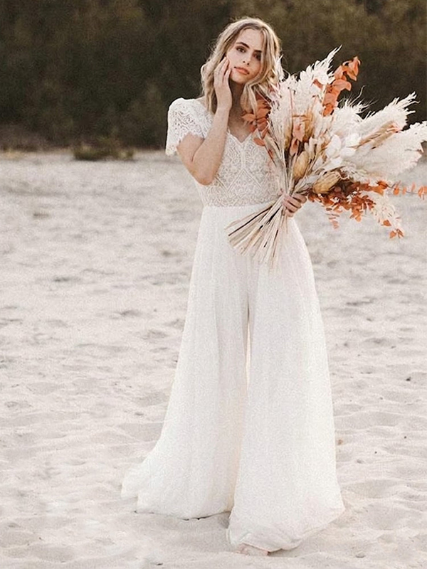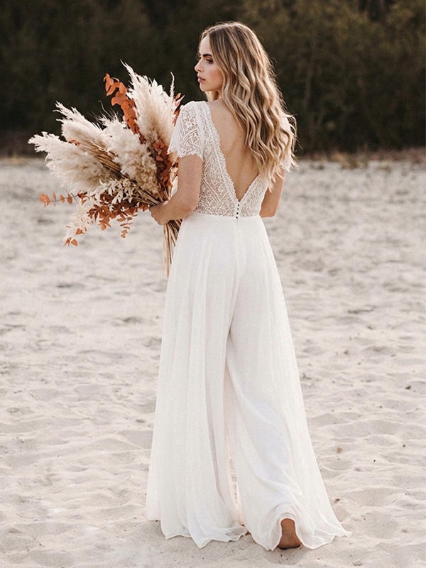 ブライダルジャンプスーツ シフォン カットアウト フロア丈ジャンプスーツ Vネック 半袖 ナチュラルウエスト アイボリー